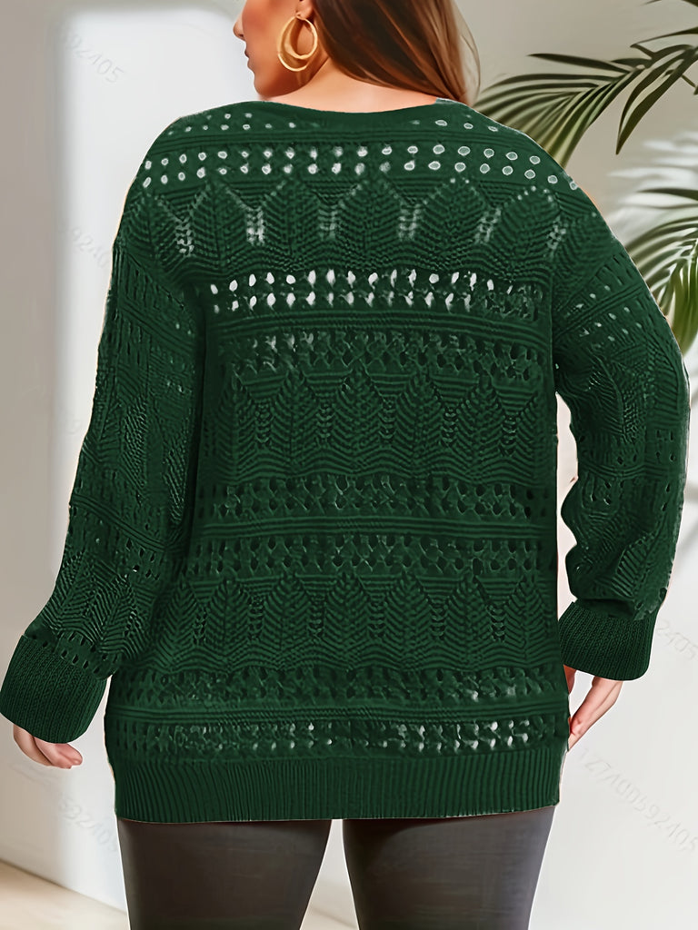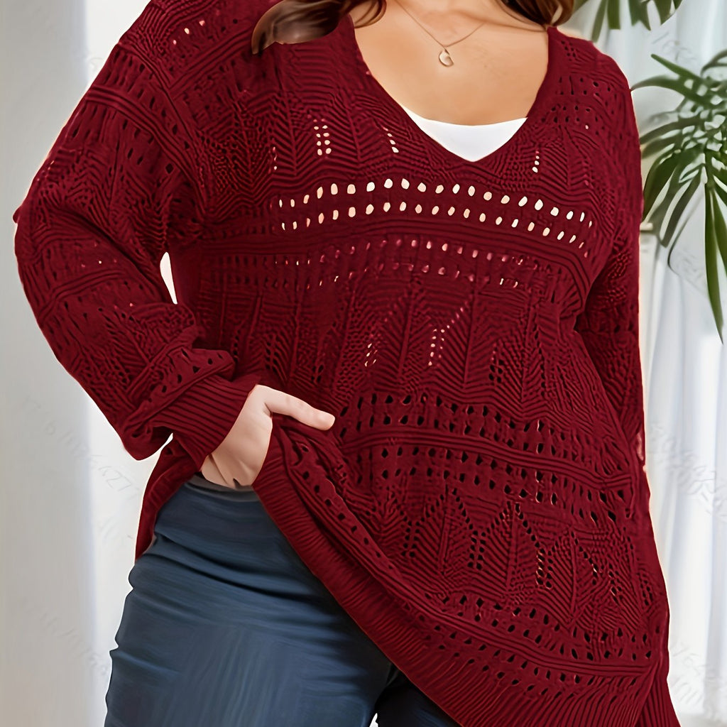 Chic Plus Size V-Neck Sweater – Breathable Hollow Out Design with Long Sleeves – Versatile Sheer Pullover for Everyday Wear