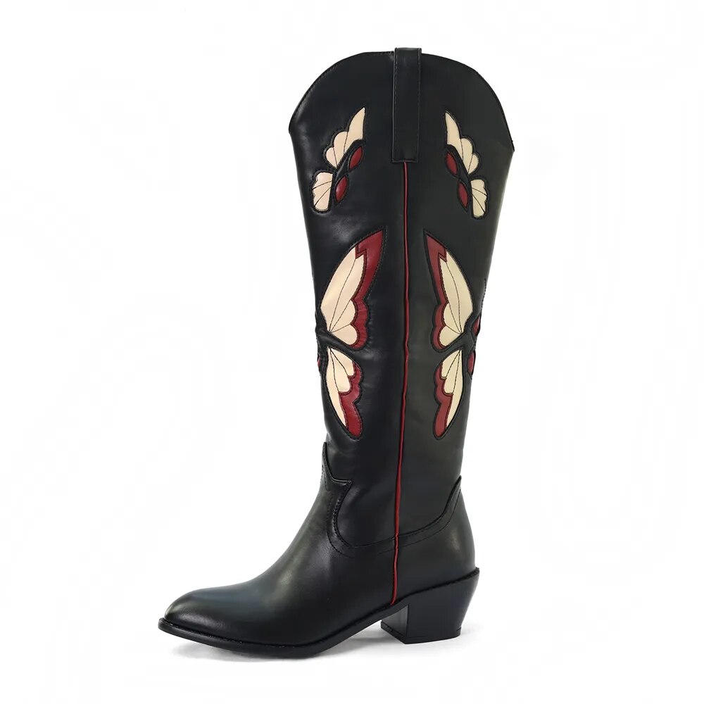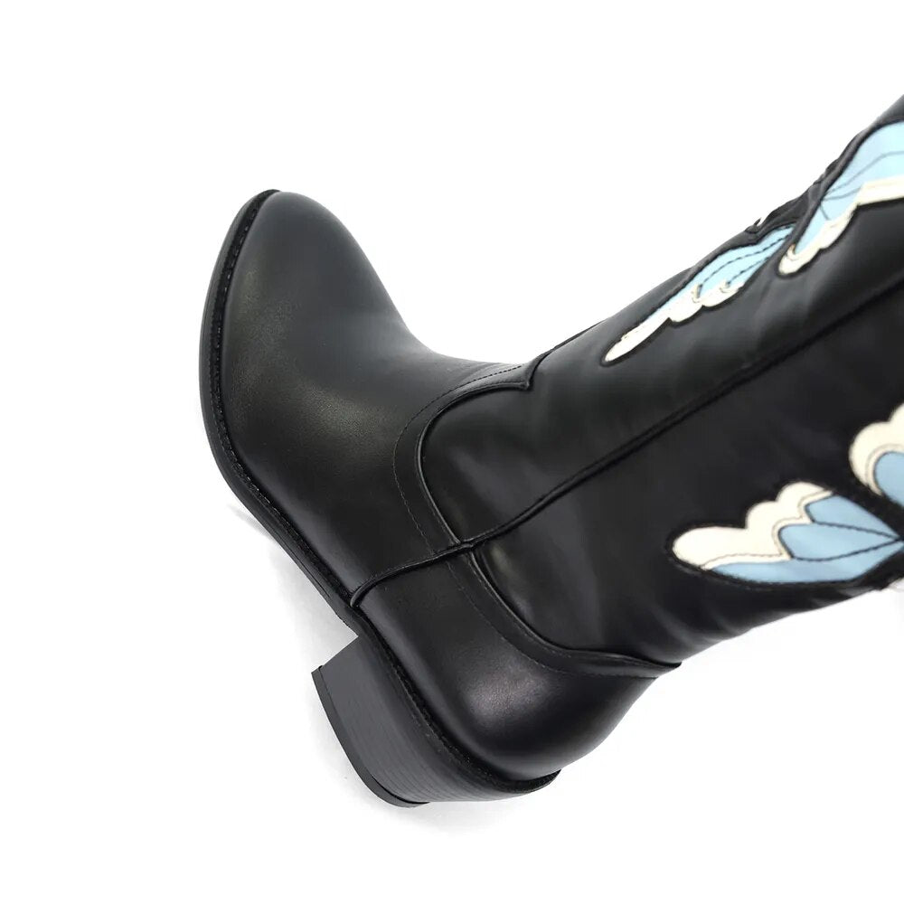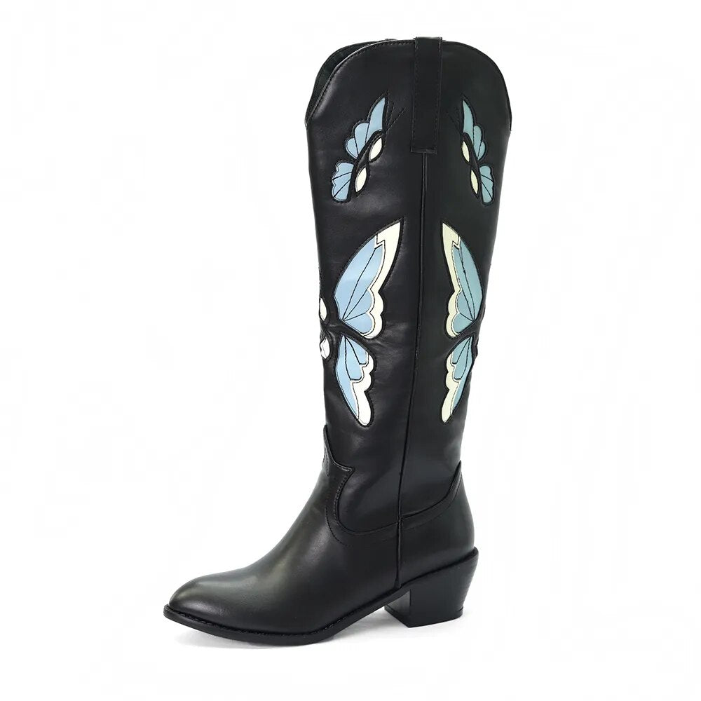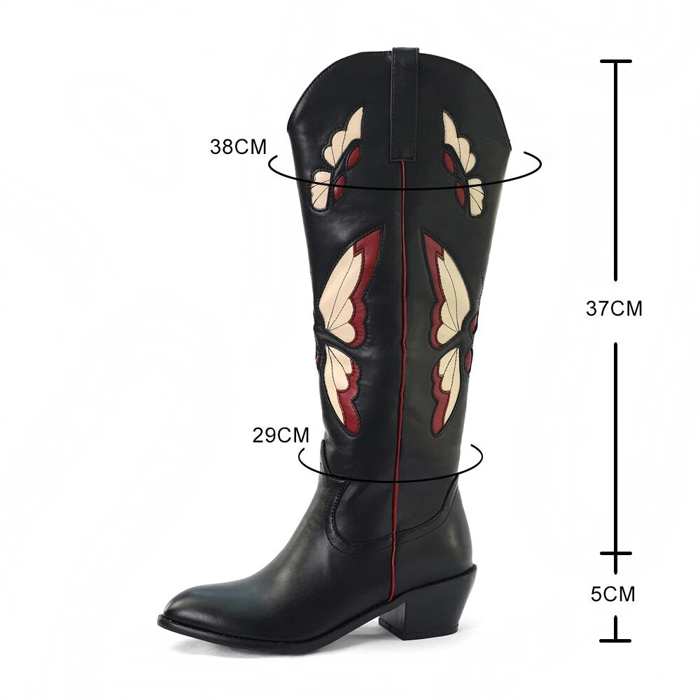Purpdrank - Female Butterfly Embroidery Knee High Boots For Women Cute Cowgirls Cowboy Chunky Heel Vintage Fashion Punk Western Boots Womens