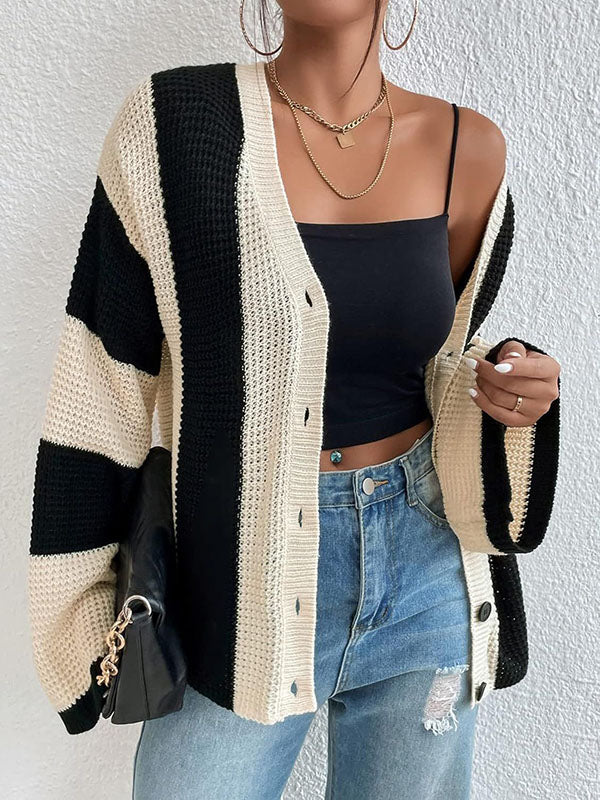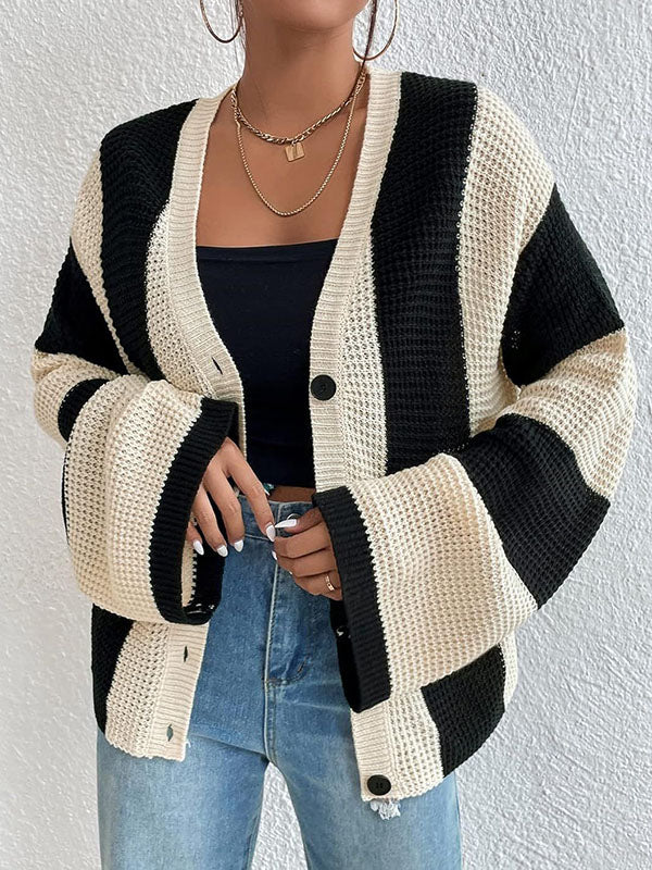 Purpdrank Flared Sleeves Long Sleeves Buttoned Contrast Color Striped V-Neck Cardigan Tops