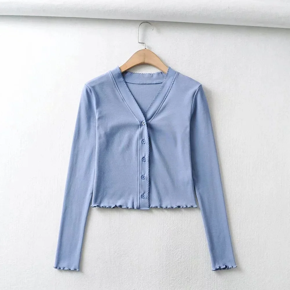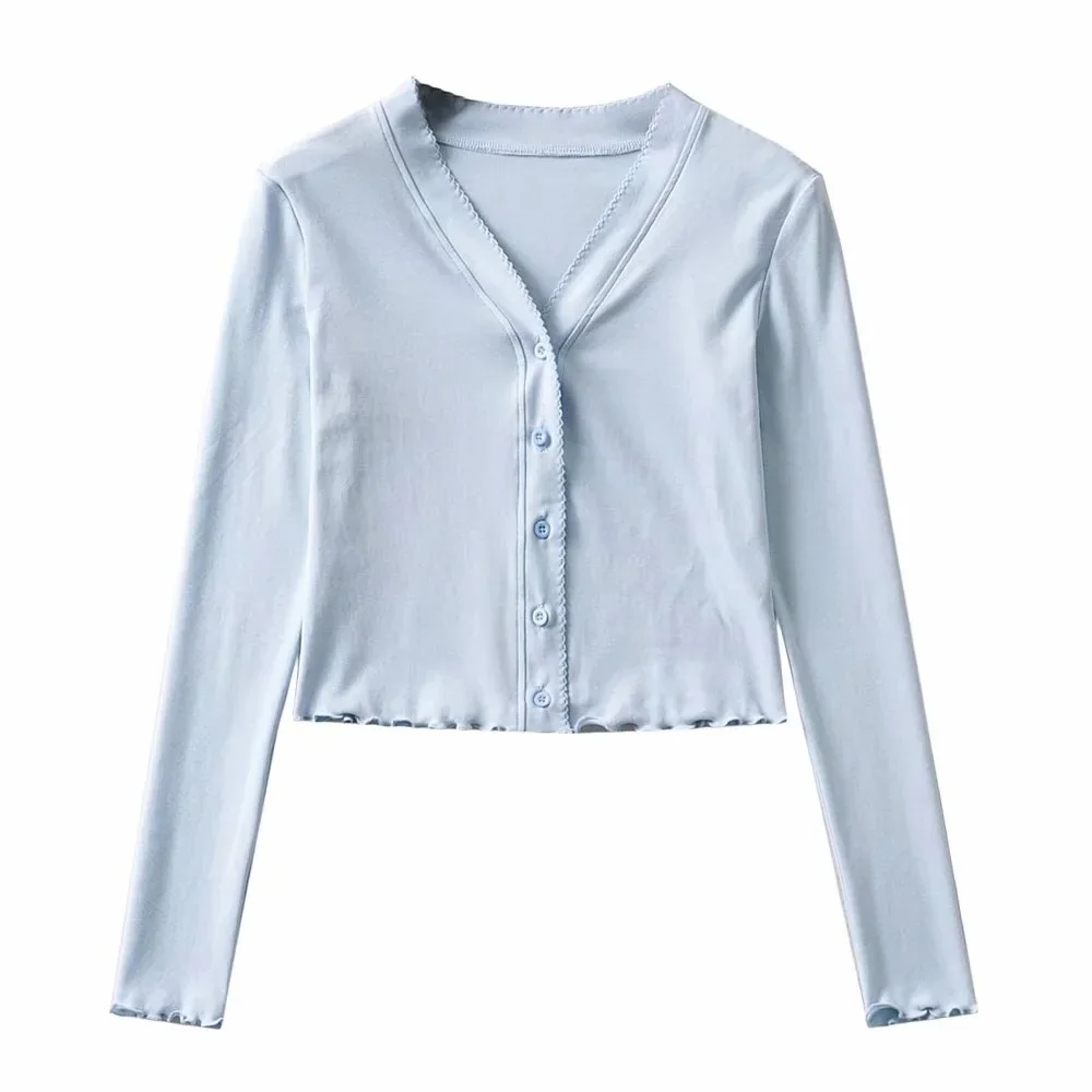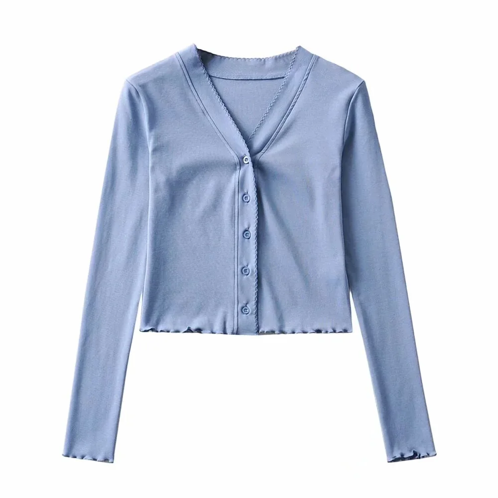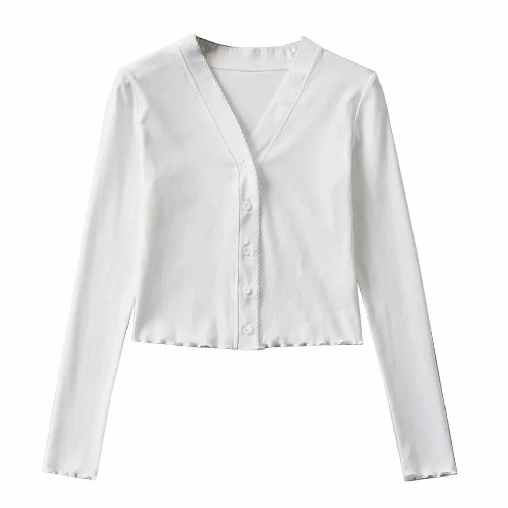 Purpdrank 70's Vintage V neck Wood ears Rib Long Sleeve Tee Base T-shirts Cool Girl Single-breasted Button Short Tee crop top