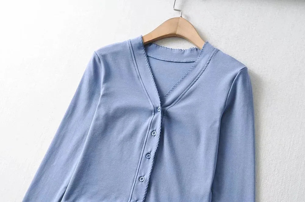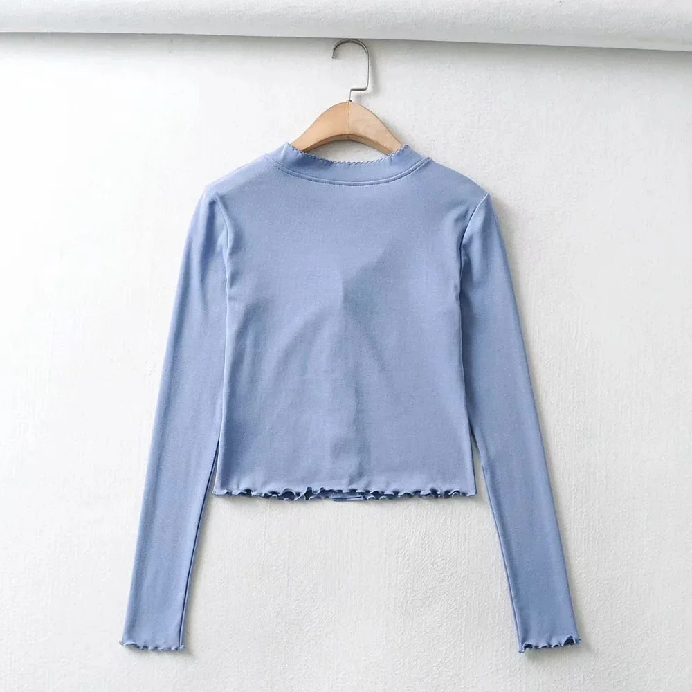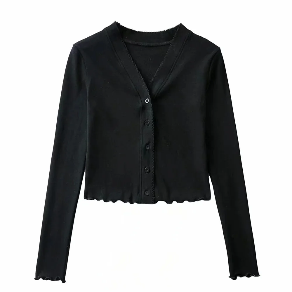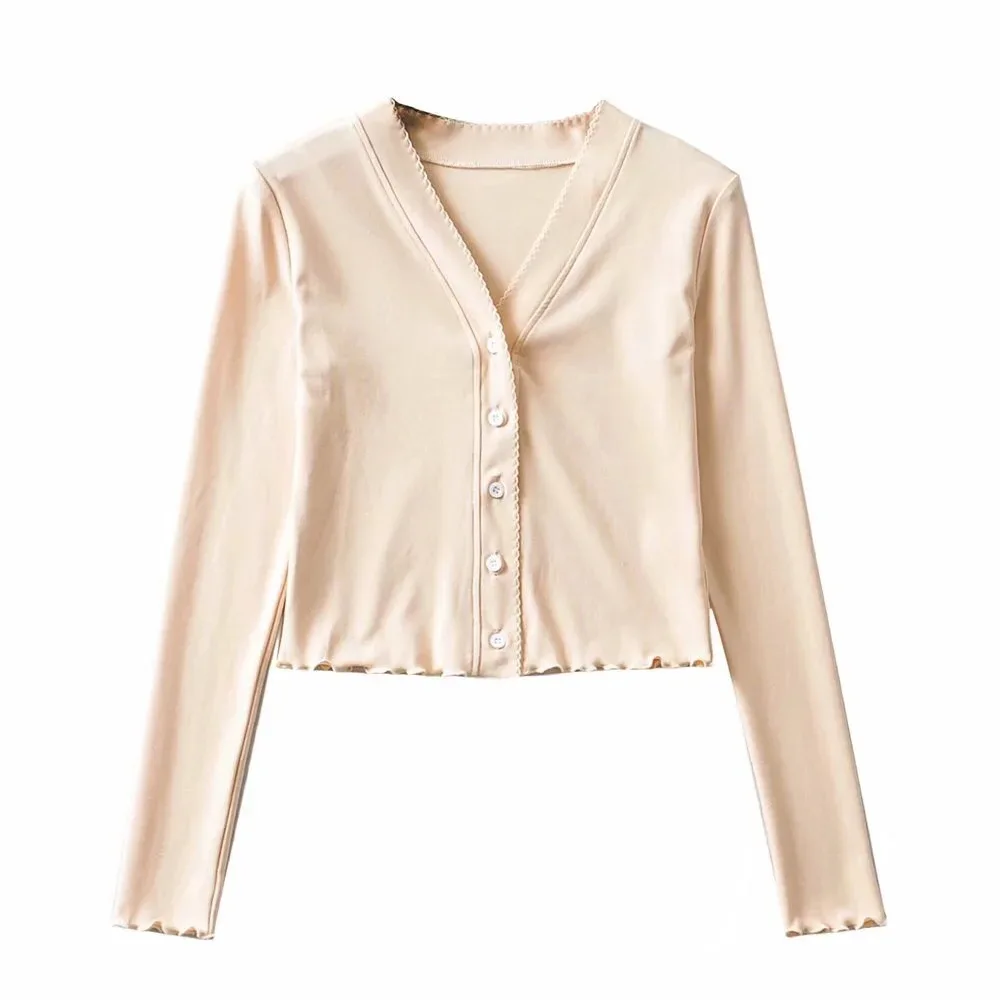 Purpdrank 70's Vintage V neck Wood ears Rib Long Sleeve Tee Base T-shirts Cool Girl Single-breasted Button Short Tee crop top