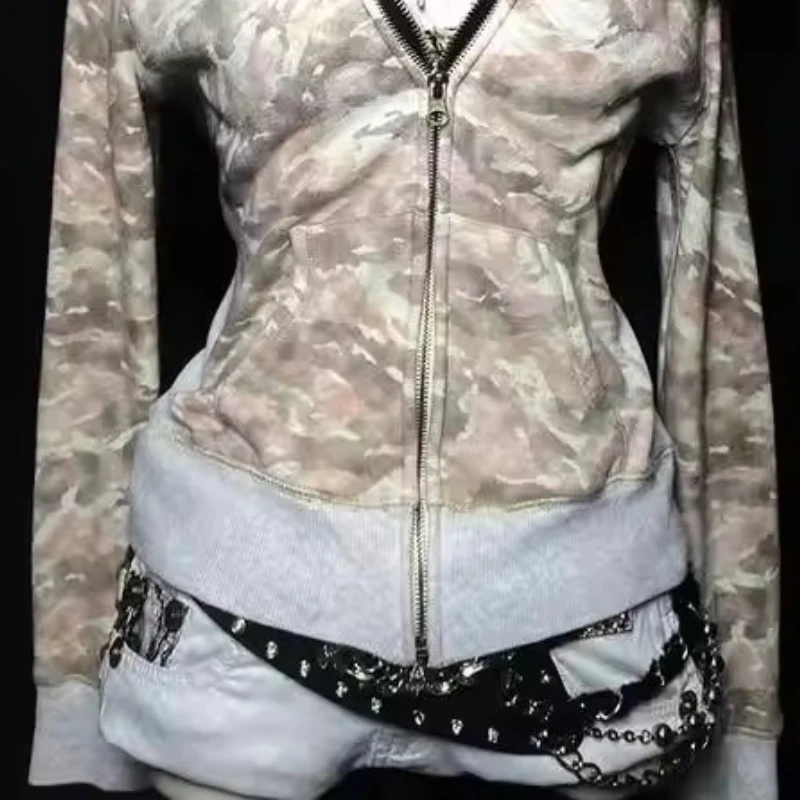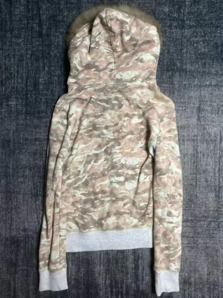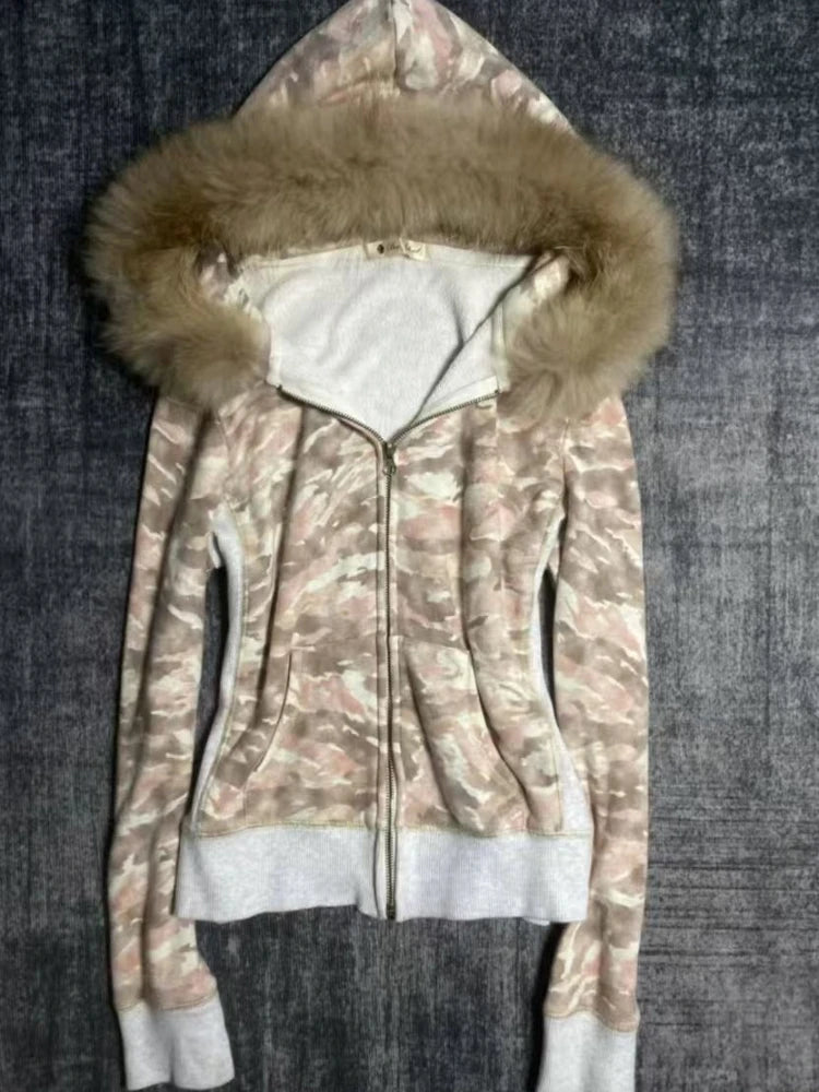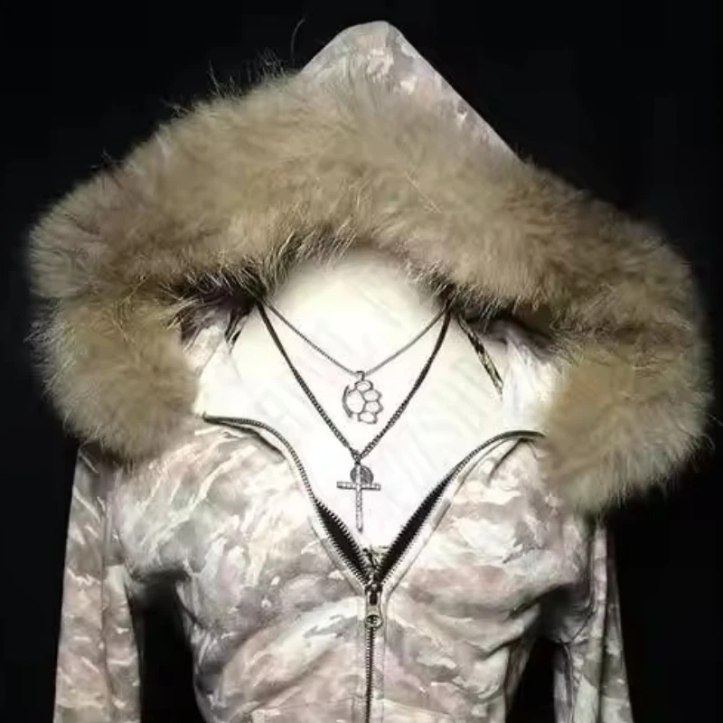 Purpdrank American Gothic Y2k Fur Collar Hooded Jacket Women High Street Vintage Zipper Camouflage Coat New Retro Fashion Punk Slim Outfit
