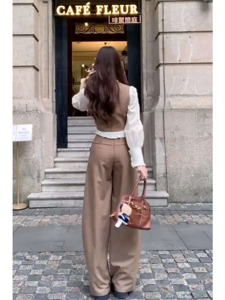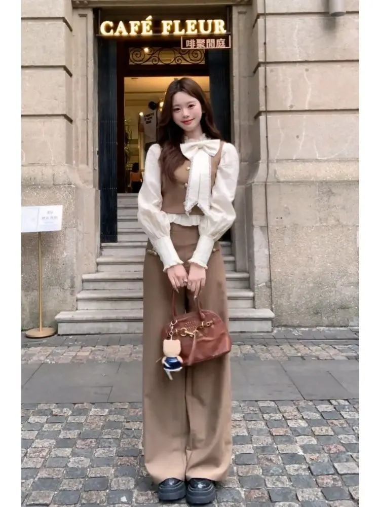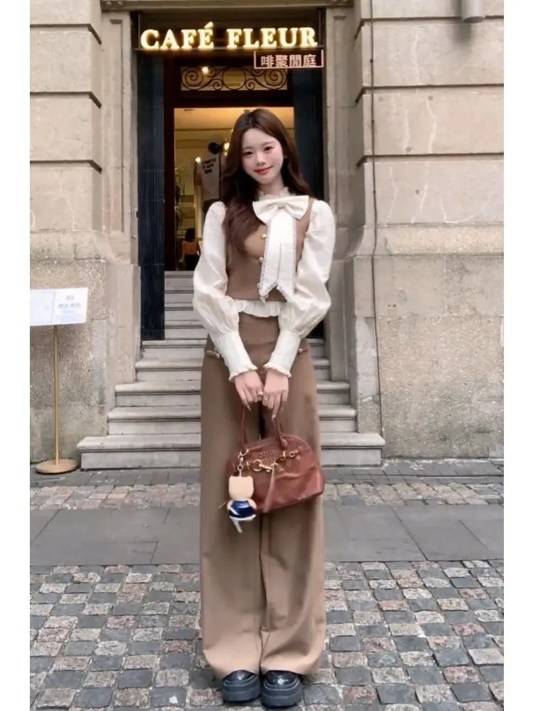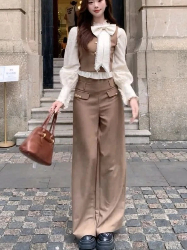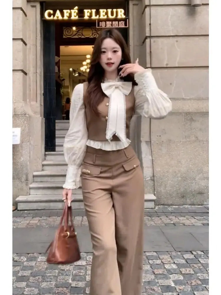 Purpdrank Autumn French Vintage Elegant Woman 3 Piece Set Bow Design Blouse+ Retro Vest +High Waist Casual Pants Female Korean Popular