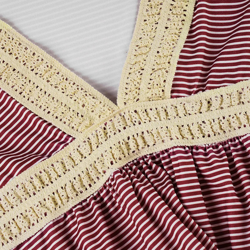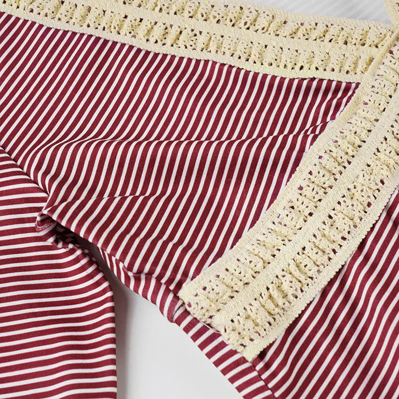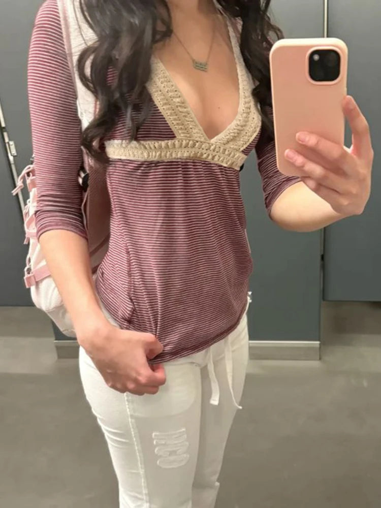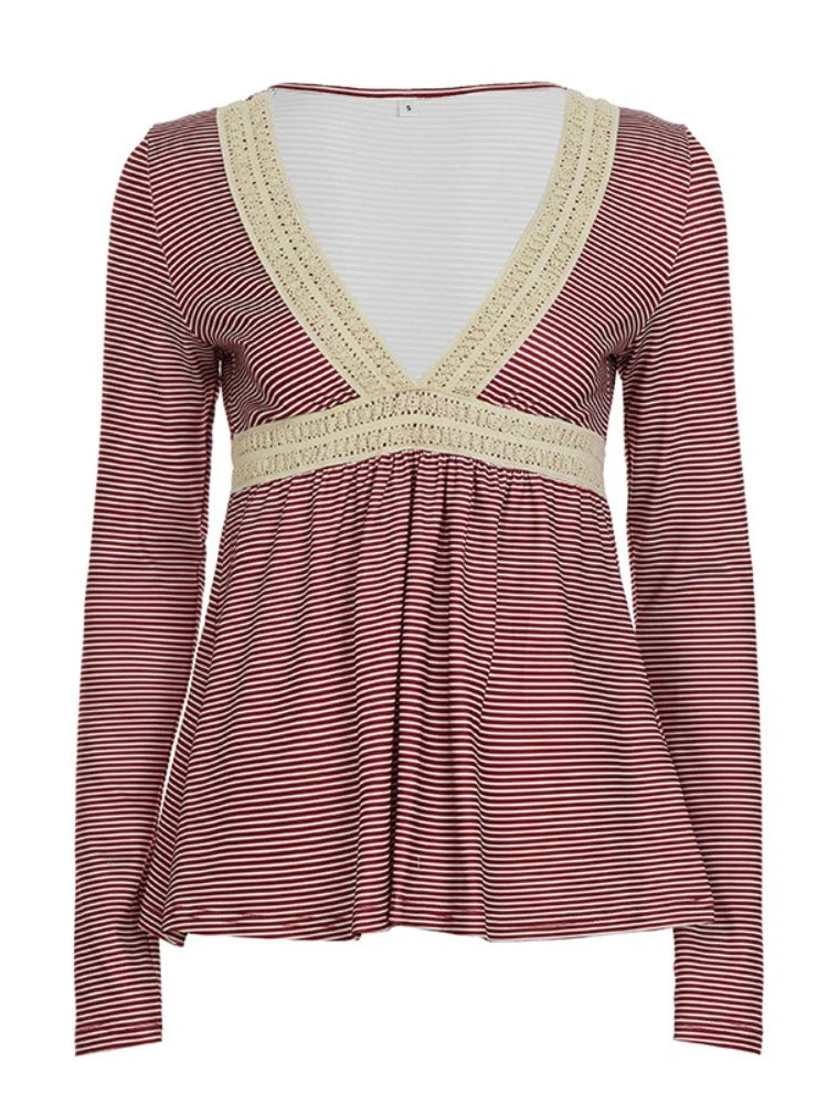 Purpdrank Autumn Sweet Lace Patchwork V Neck Long Sleeve Slim Striped T-Shirts