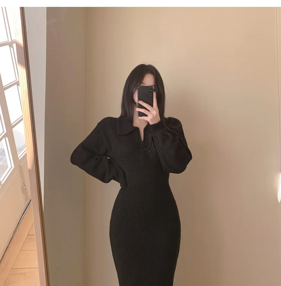 Purpdrank Autumn Winter Vintage Korean Long Sleeve Knitted Sweater Dresses Woman Zipper Lapel Elegant Warm Midi Bodycon Dresses Robe