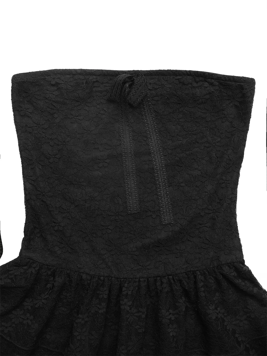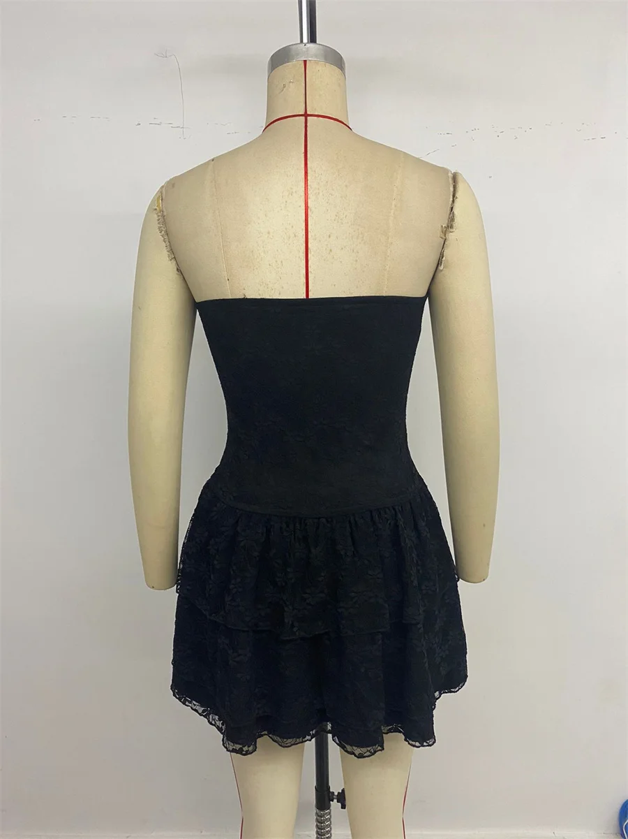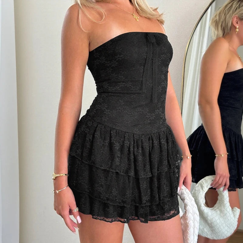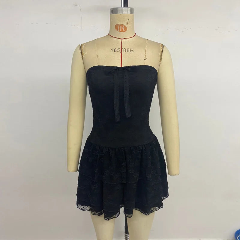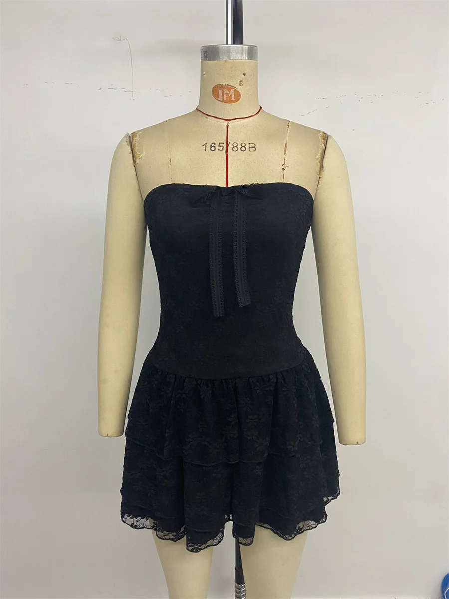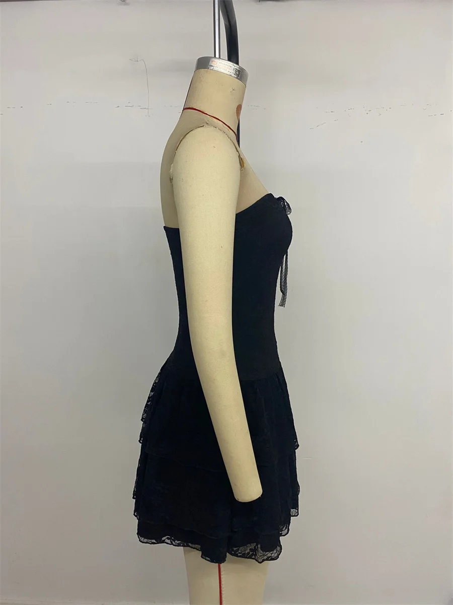 Purpdrank Black Knot Front Sexy Tube Dress Women's Summer 2025 New Elegant Cute Style Layered Ruffle Hem Short Dresses