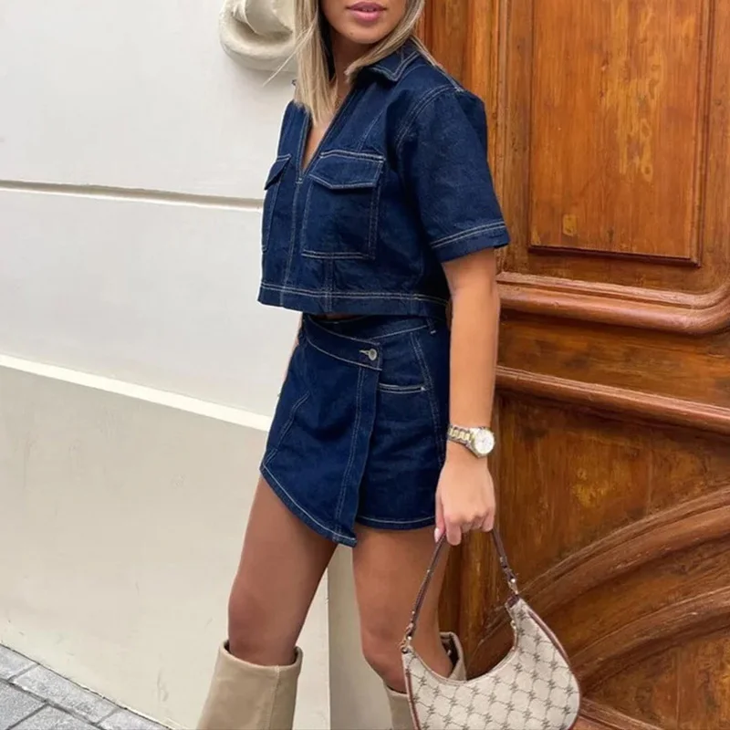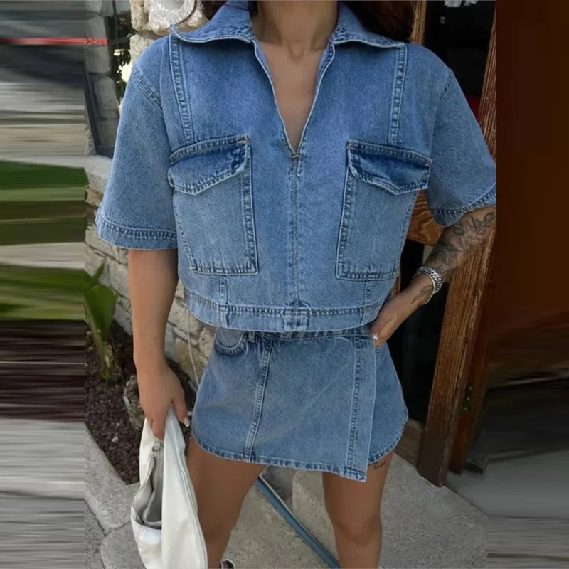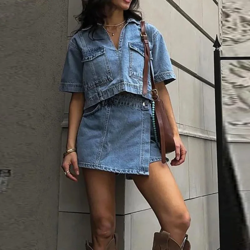 Purpdrank Casual Solid Pocket Commuting Outfits Summer Women's V Neck Top with Shorts Two Piece Vintage Street High Waist Denim Suit