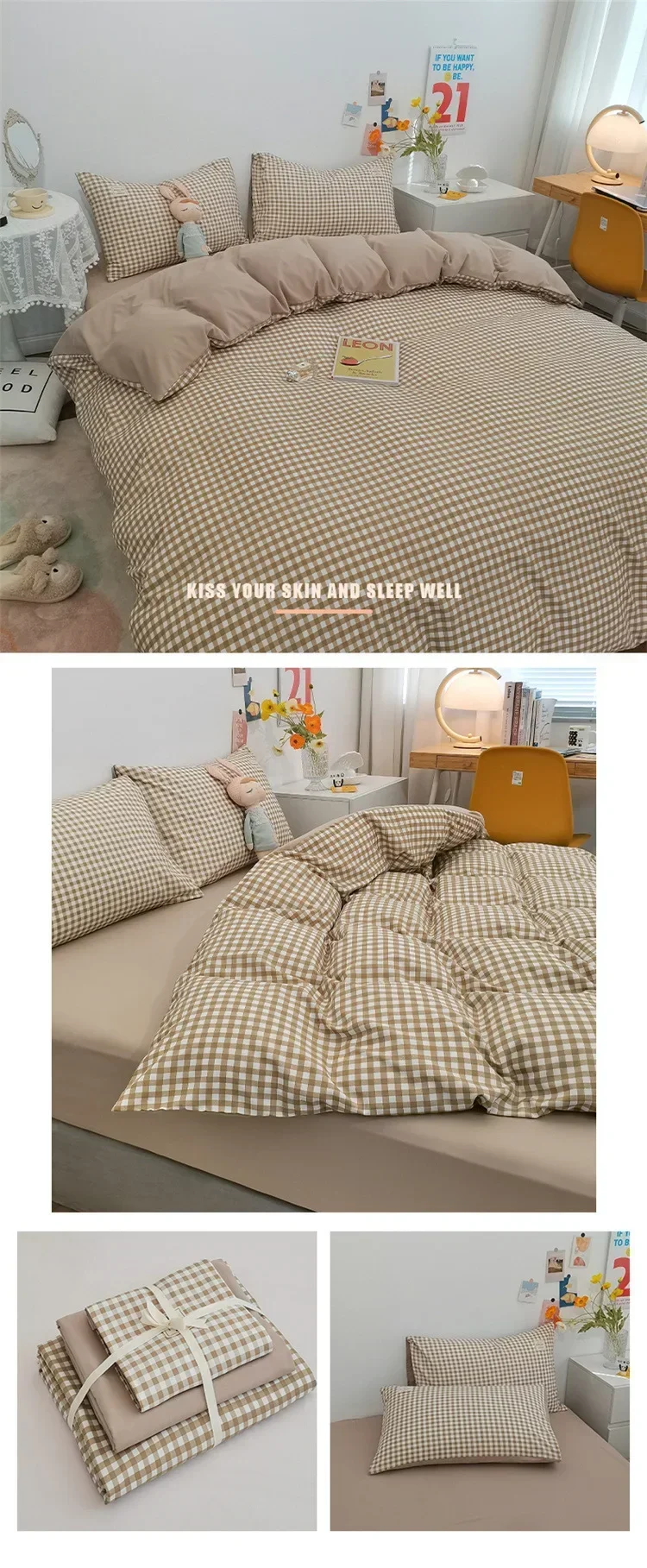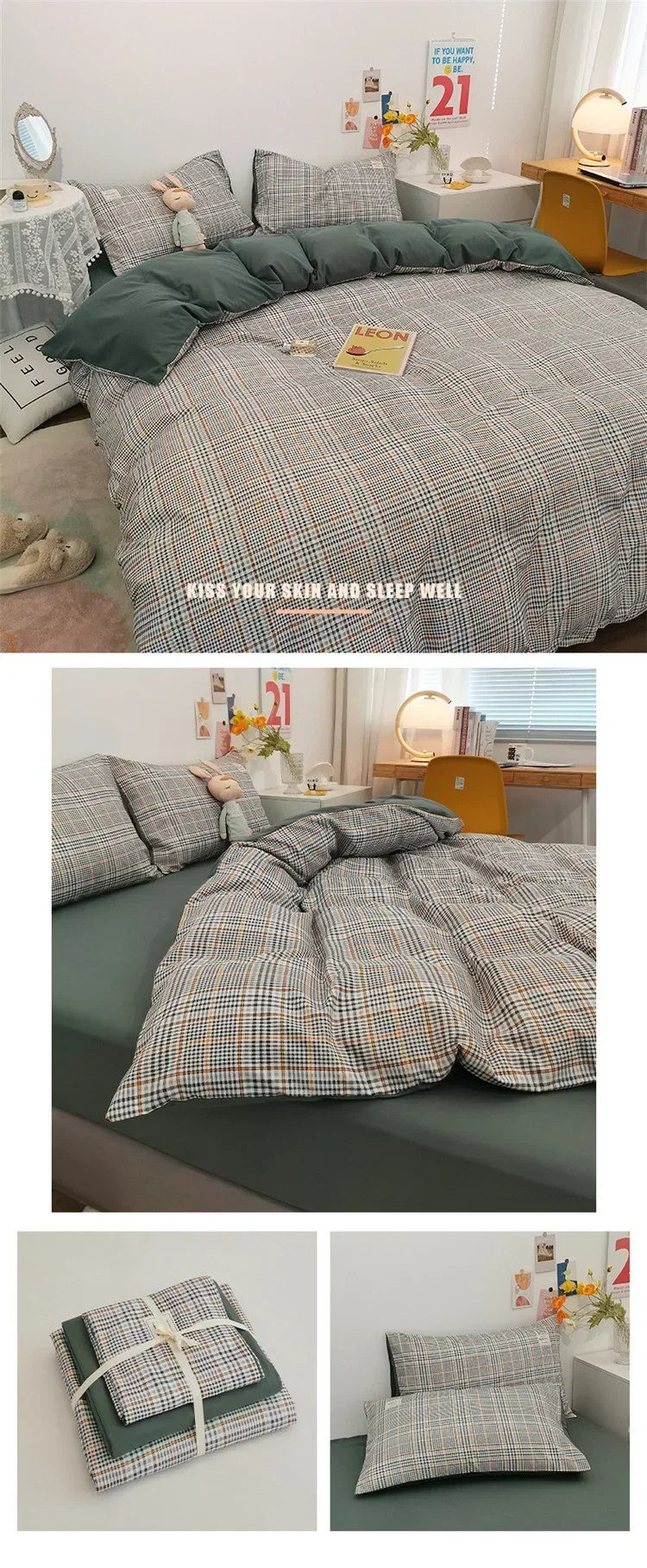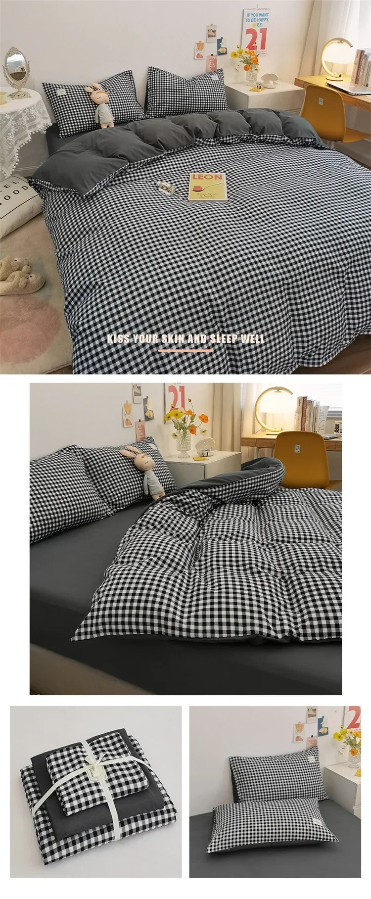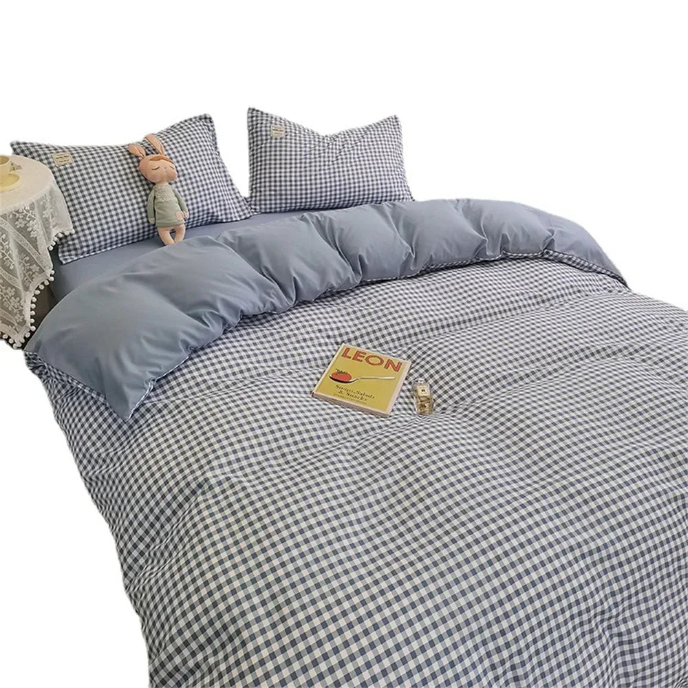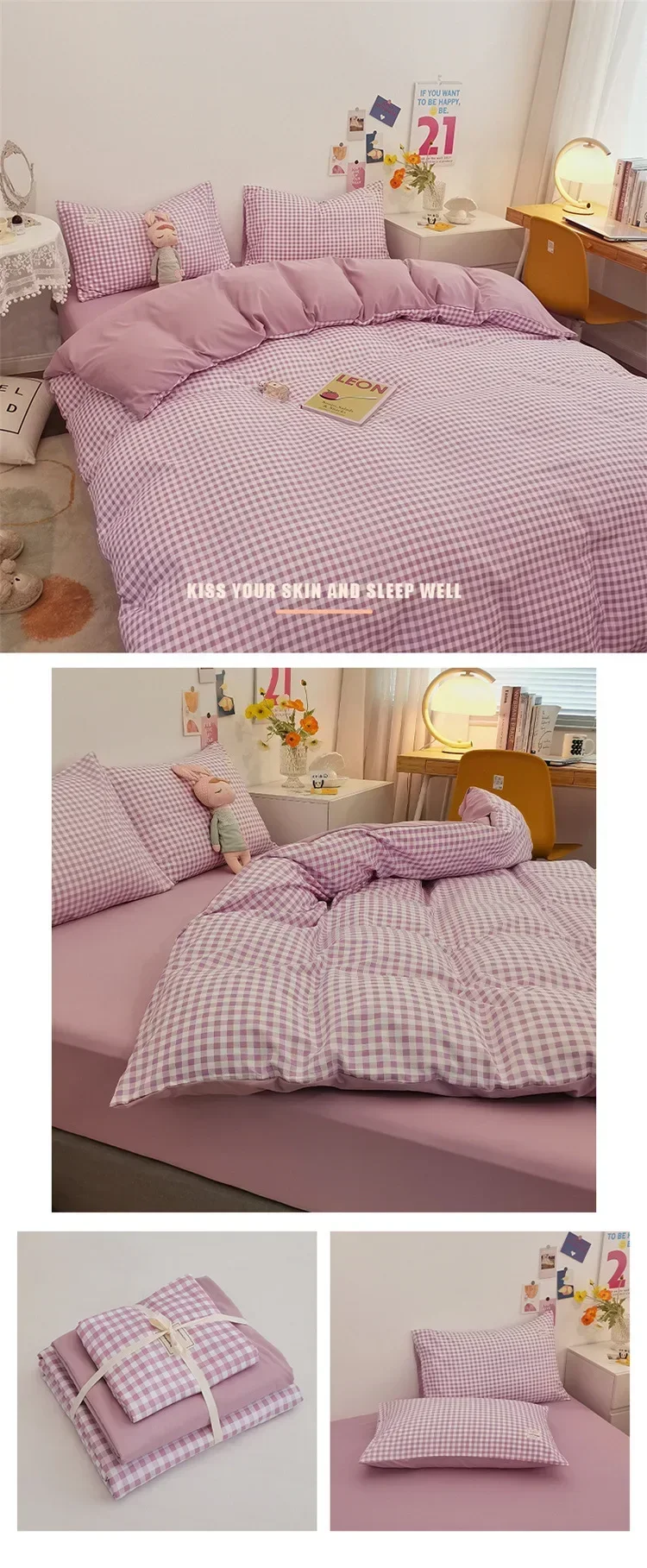 Purpdrank Checkered washed cotton 4-piece bed sheet set, 4-piece simple quilt set, student dormitory bedding set