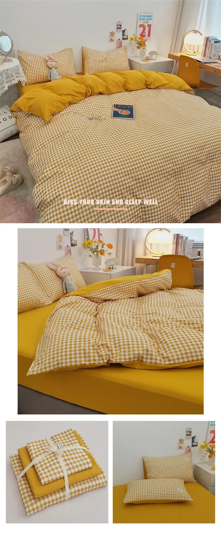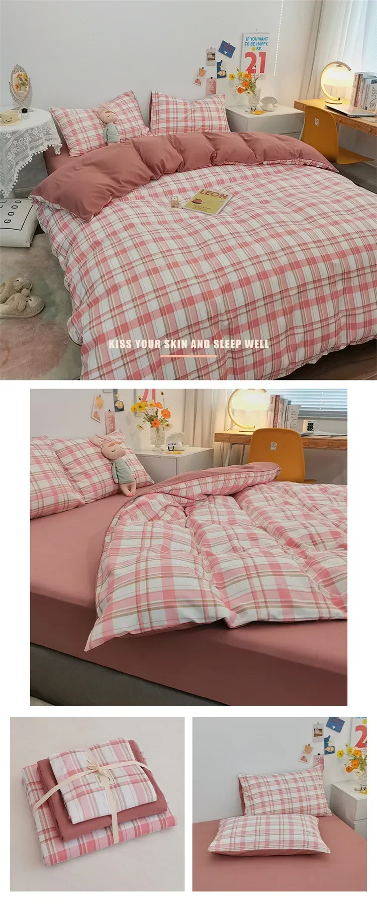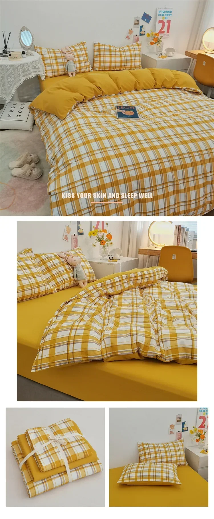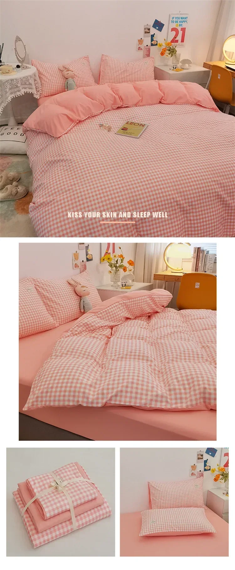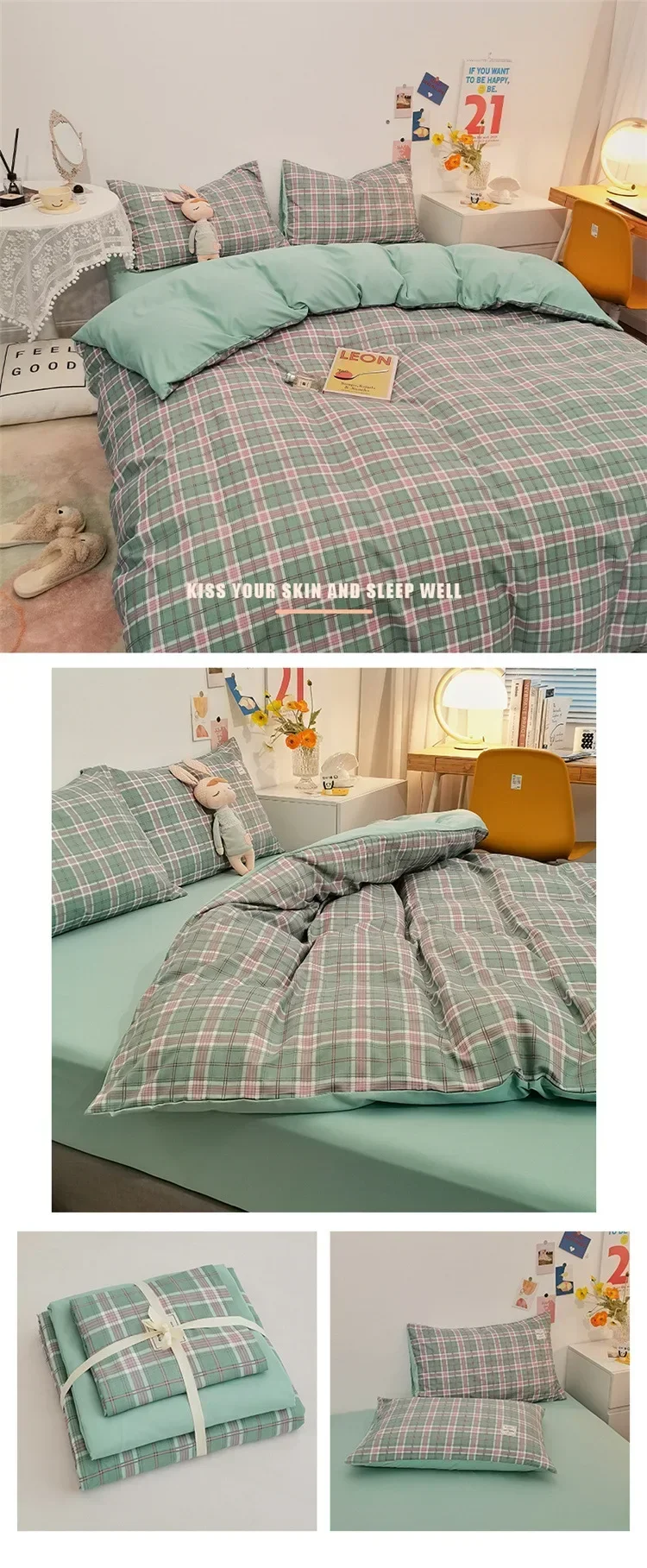 Purpdrank Checkered washed cotton 4-piece bed sheet set, 4-piece simple quilt set, student dormitory bedding set