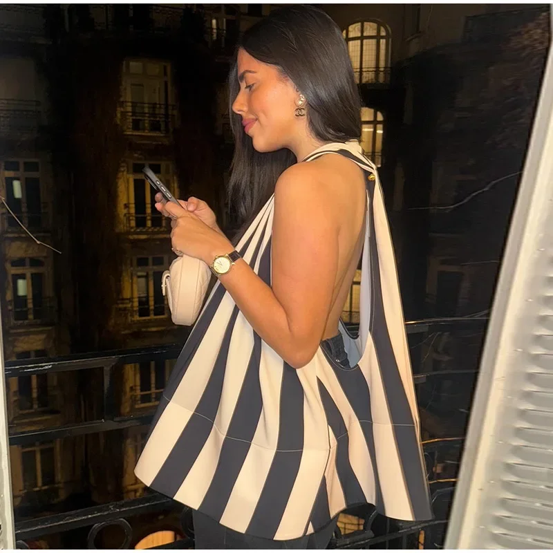 Purpdrank Chic V-neck Backless A-line Stripe Loose Vests Fashion Women Sleeveless Top 2025 Casual Holiday Female Halter Tops High Street