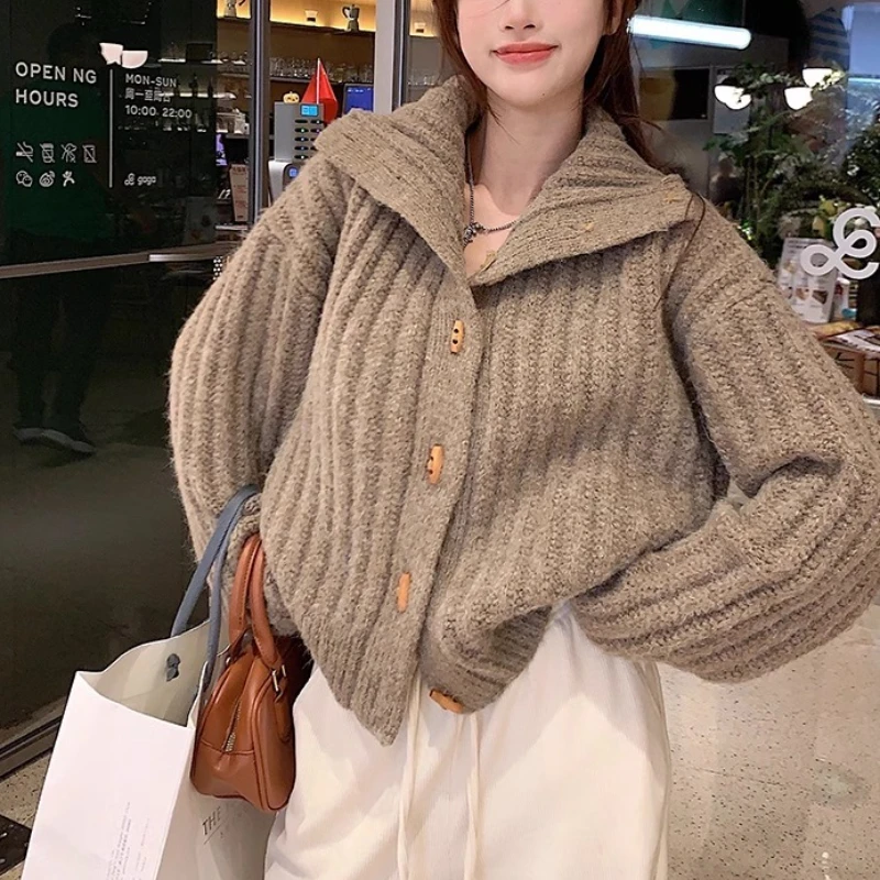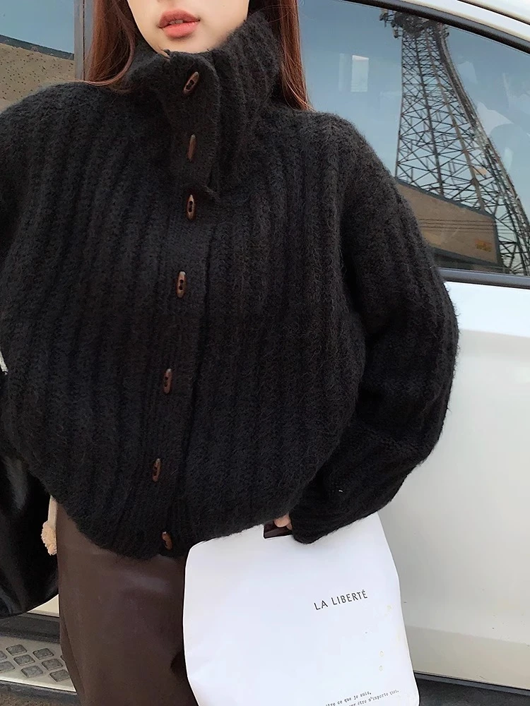 Purpdrank  Chunky Knit Cardigan with Toggles High Neck Button-down Sweater Jacket Women Autumn Winter Warm Knitwear Vintage Outfit