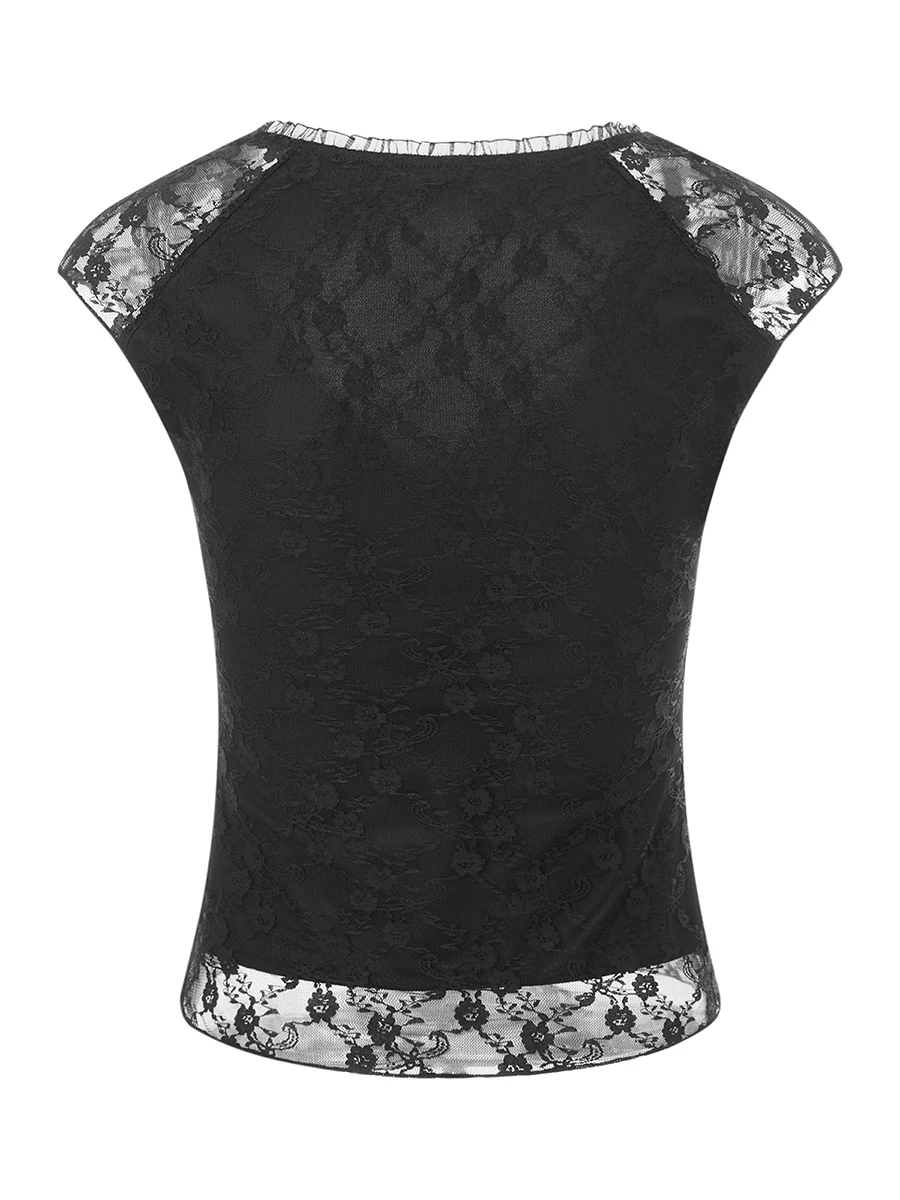 Purpdrank Coquette Lace Shirt y2k Clothes Women Solid Color V Neck Cap Sleeve Crop Top with Bow Decor Sweet Aesthetic Clothes