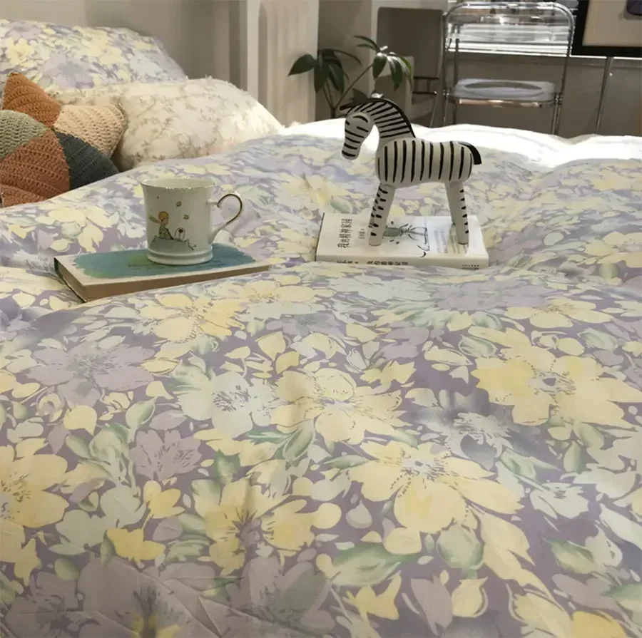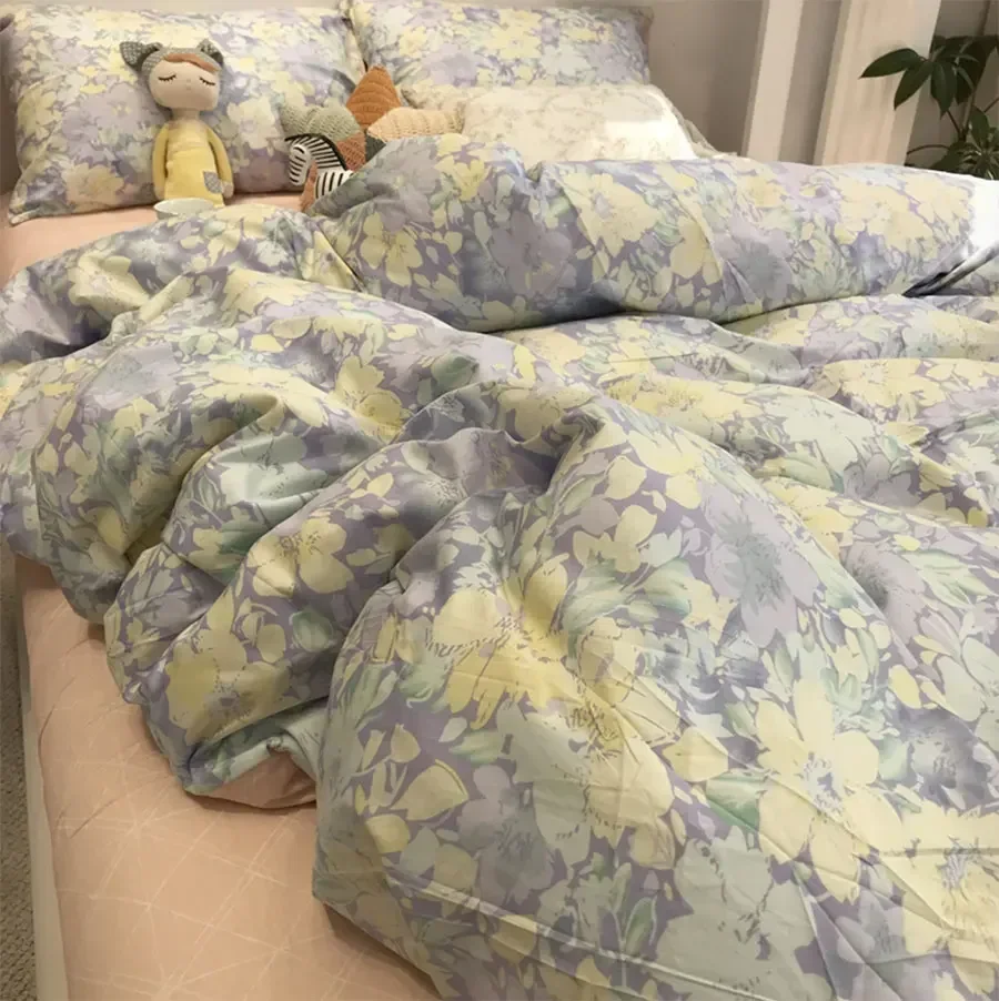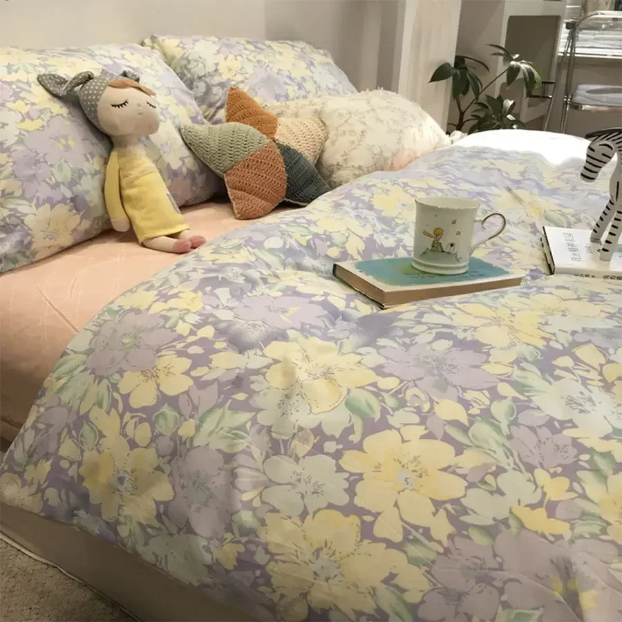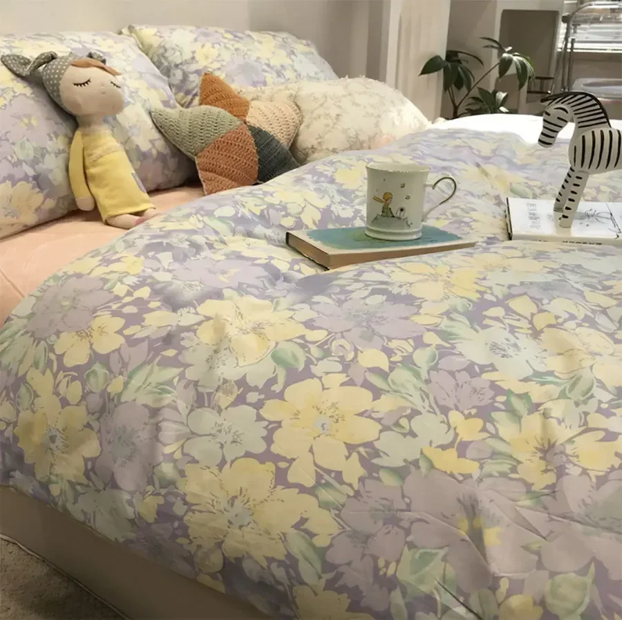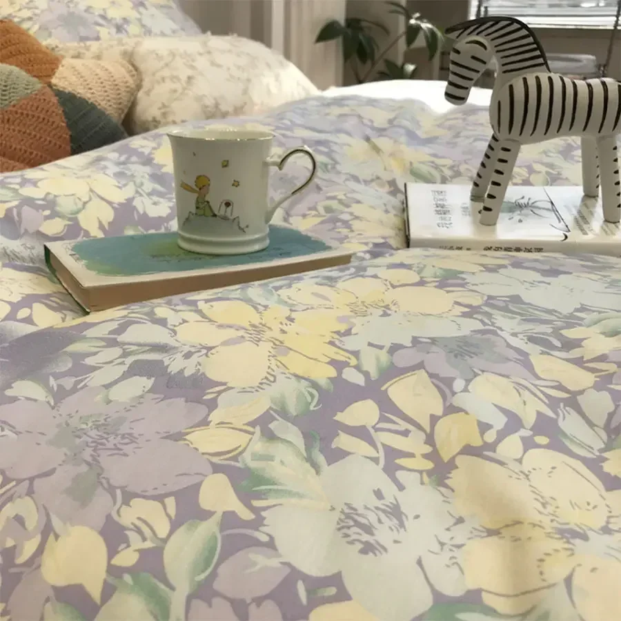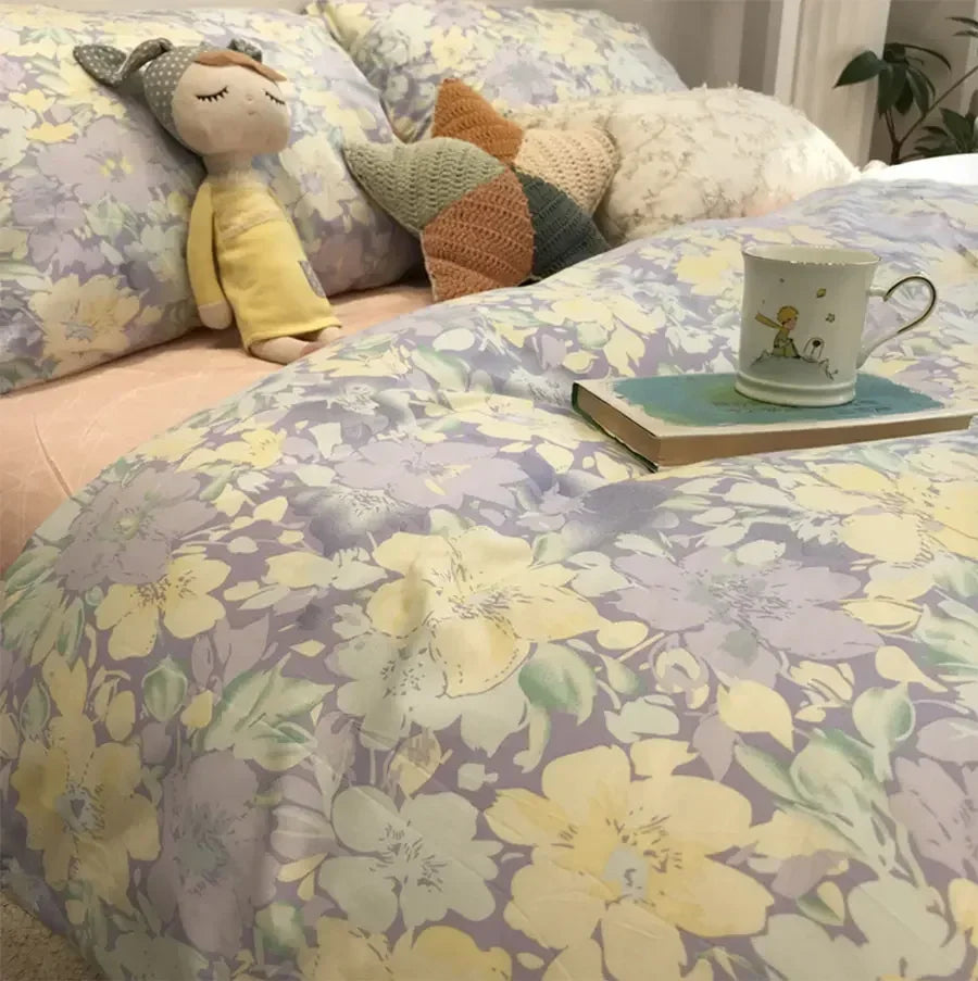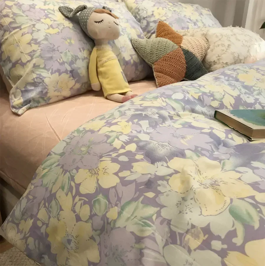 Purpdrank Cute rustic french floral bedding set,purple yellow cotton twin full queen king home textile flat sheet pillow case duvet cover