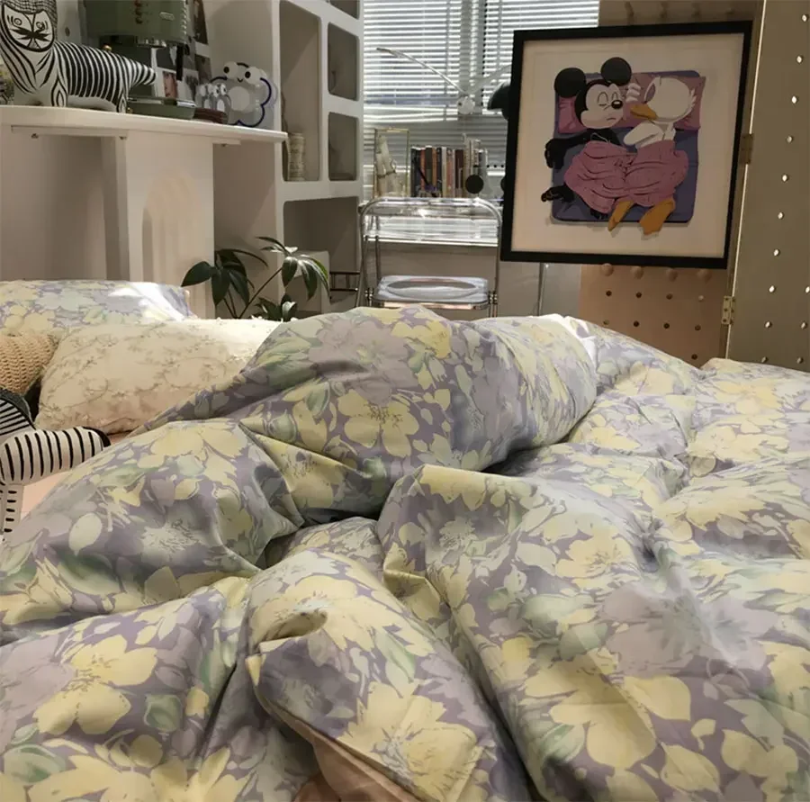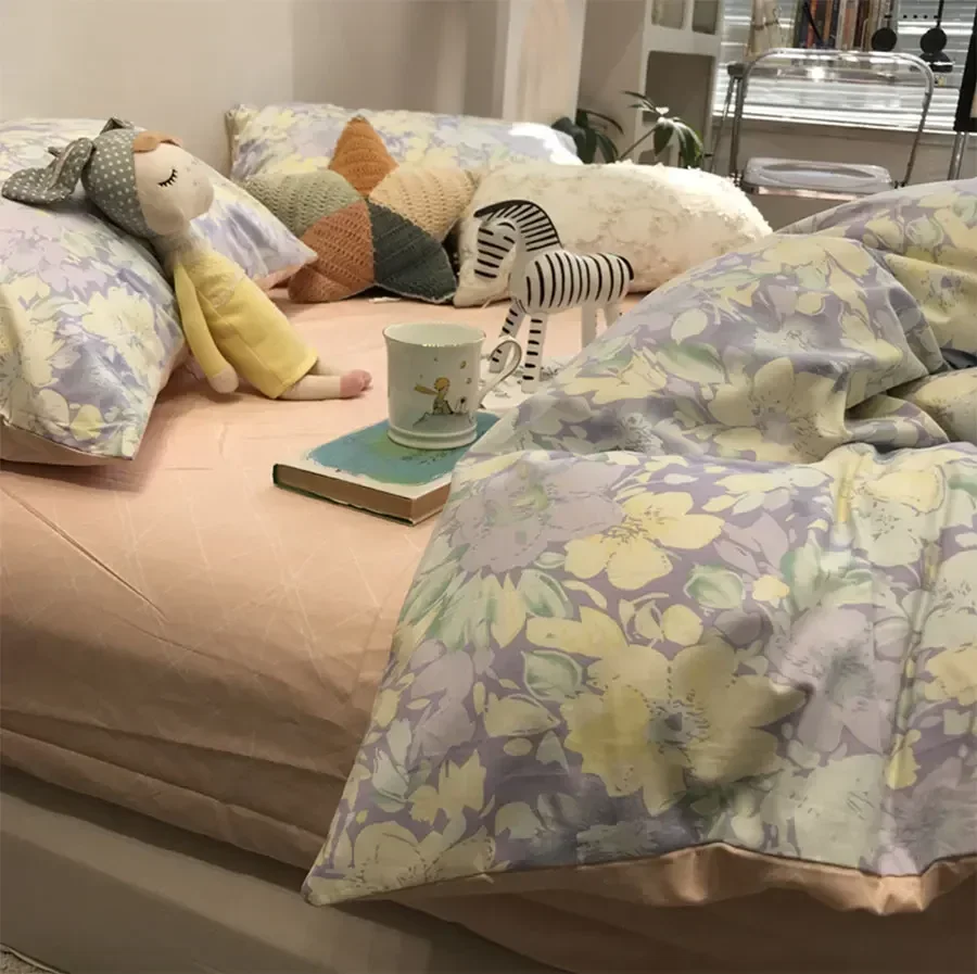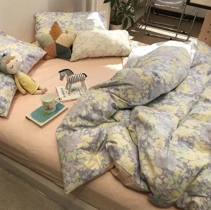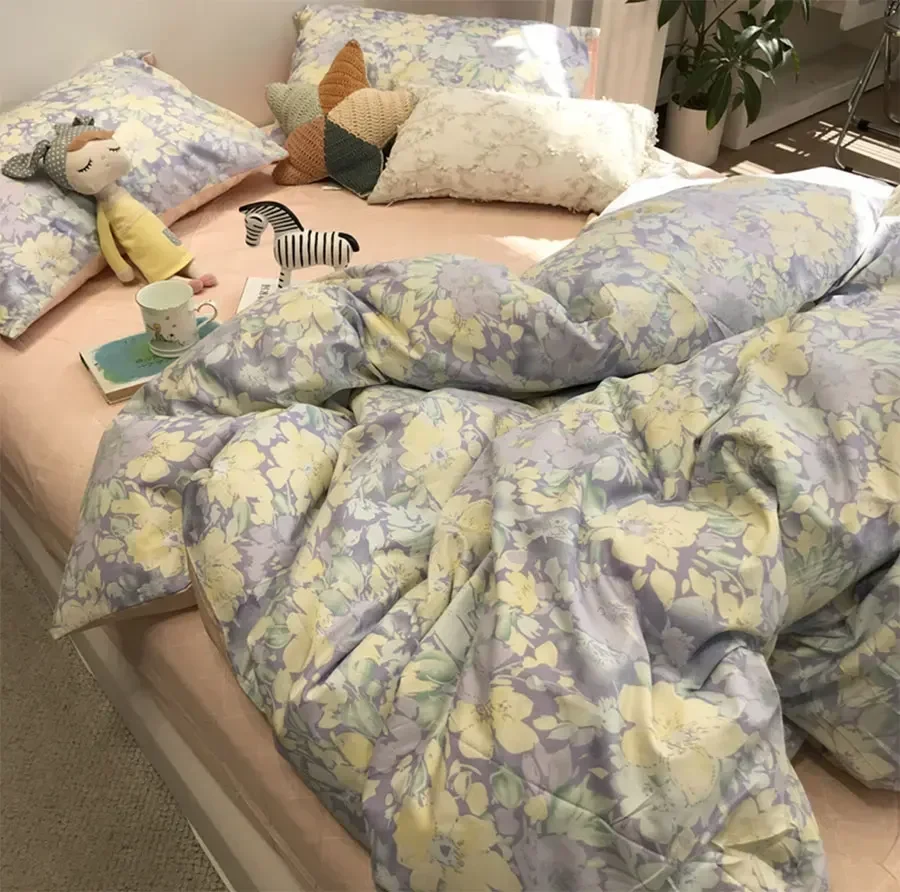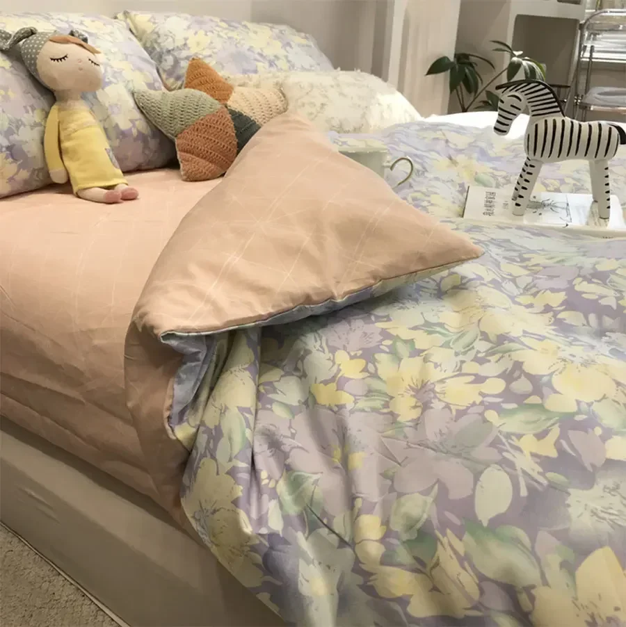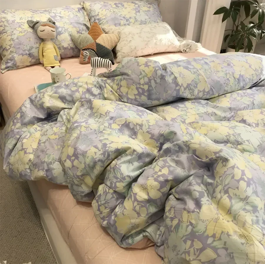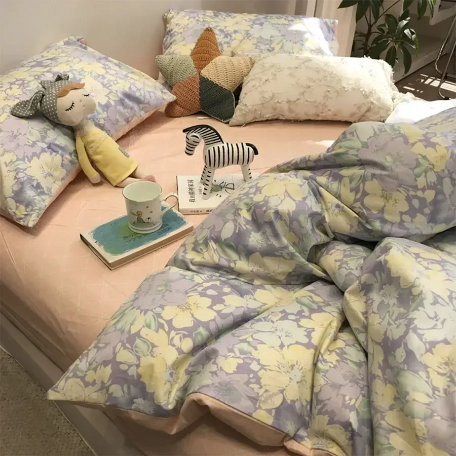 Purpdrank Cute rustic french floral bedding set,purple yellow cotton twin full queen king home textile flat sheet pillow case duvet cover