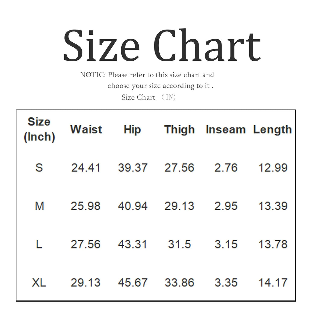 SizeWaistHipThighInseamLengthS62cm/24.41''100cm/39.37''70cm/27.56''7cm/2.76''33cm/12.99''M66cm/25.98''104cm/40.94''74cm/29.13''7.5cm/2.95''34cm/13.39''L70cm/27.56''110cm/43.31''80cm/31.50''8cm/3.15''35cm/13.78''XL74cm/29.13''116cm/45.67''86cm/33.86''8.5cm/3.35''36cm/14.17''
