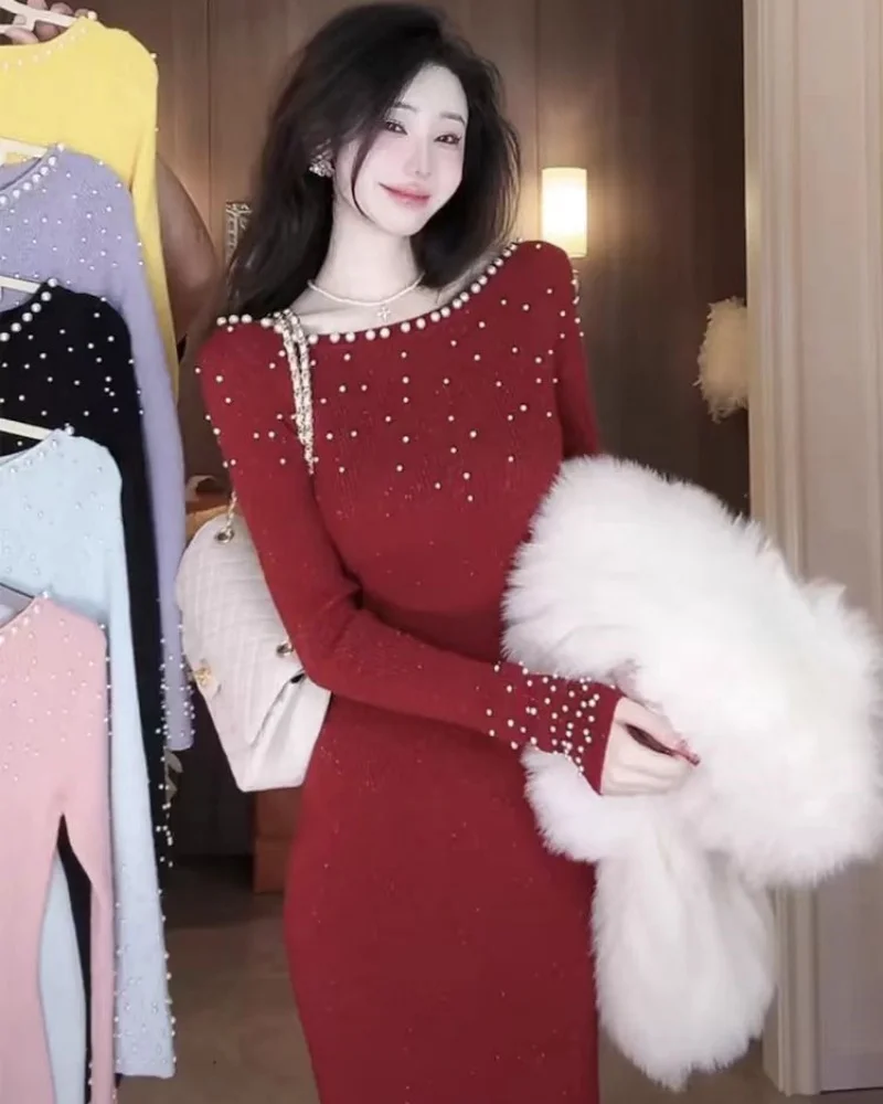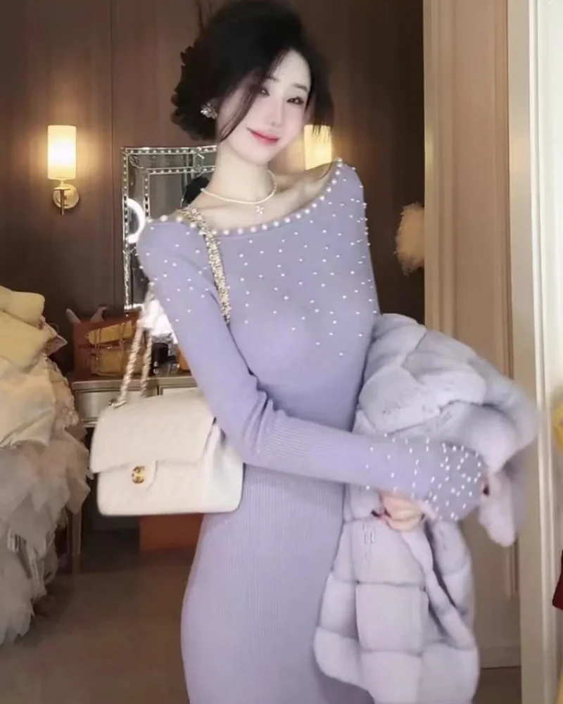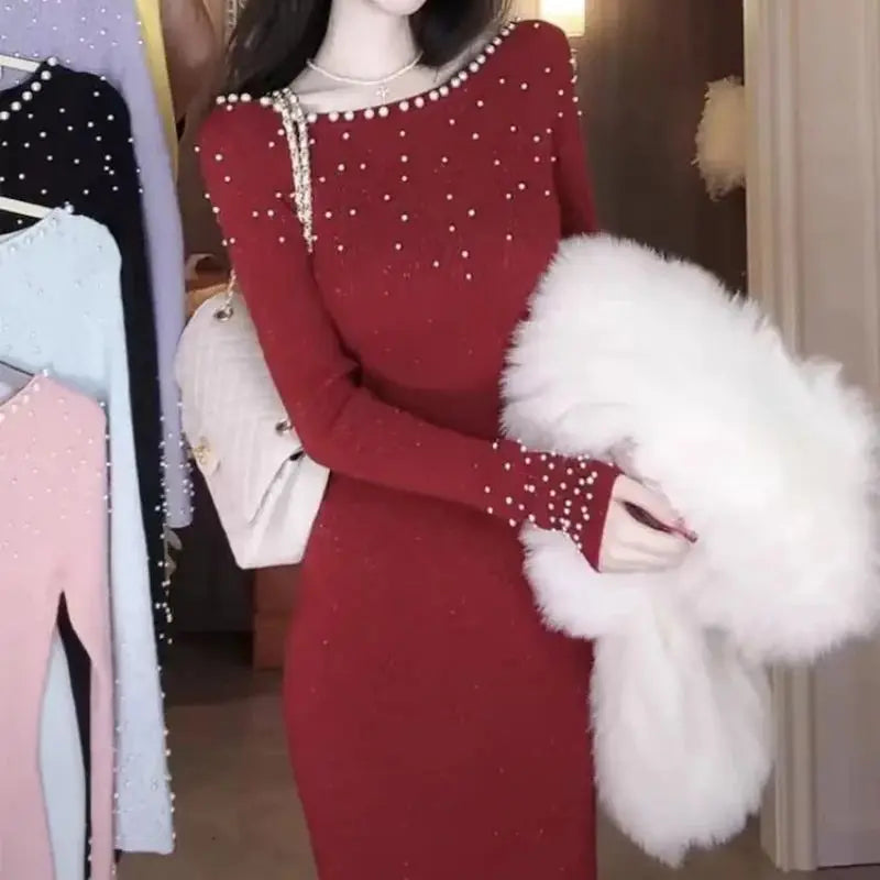Purpdrank Elegant Beaded Knitted Dress Women Sexy Off-the-Shoulder Bodycon Midi Dress Fall Winter Long Sleeve Slim Sweater Dresses 547A