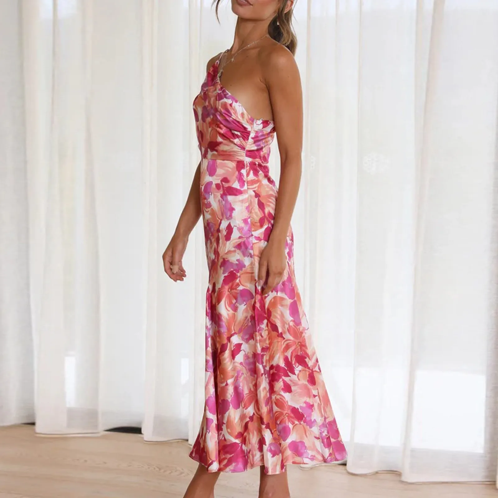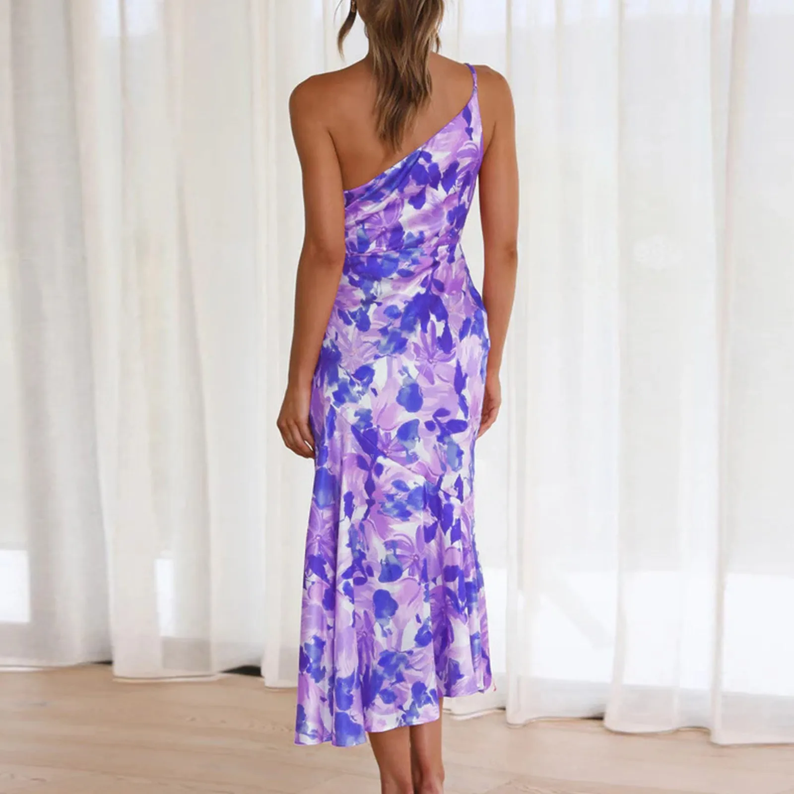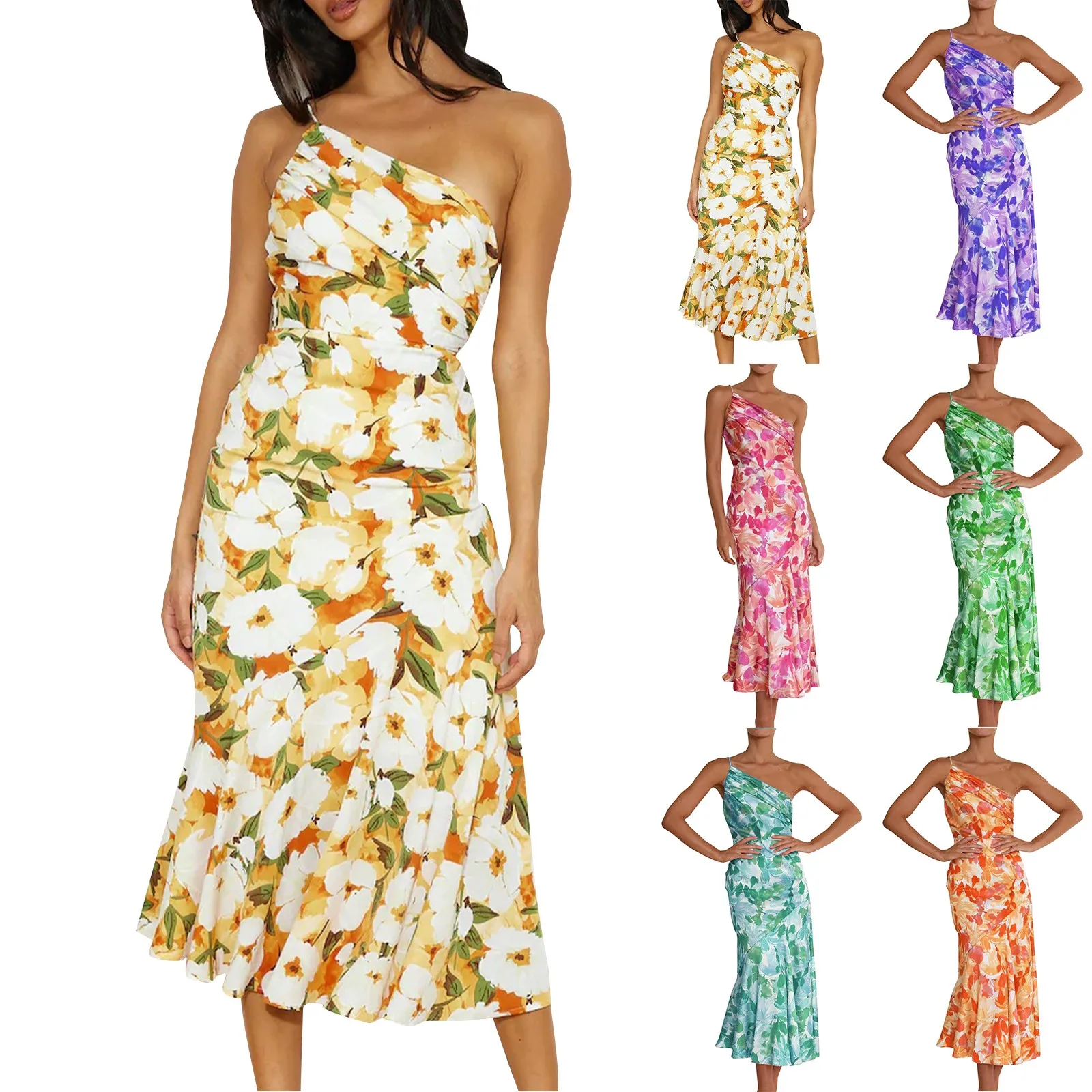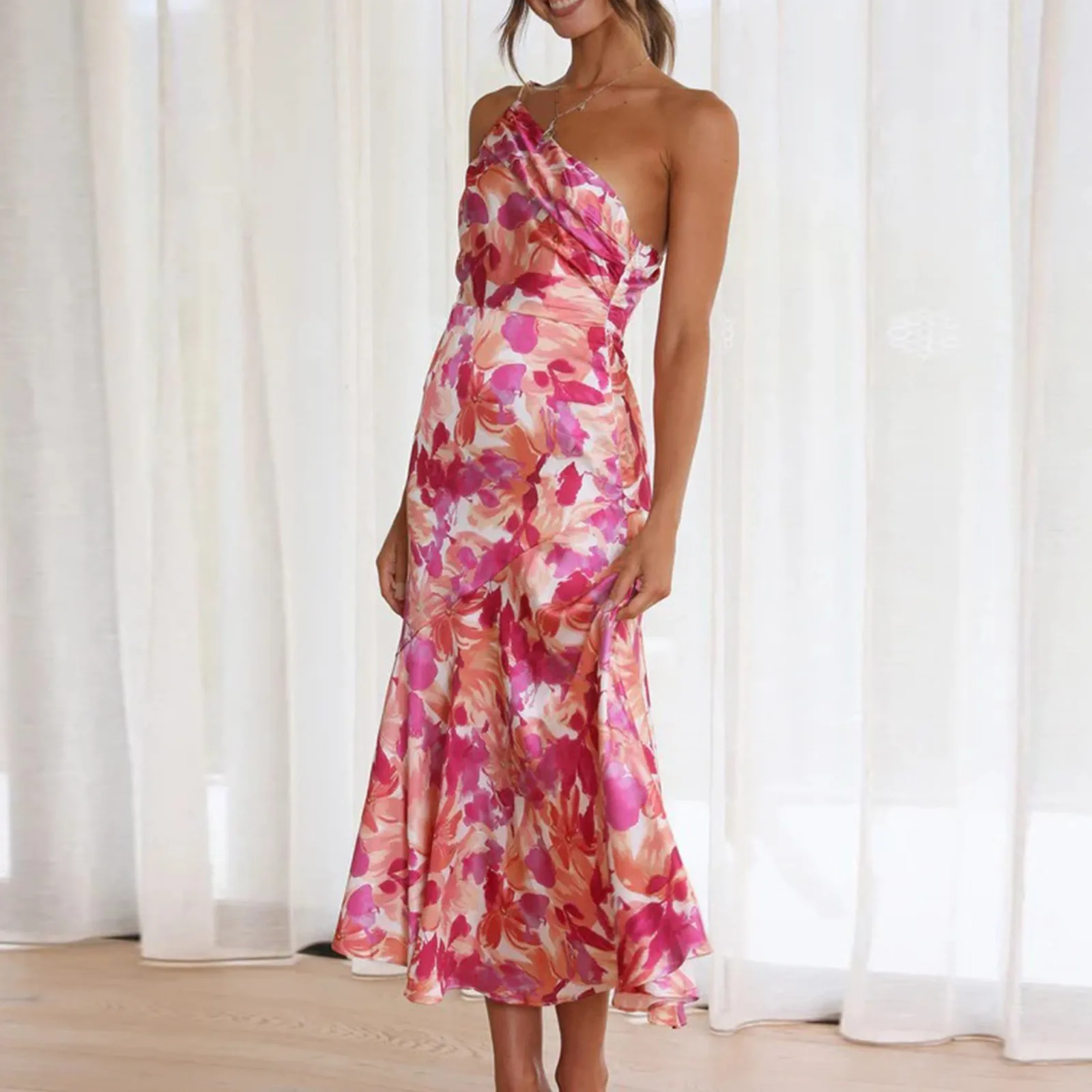 Purpdrank Elegant Oblique Shoulder Pleated Floral Print Spaghetti Dresses For Women Sexy Backless Strape Summer Midi Dress Vestidos