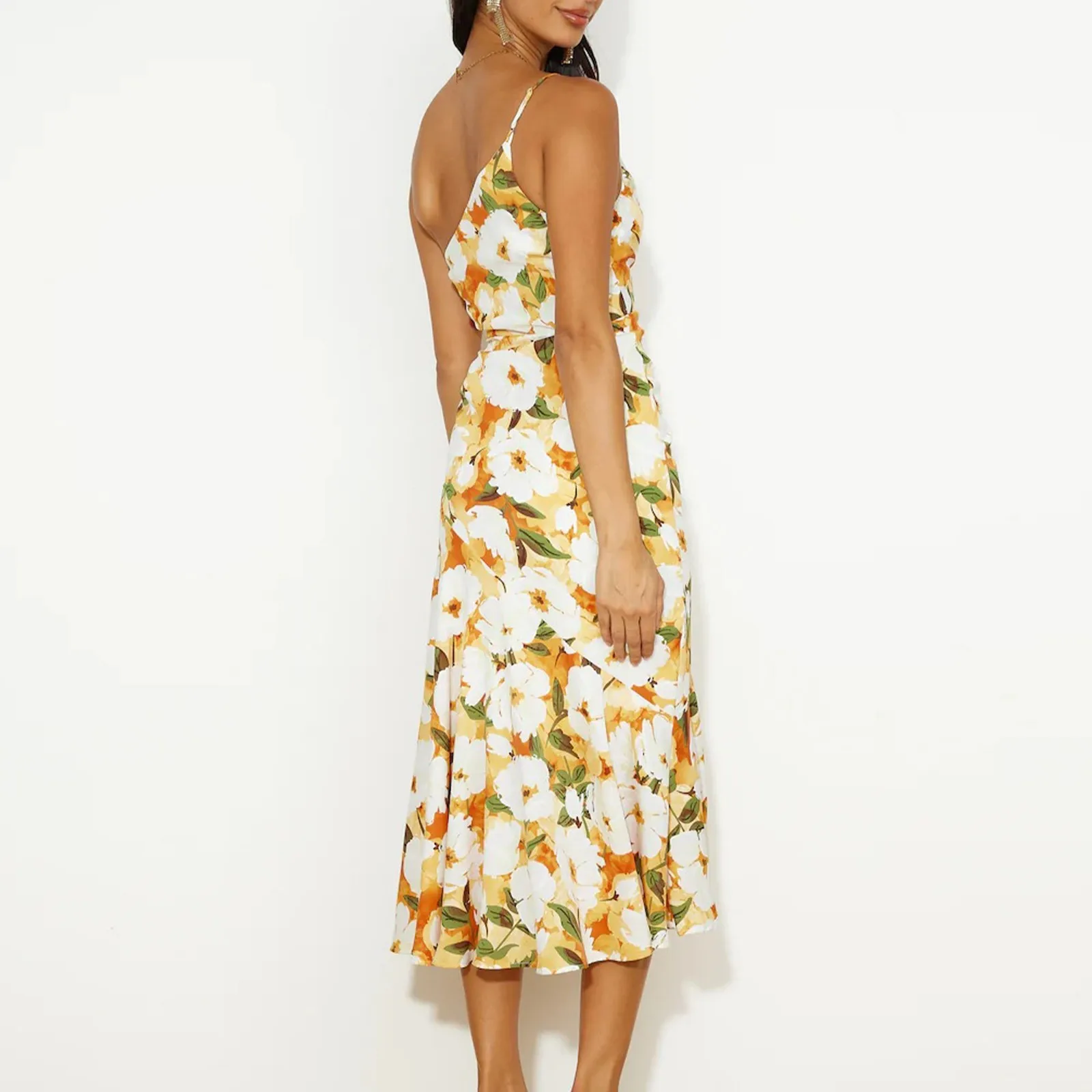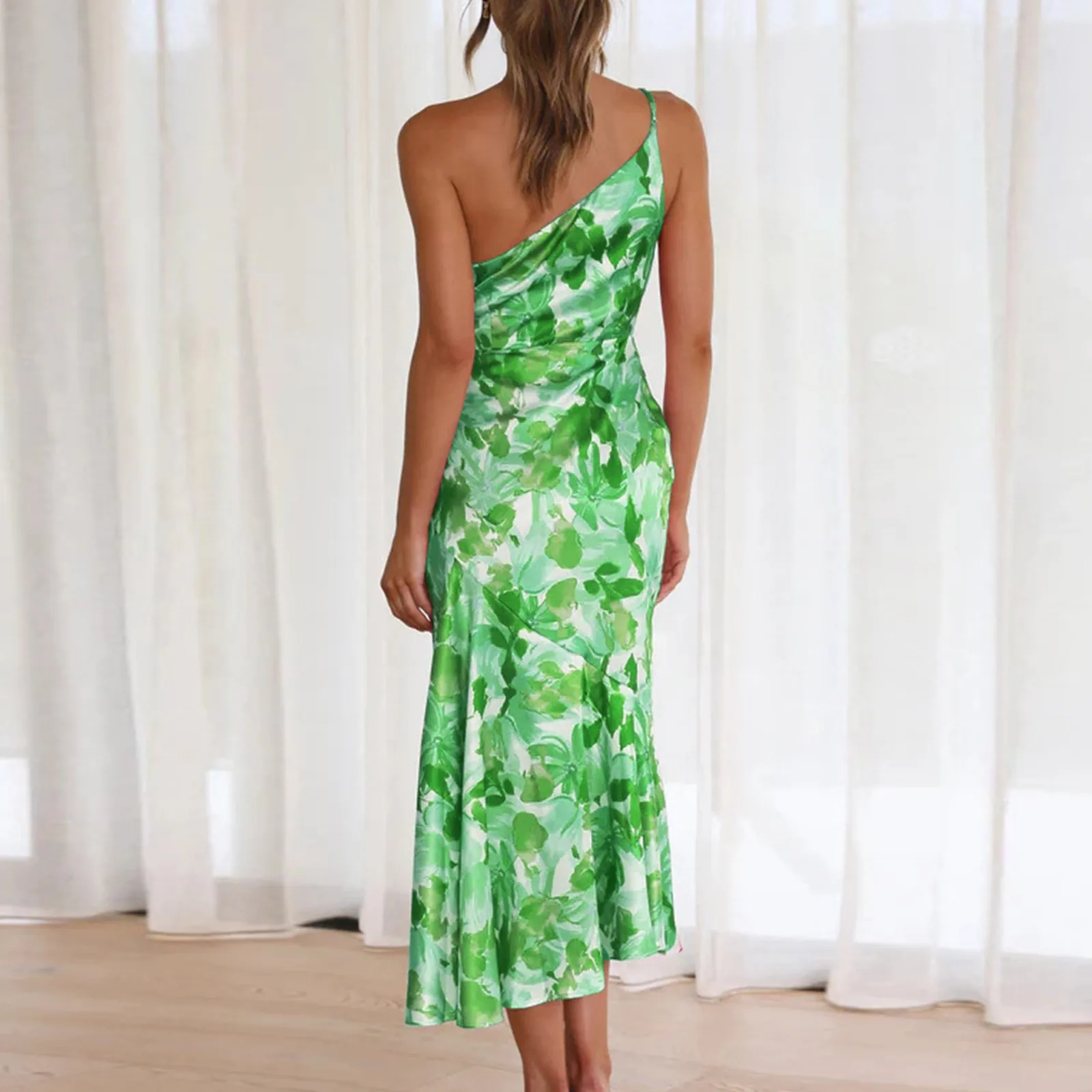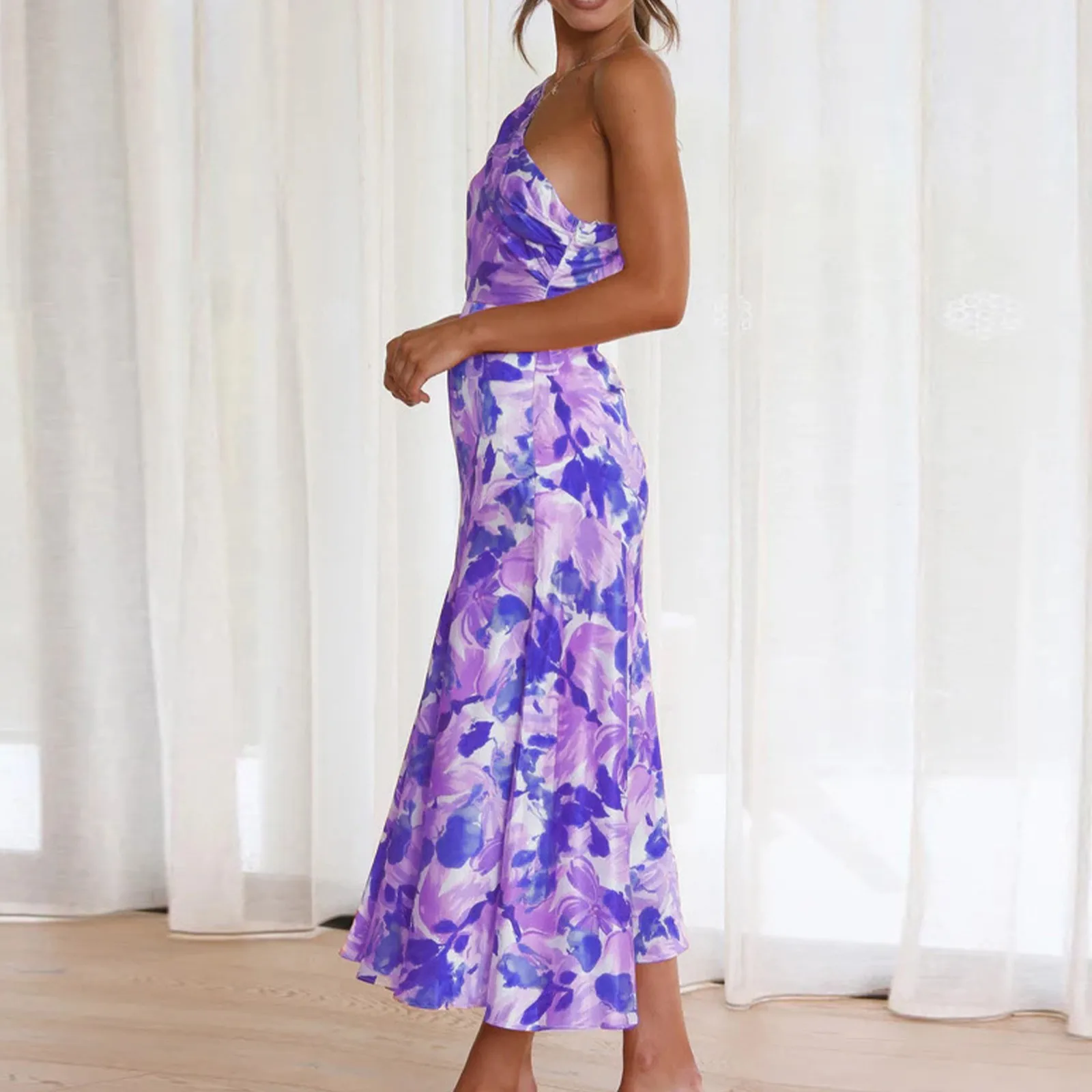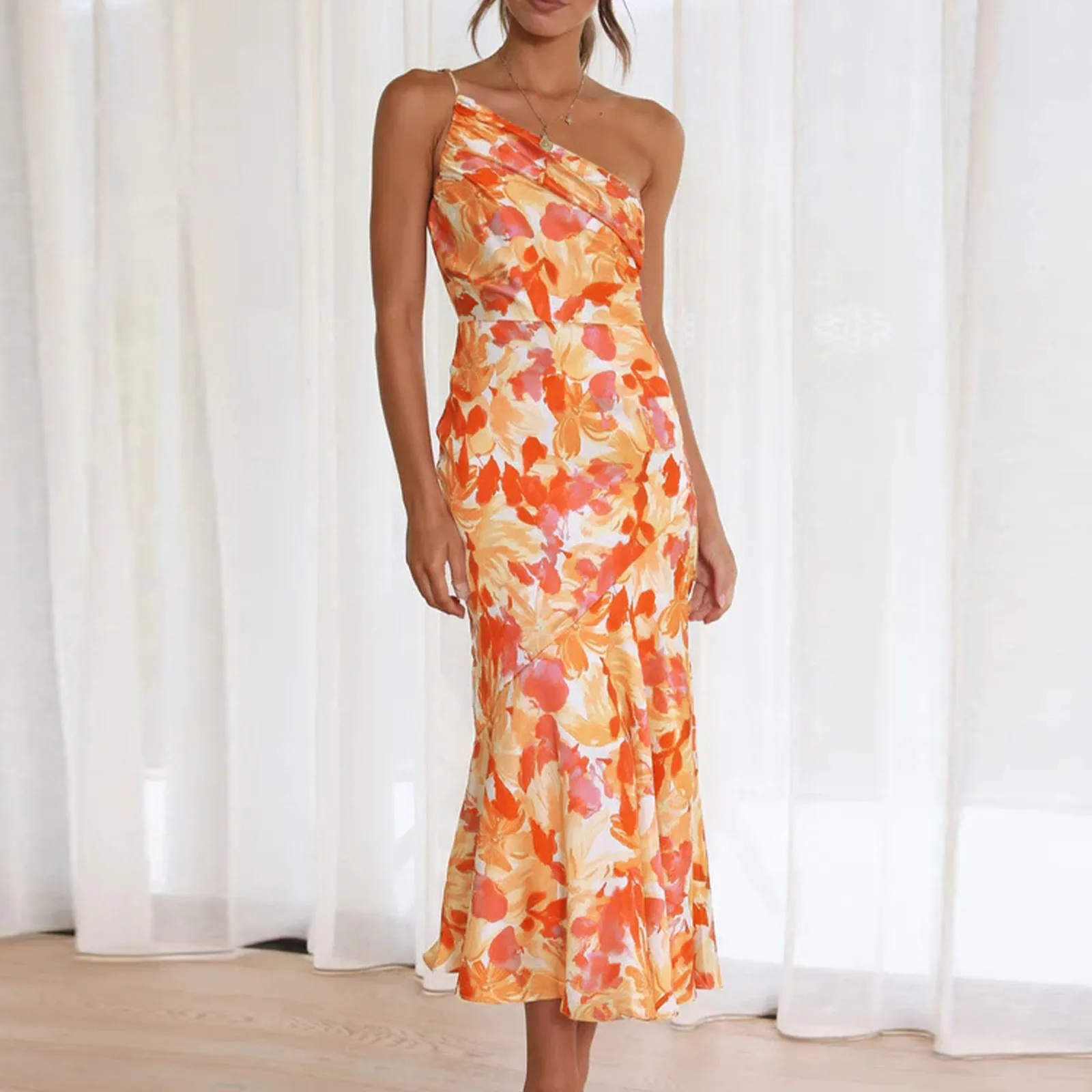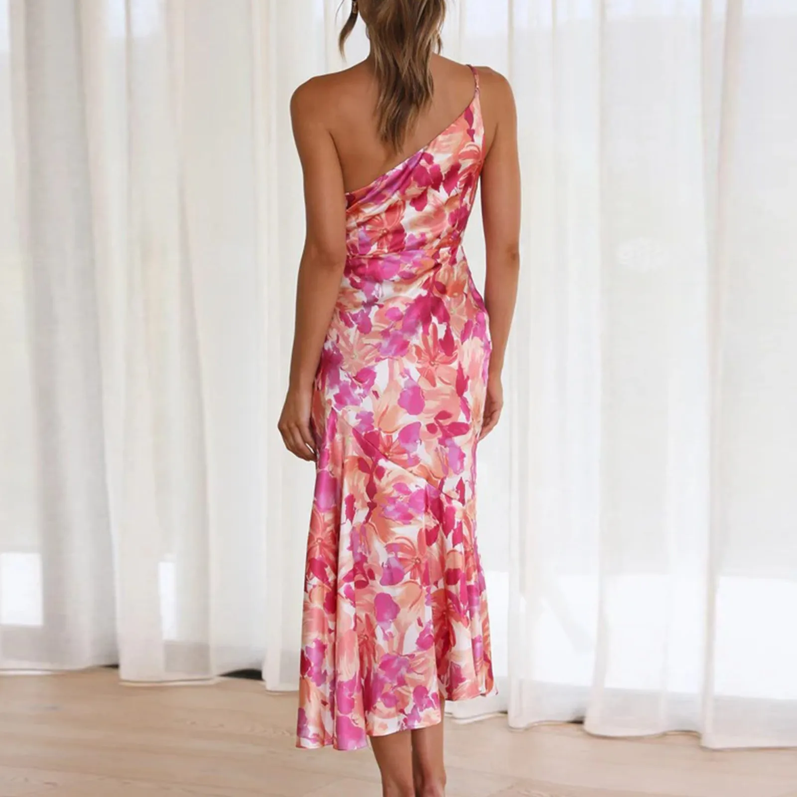 Purpdrank Elegant Oblique Shoulder Pleated Floral Print Spaghetti Dresses For Women Sexy Backless Strape Summer Midi Dress Vestidos