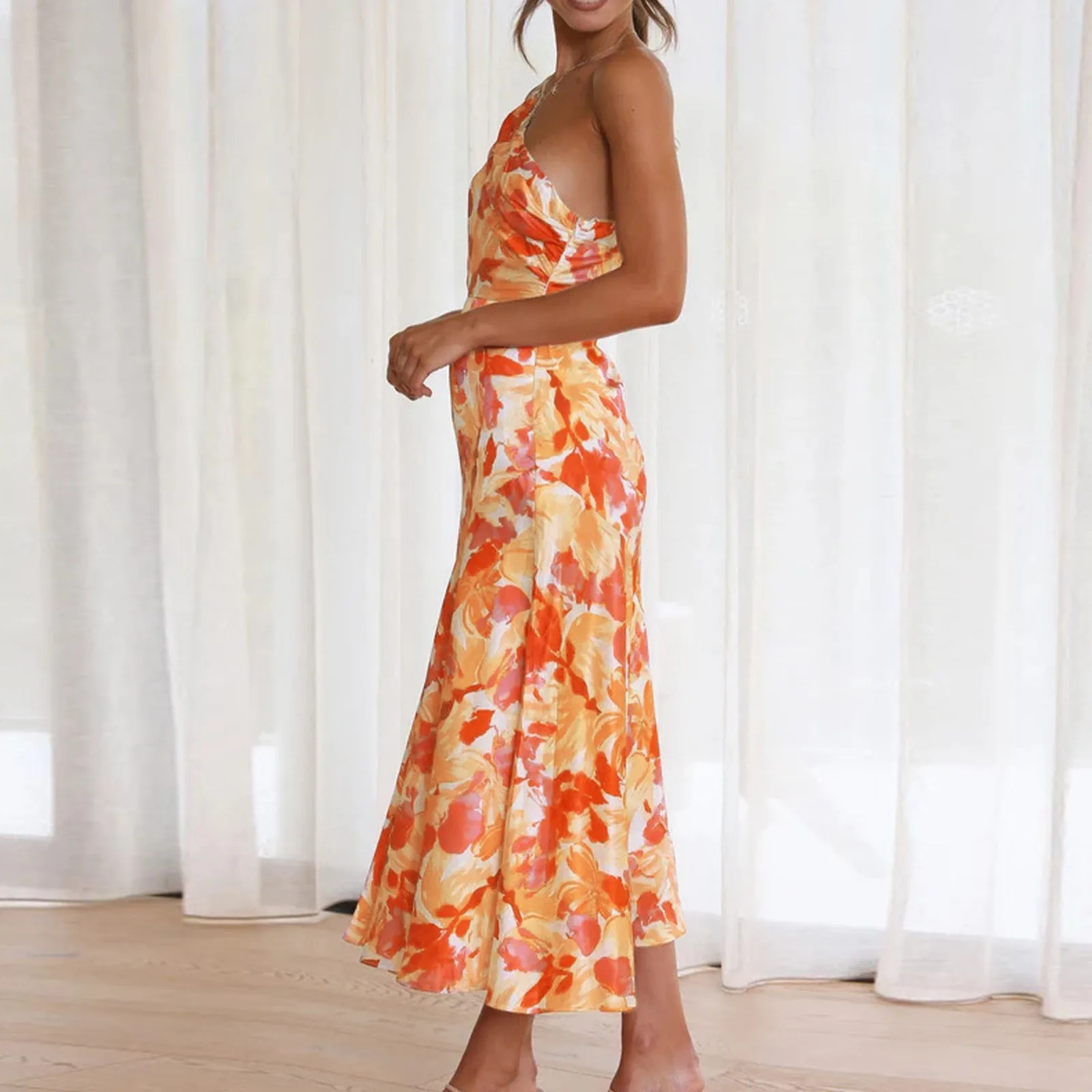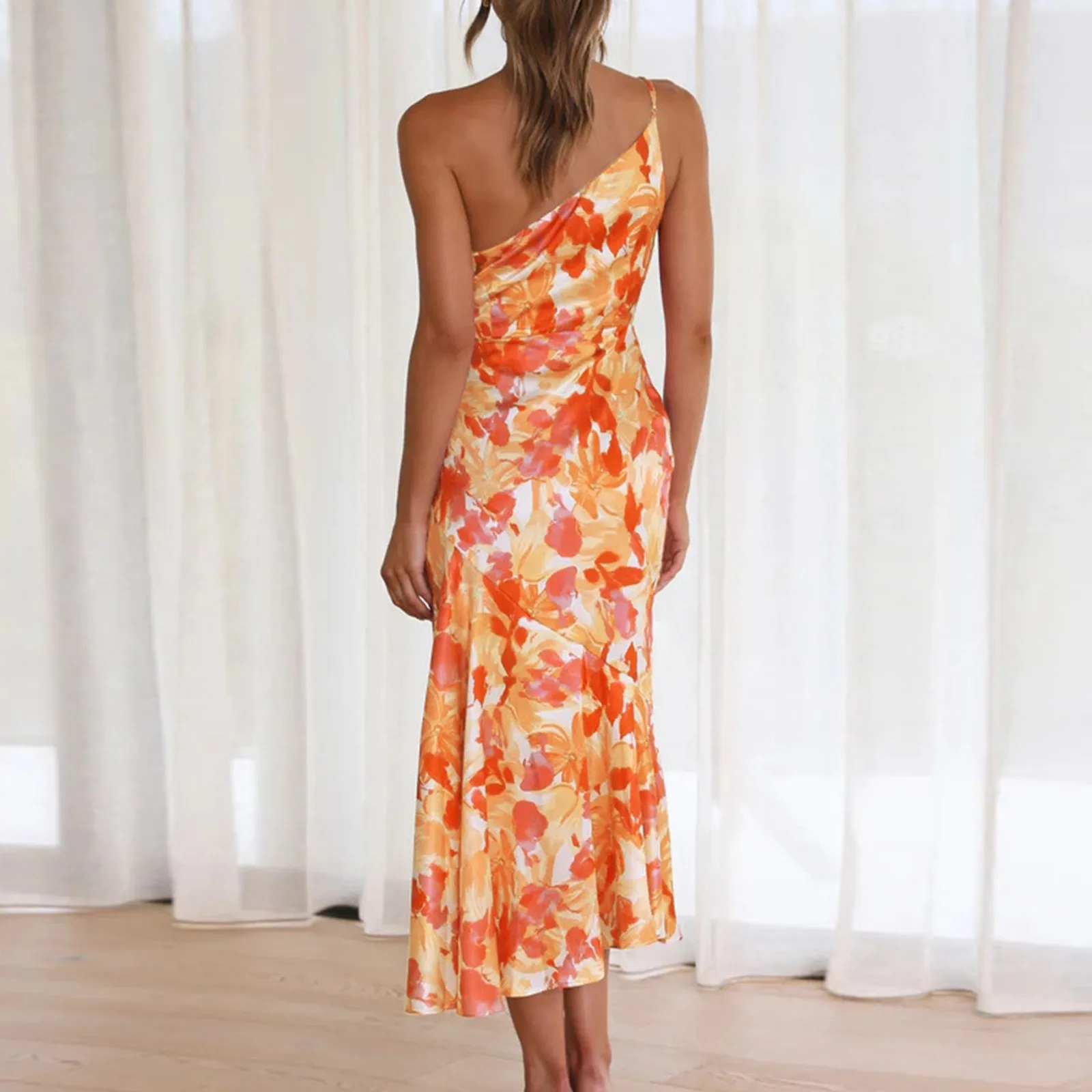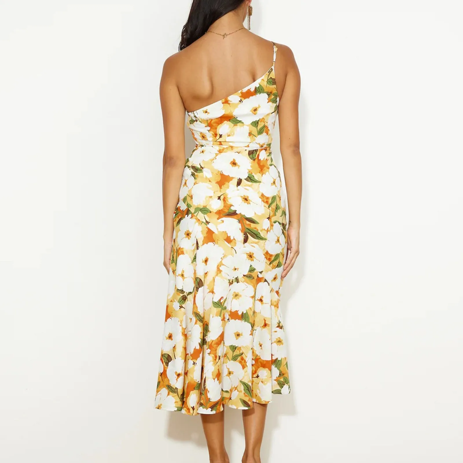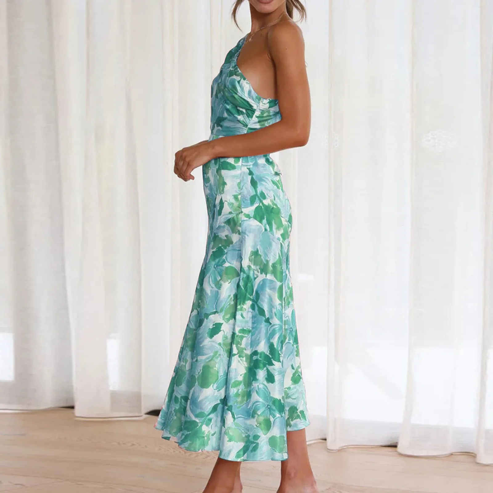 Purpdrank Elegant Oblique Shoulder Pleated Floral Print Spaghetti Dresses For Women Sexy Backless Strape Summer Midi Dress Vestidos