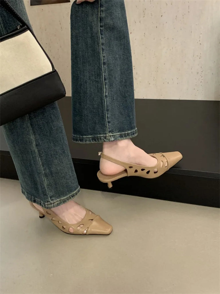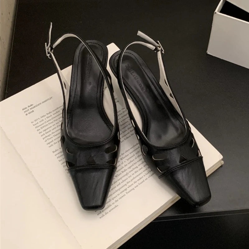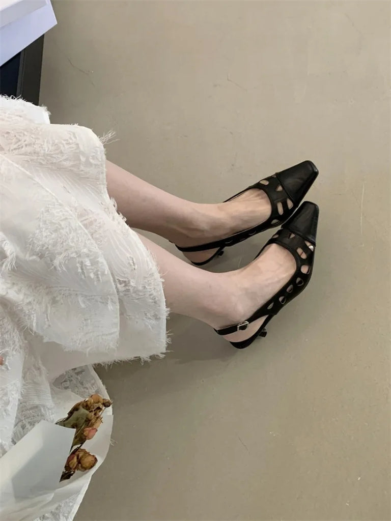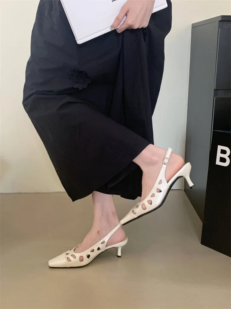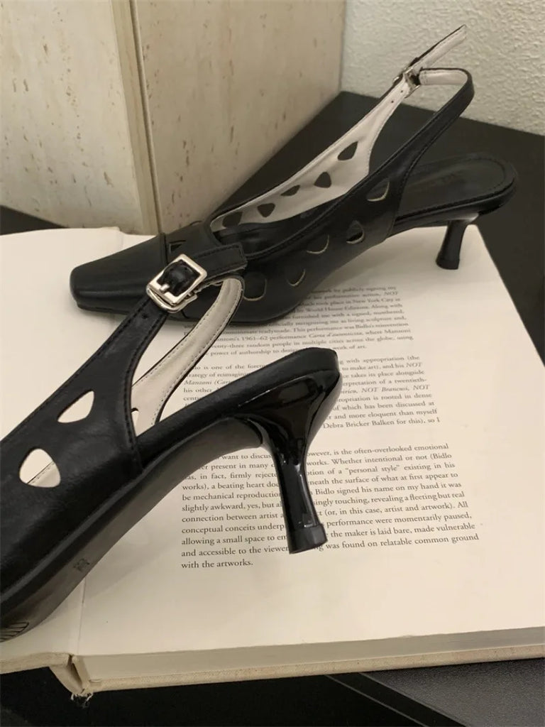 Purpdrank Elegant White Hollow Heels for Women Fashion Square Toe Buckle Mule Shoes Luxury Brand Designer Pumps Comfort office formal shoe
