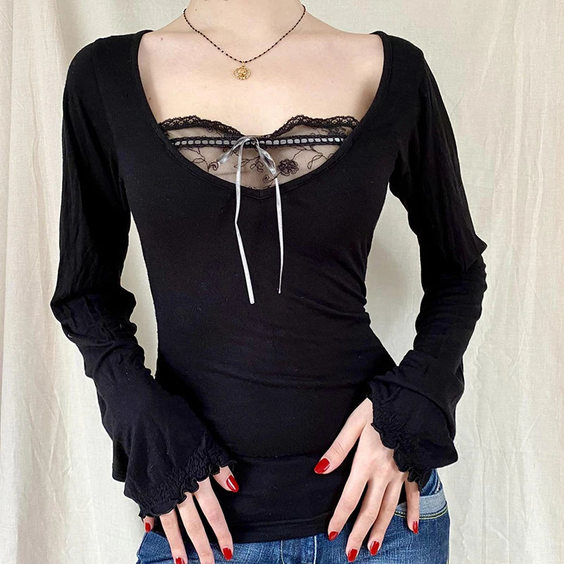 Purpdrank Fairy Grunge Top y2k Clothes Women Bow Lace Patchwork Long Sleeve T Shirt Vintage Aesthetic Pullovers Chic Streetwear