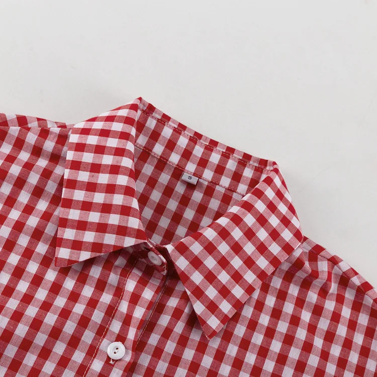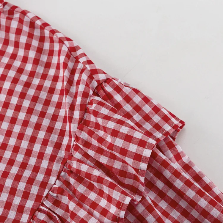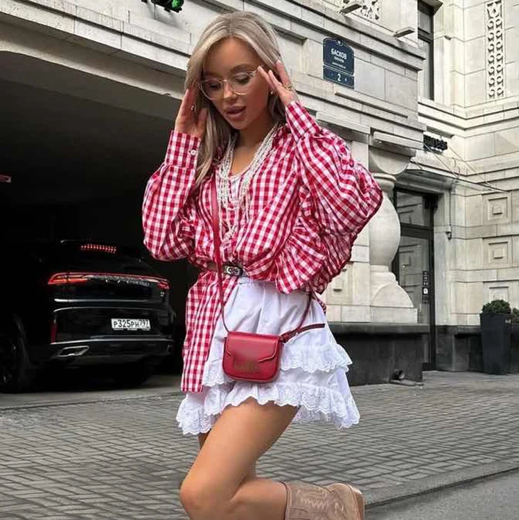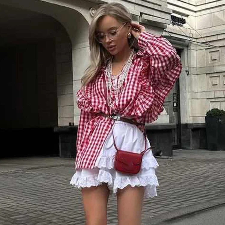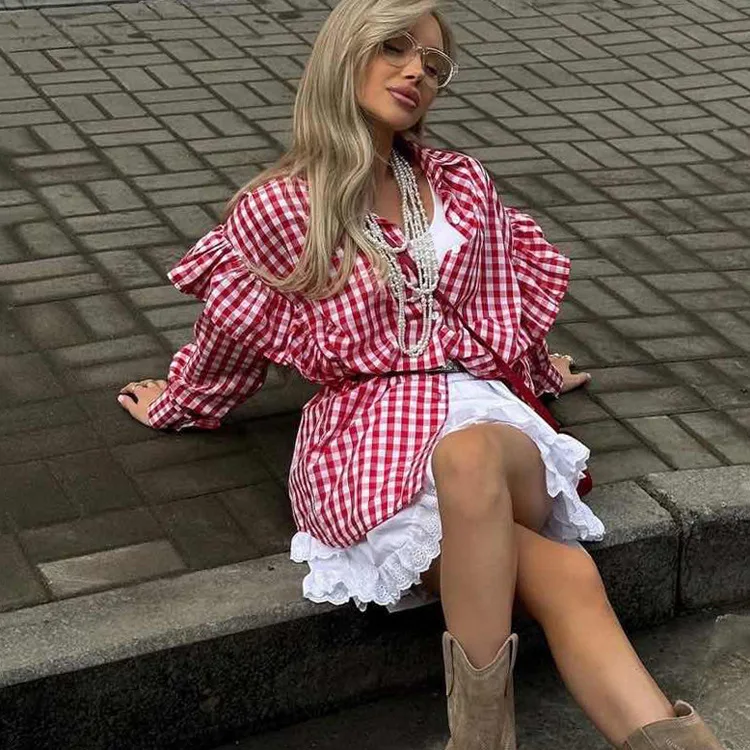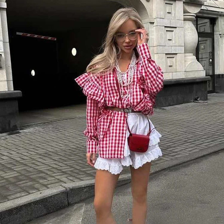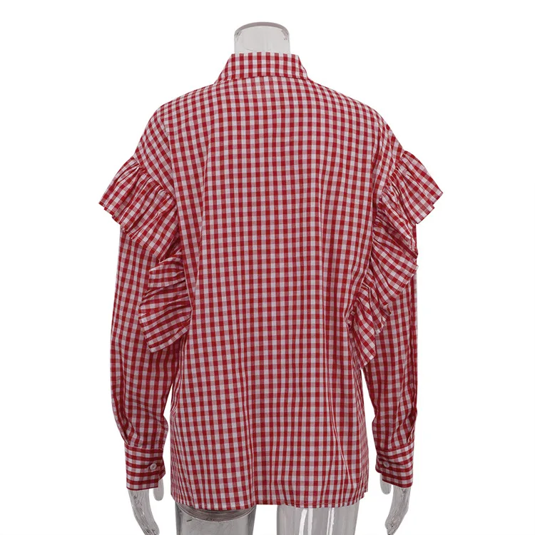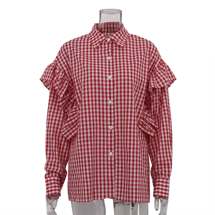 Purpdrank Fashion Plaid Cotton Women Shirt Blouse Casual Lapel Long Sleeve Shirts Elegant Classic Ruffle Top Female Clothing