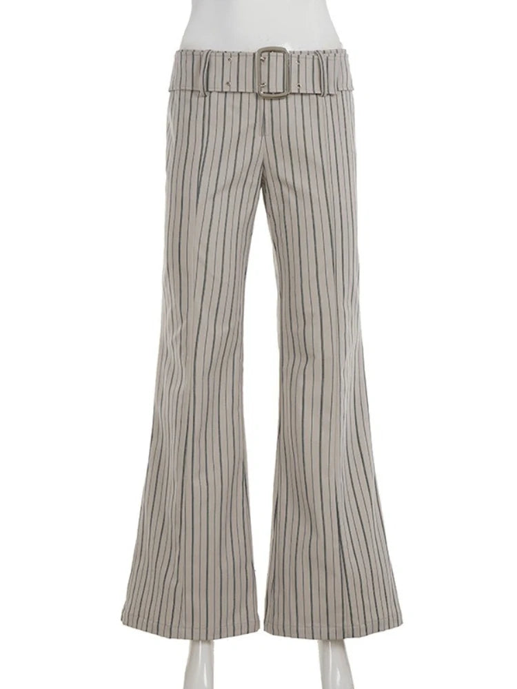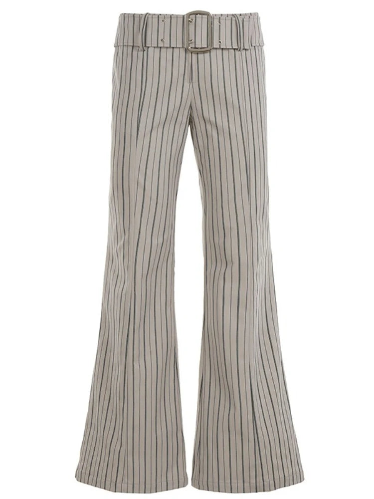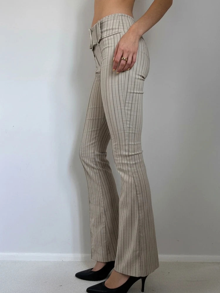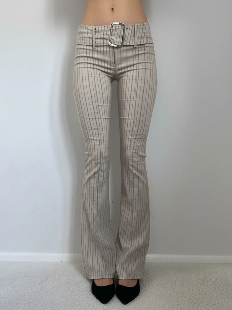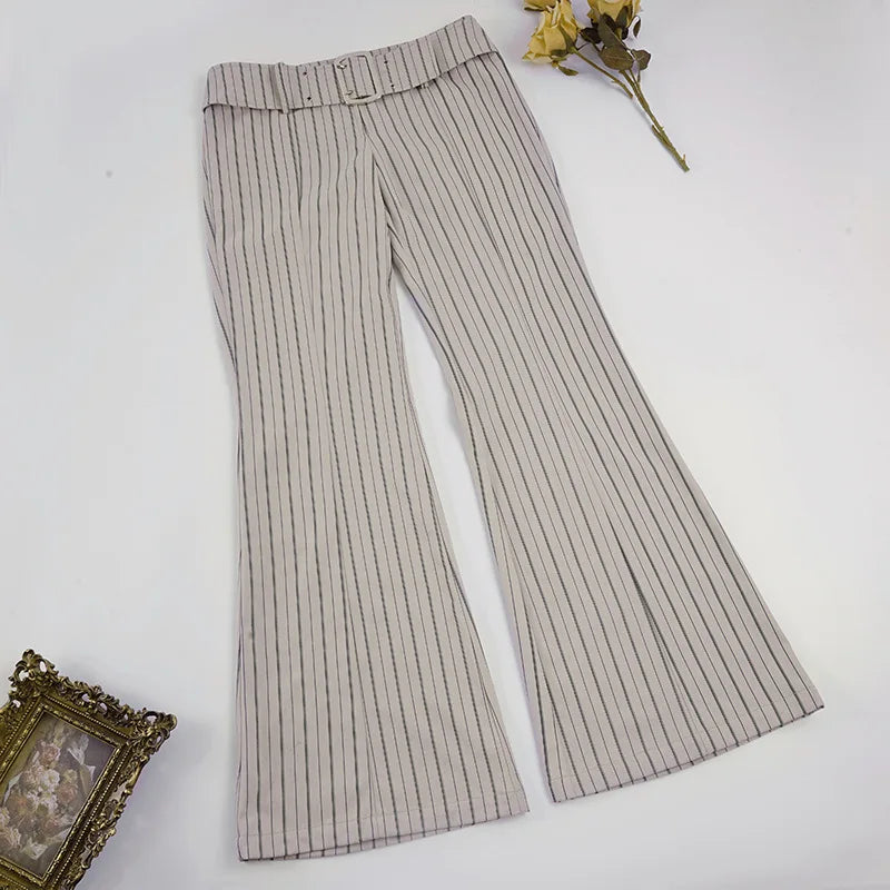 Purpdrank Fashion Women's Striped Long Pants Metal Buckle Belt with Zipper Up Slim Fit Casual Female Trousers for Work Office Wear