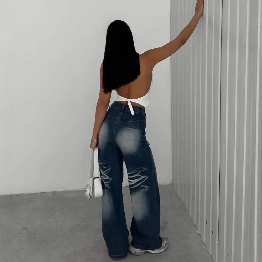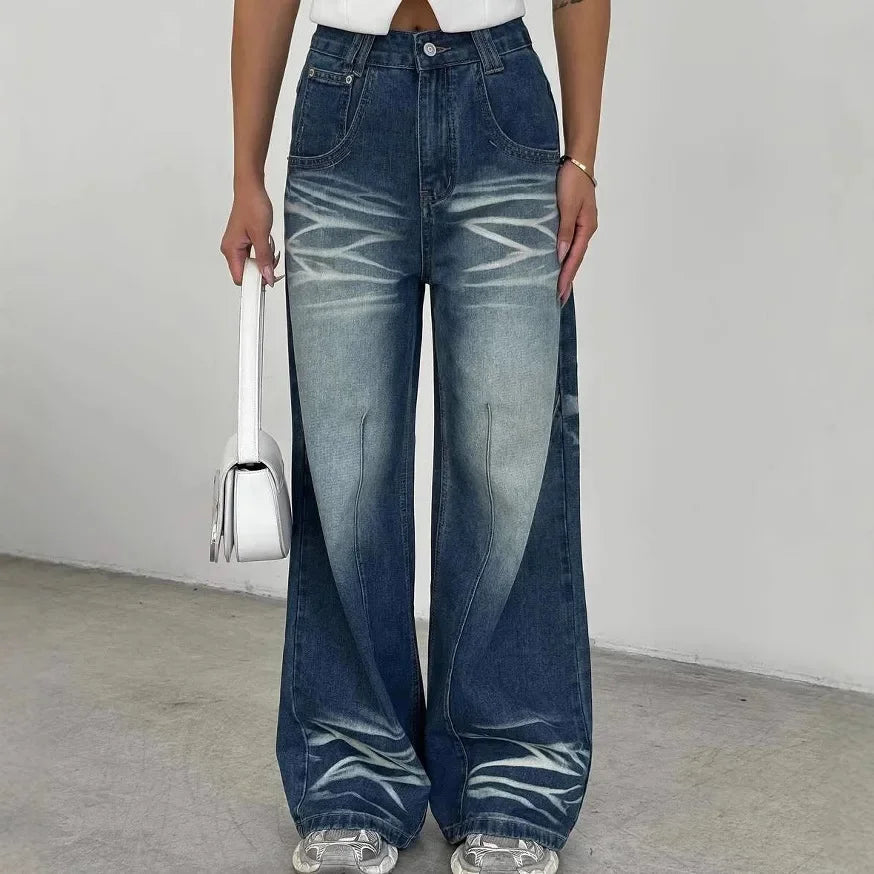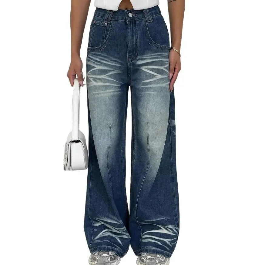 Purpdrank Fashionable Whitewashed Design Style Girl's Denim Pants - Vintage High Street Long Length Frayed Floor-length Pants