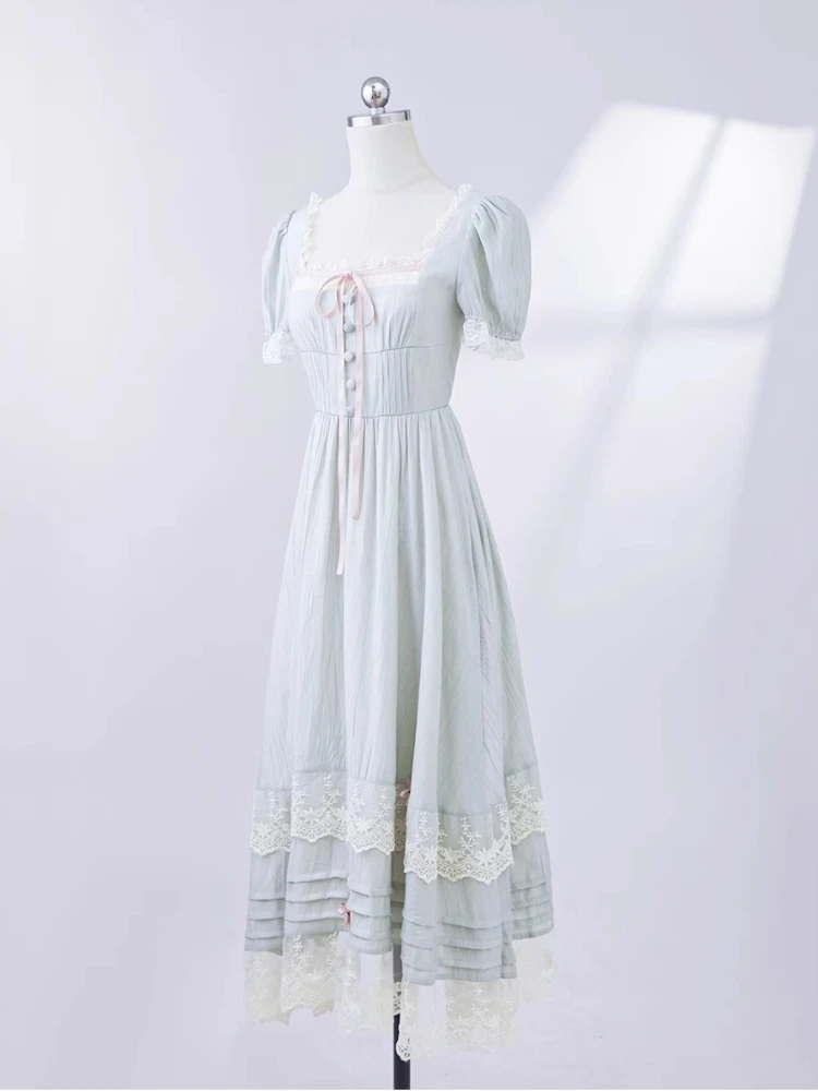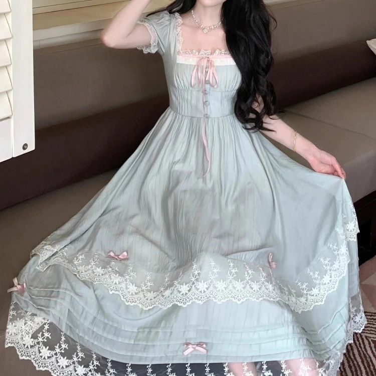 Purpdrank French Gentle Style Vintage Women Dress Sweet Bow Short Sleeve Dress Lace Splice Korean Popular Chic Long Dress New Summer 2025