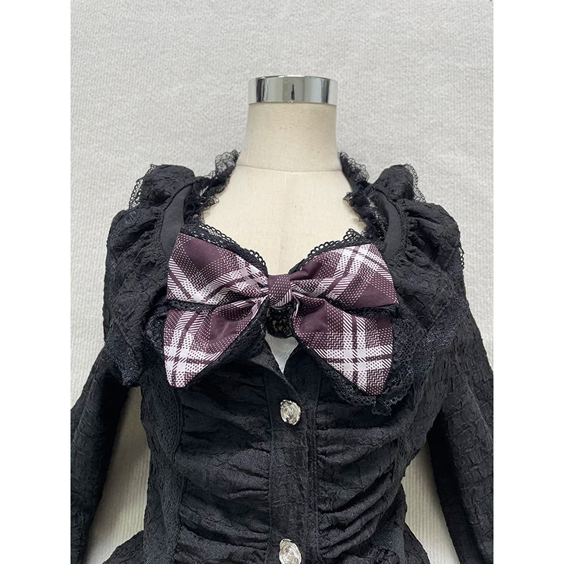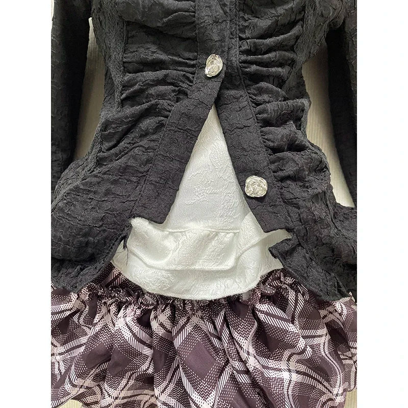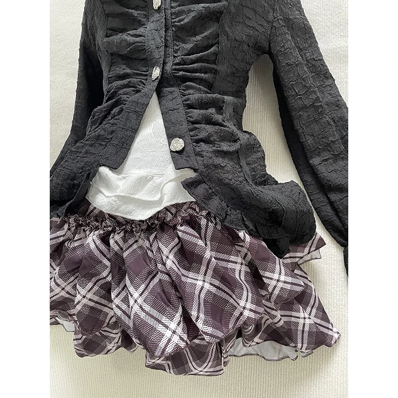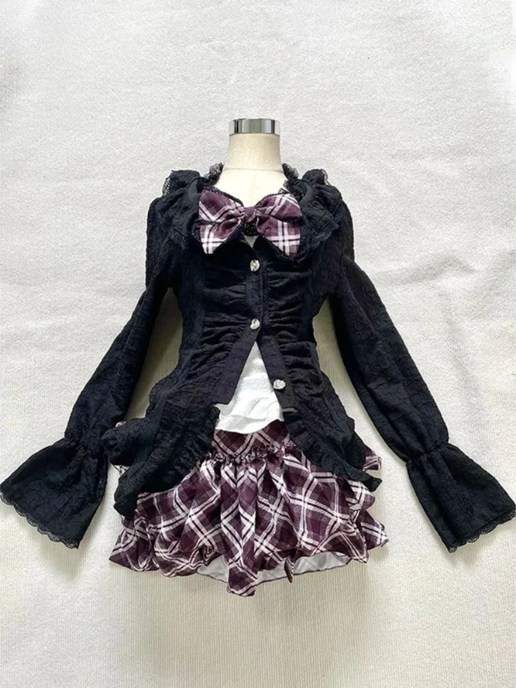 Purpdrank  Japanese Gothic Vintage Elegant Women 3 Piece Set Y2k Black Design Cardigan + Chic Tops + Plaid Skirts New Fashion Retro Outfits