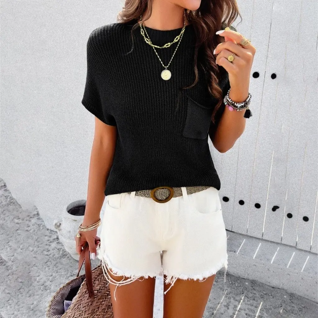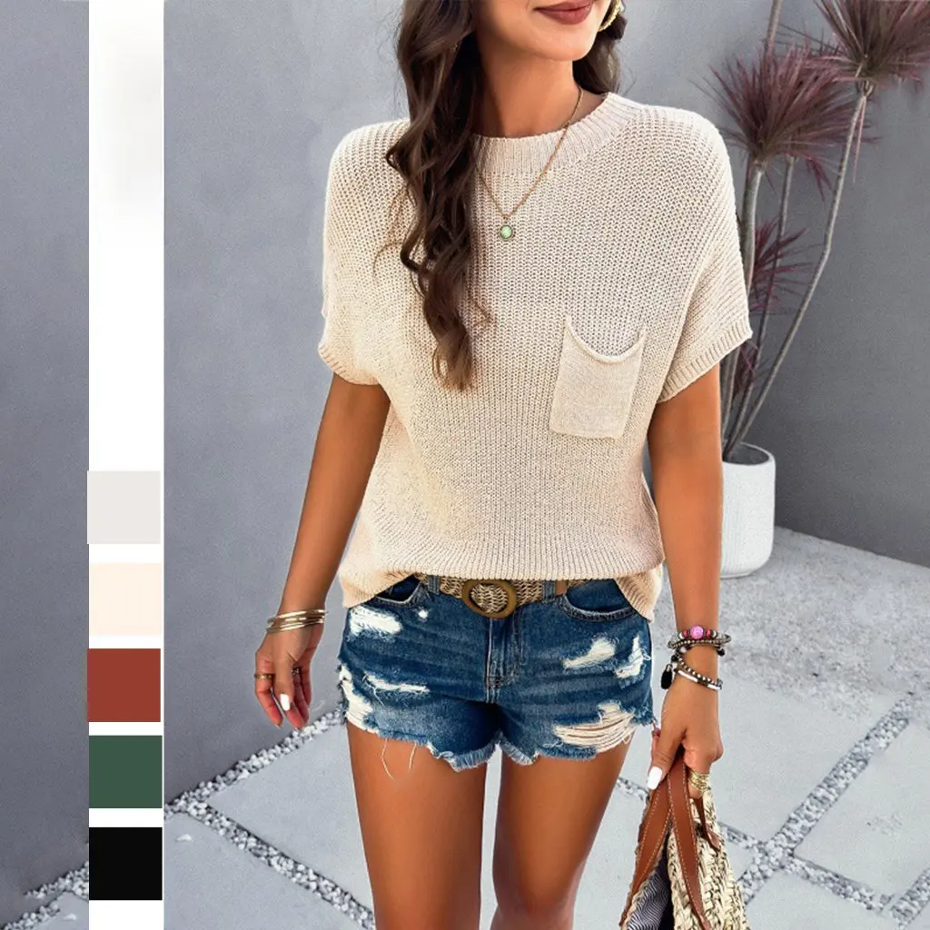 Purpdrank Kaikuo Women's Elegant Casual Pure Color Knitwear Short-Sleeved Top Spring Summer European American Style Export