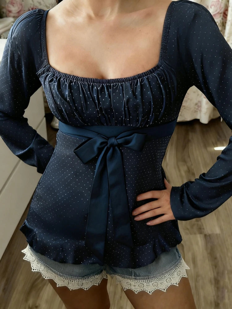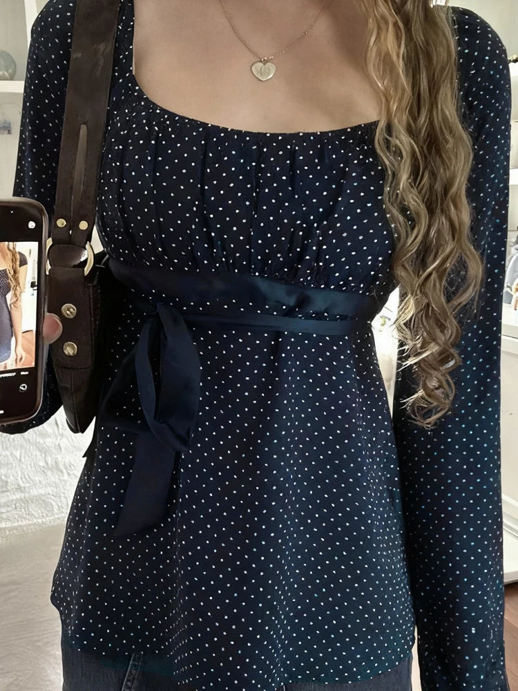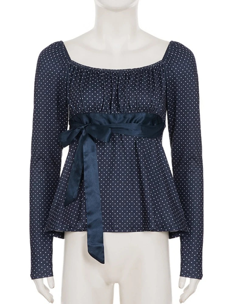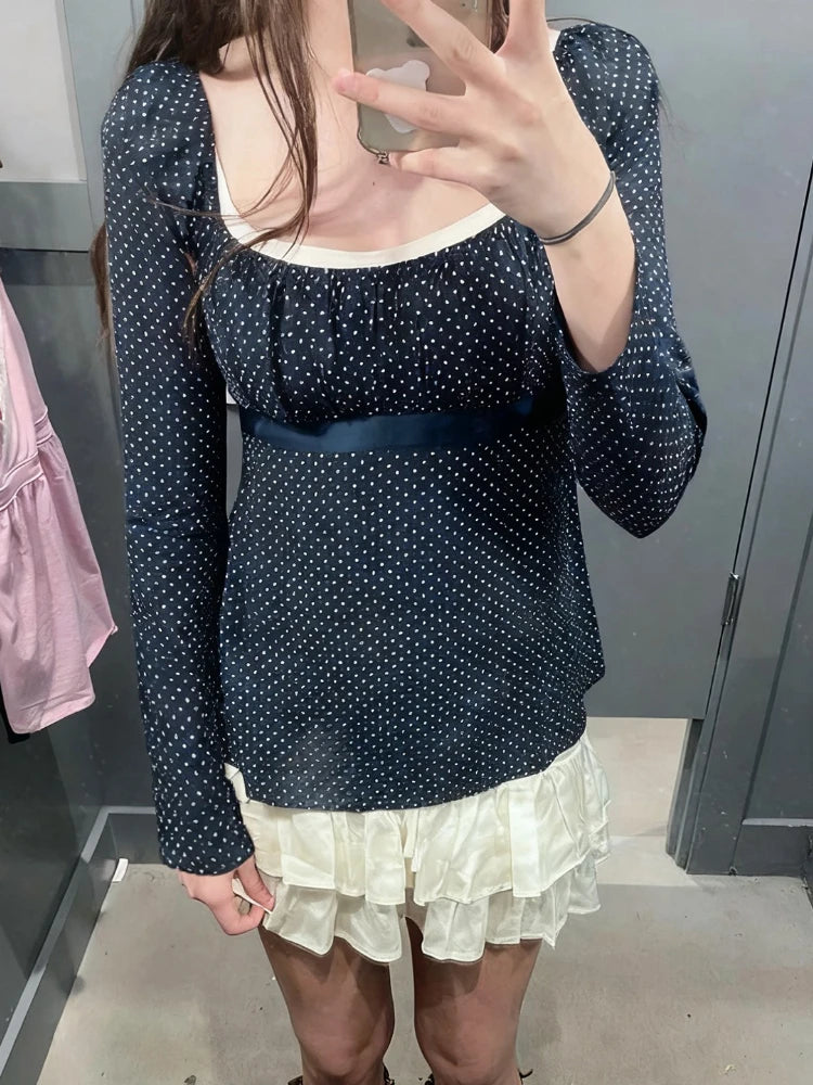 Purpdrank Korean Autumn U Neck Long Sleeve Polka Dot Bow Bandage All Match Streetwear T-Shirts