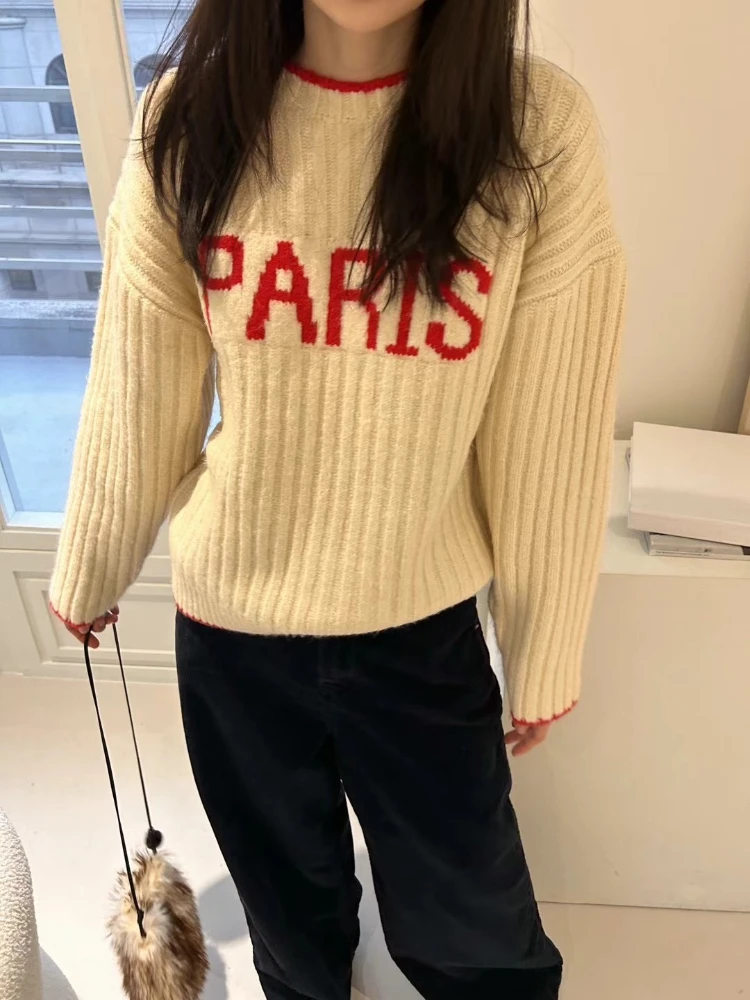 Purpdrank Korean Letter Jacquard O Neck Long Sleeve All Match Fashion Sweater Women Jumpers