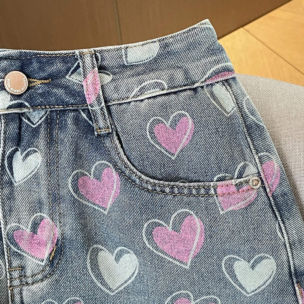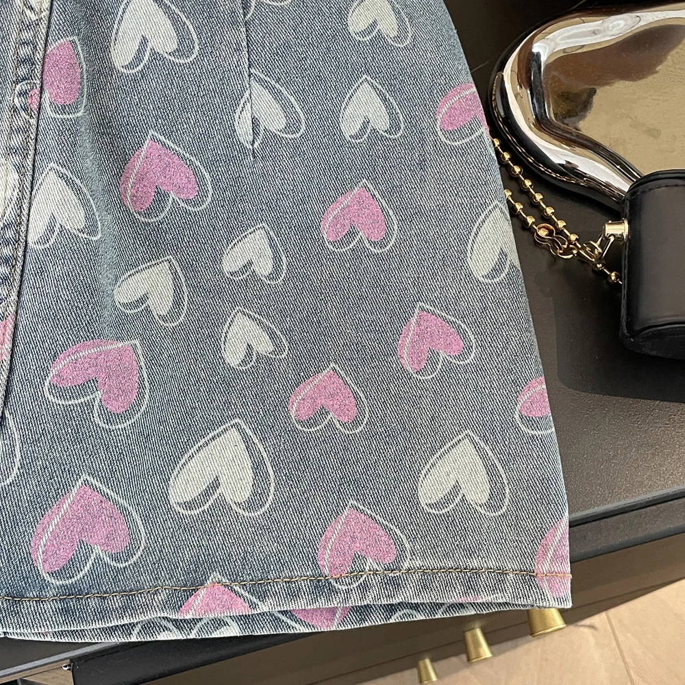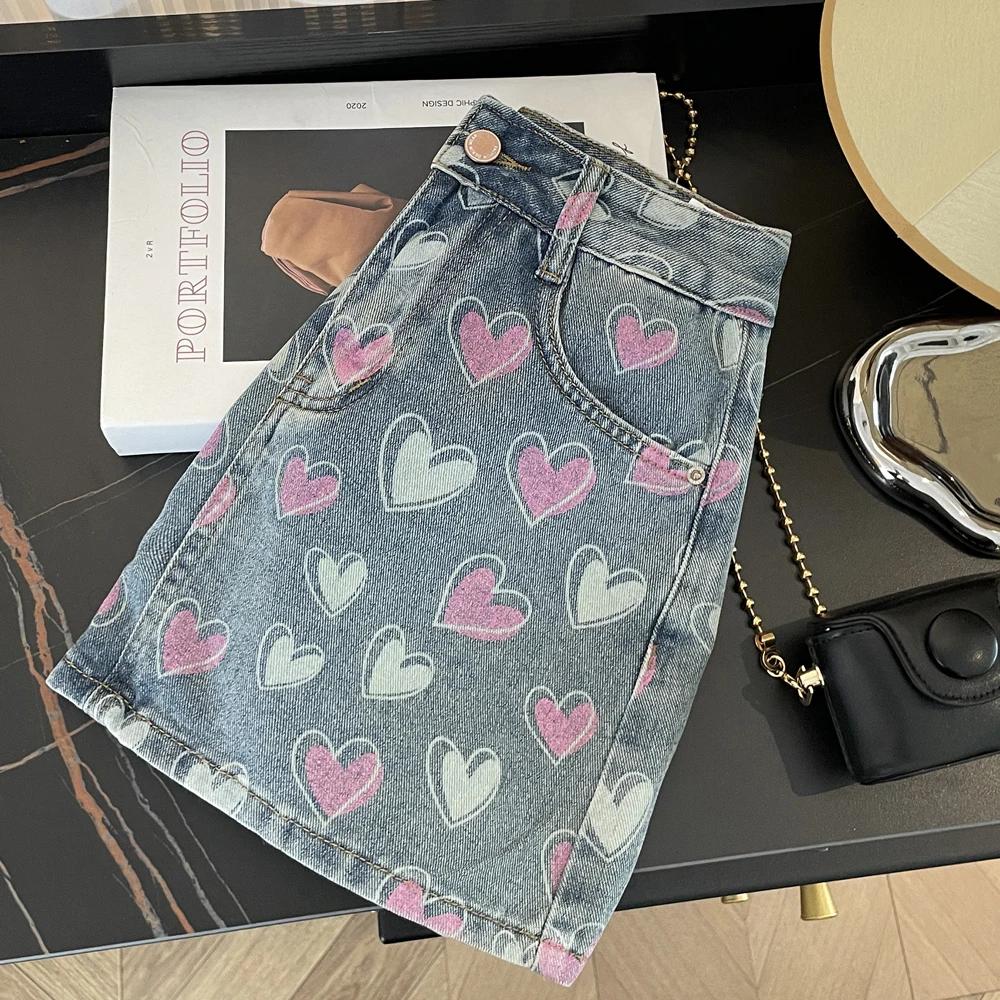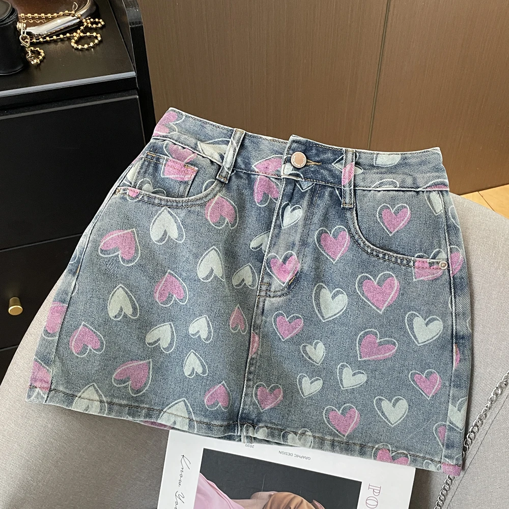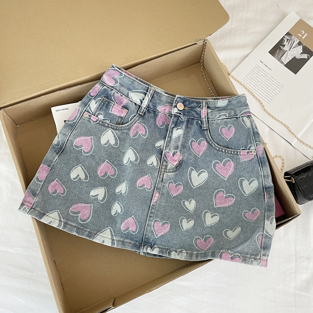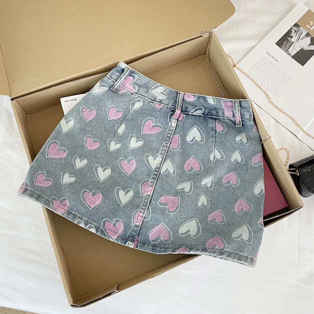 Purpdrank Korean Sweet Heart Print Demin Skrit Women Vintage High Waisted A-word Jeans Fashion All Match Streetwear Faldas Y2k