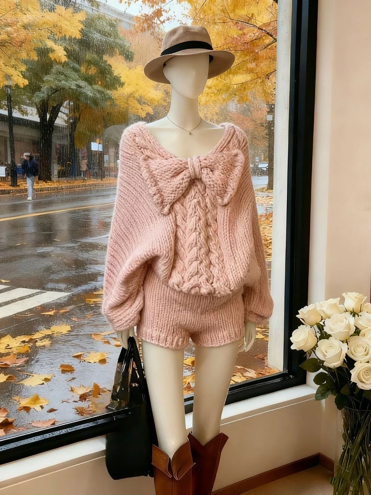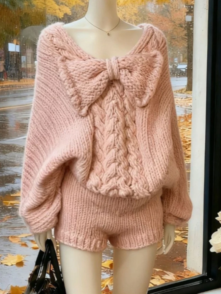 Purpdrank Korean Sweet Pink Knit Shorts Set Women Cute Bow Design Pullovers + Fit Chic Pants New Kawaii Knitting Pure Desire Outfits