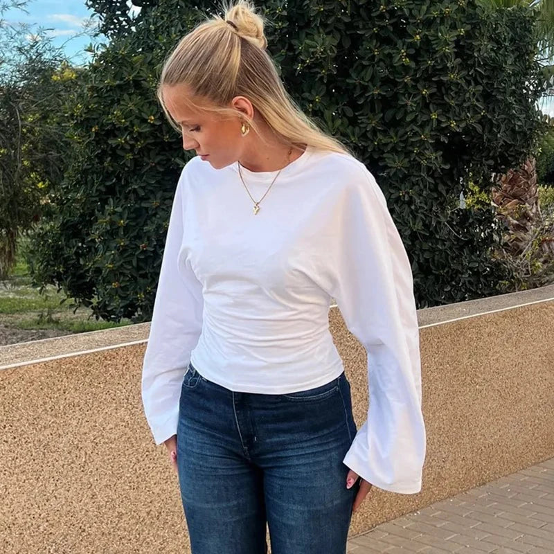 Purpdrank Long Sleeve Pleated T Shirt Women's O Neck Solid Classic Loose Pullover Tops Female Autumn Simple Casual T Shirts
