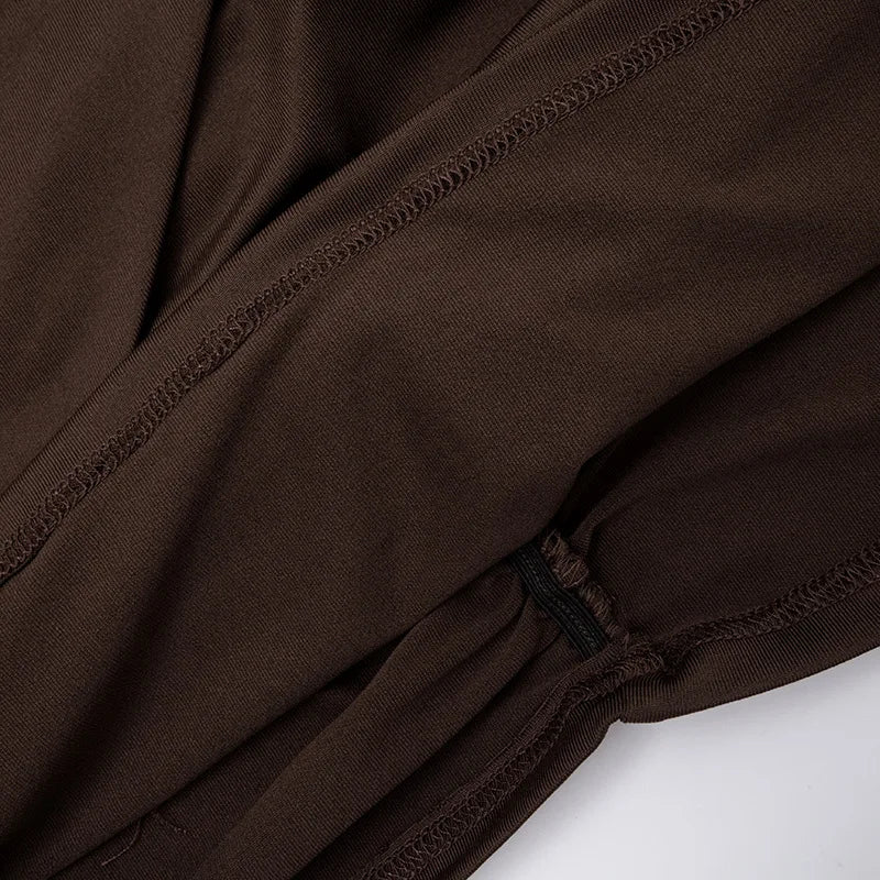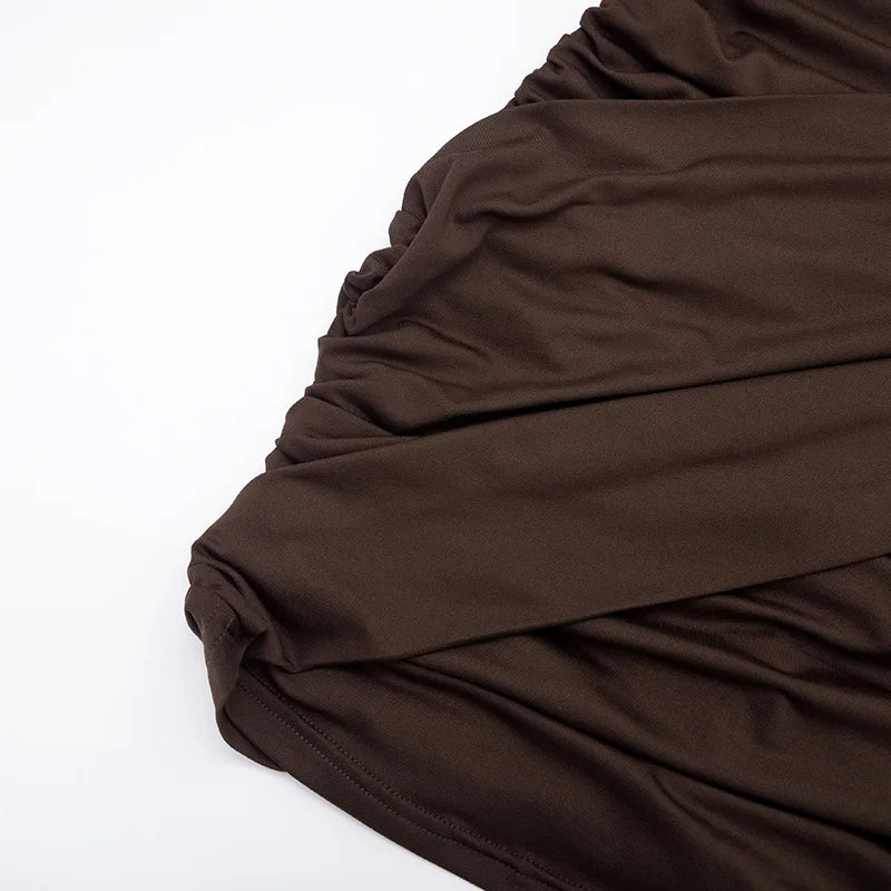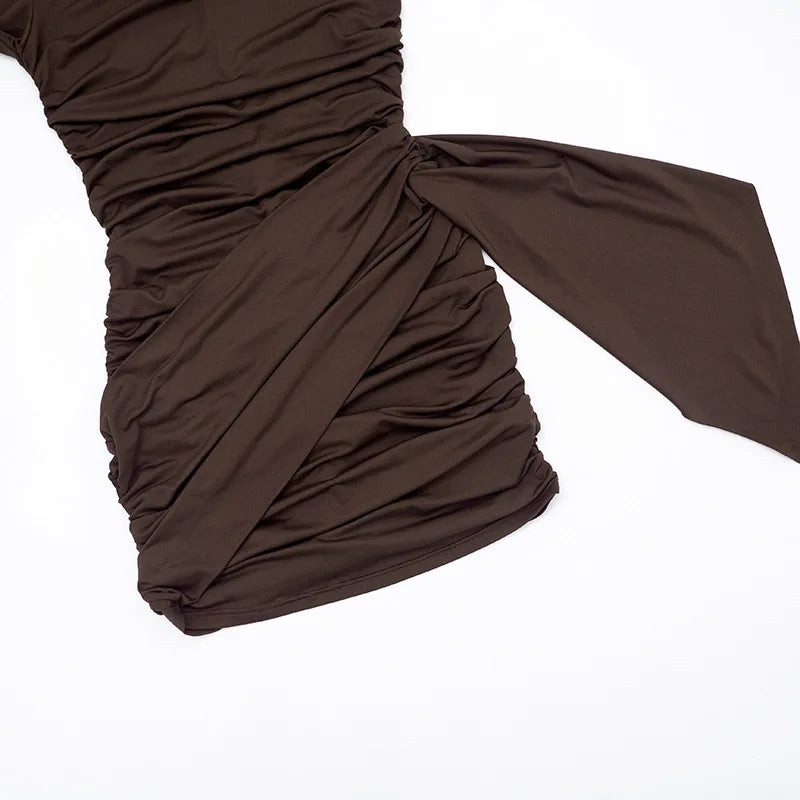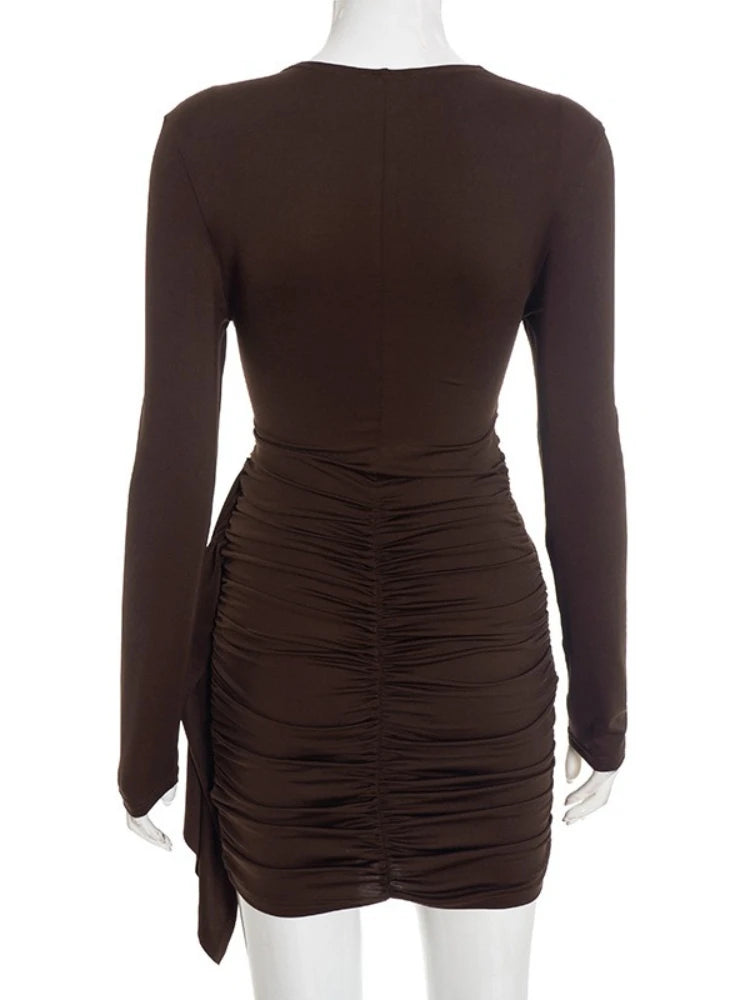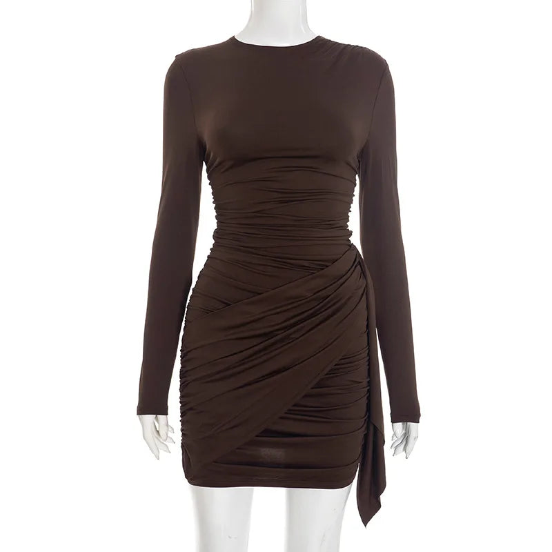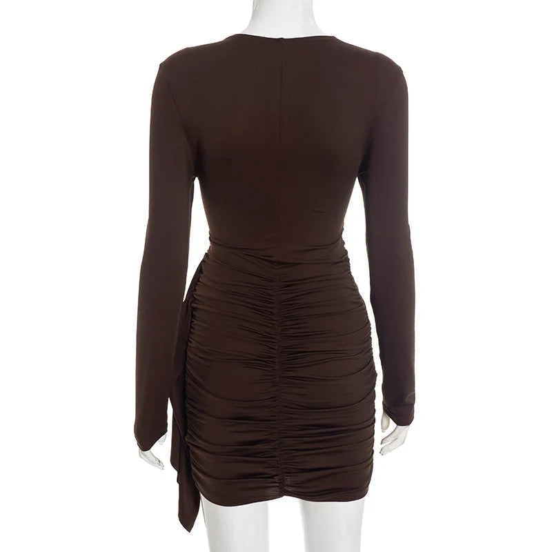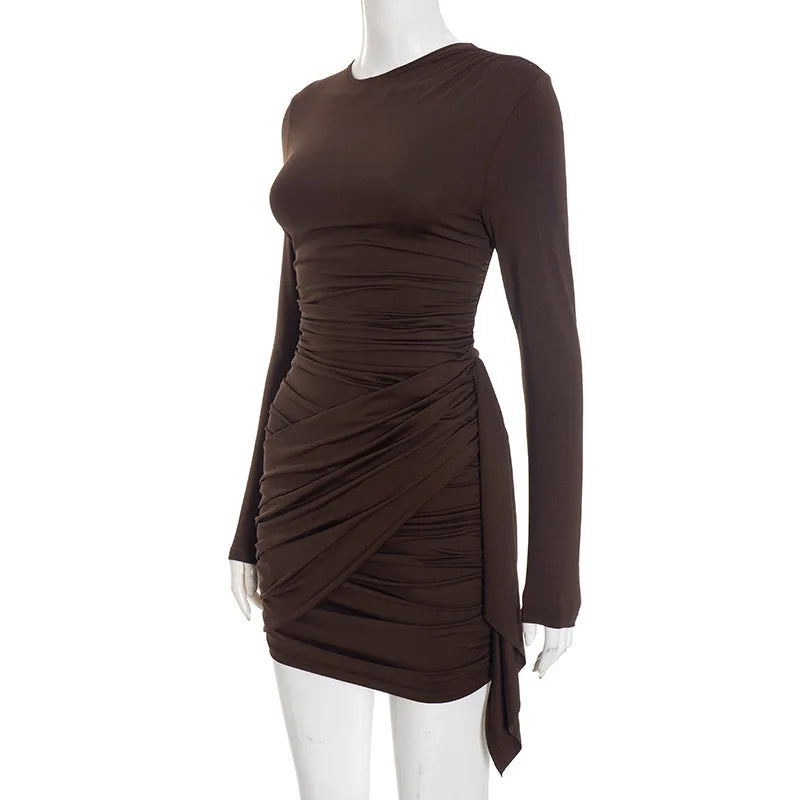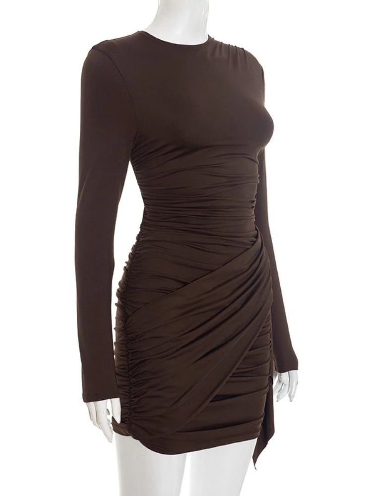 Purpdrank Long Sleeve Ruched Mini Dress Women Fashion Brown O Neck Long Sleeve Slim Bodycon Dress for Daily Office Dating Outfits