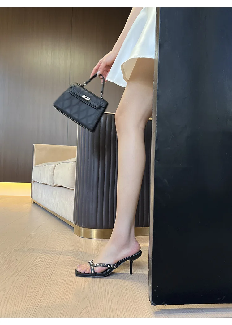 Purpdrank  Low Square Toe High-Heeled Shoes Lady Flock Ladies' Slippers Slipers Women Thin 2025 Rubber Fabric Pumps Slides PU Rome Hoof