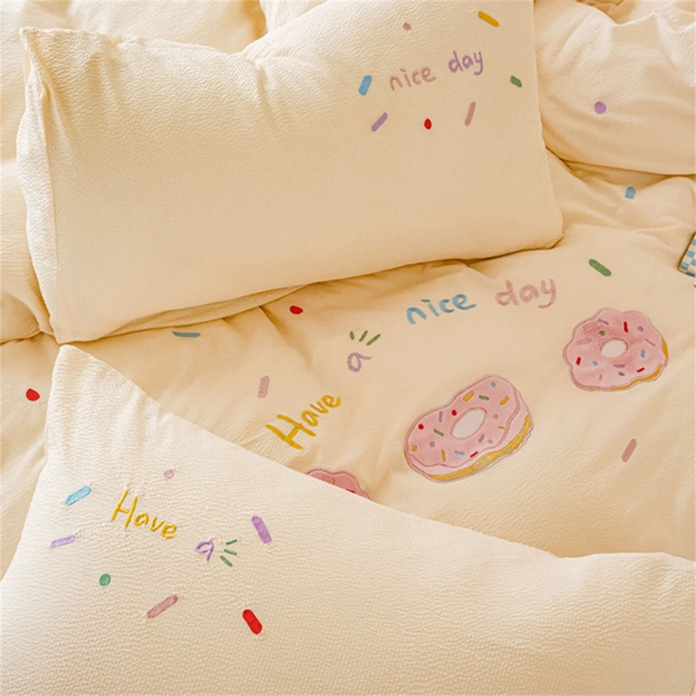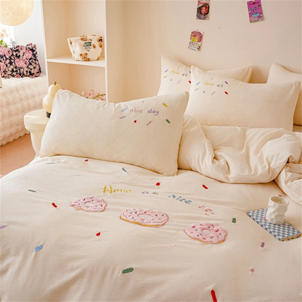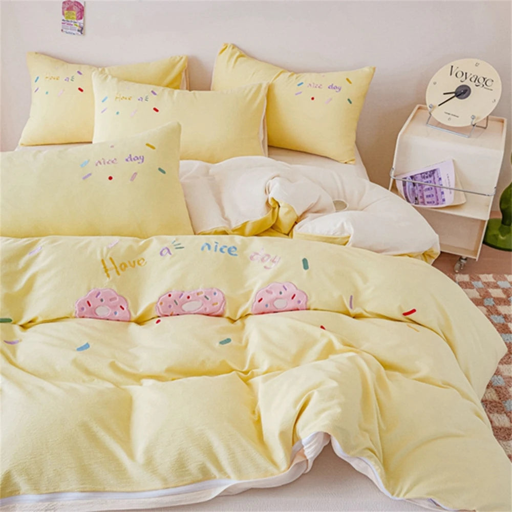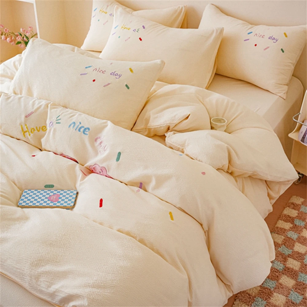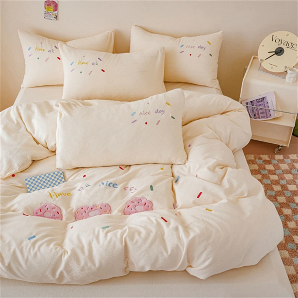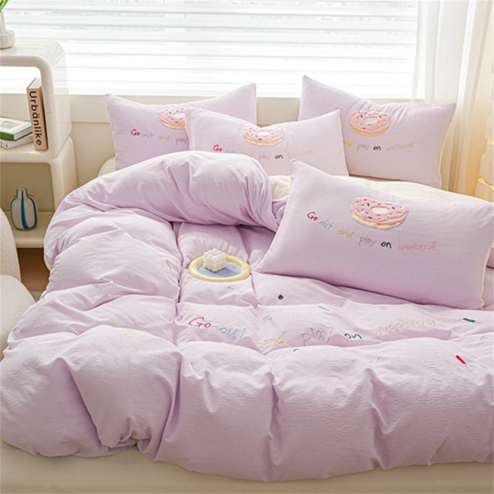 Purpdrank Pink Bedding Sets Solid Color Washed Cotton Home Girls Bedroom Decor Duvet Cover Pillowcase Bedspread Embroidery Four Piece Set