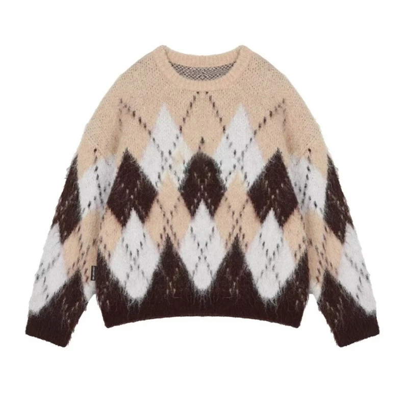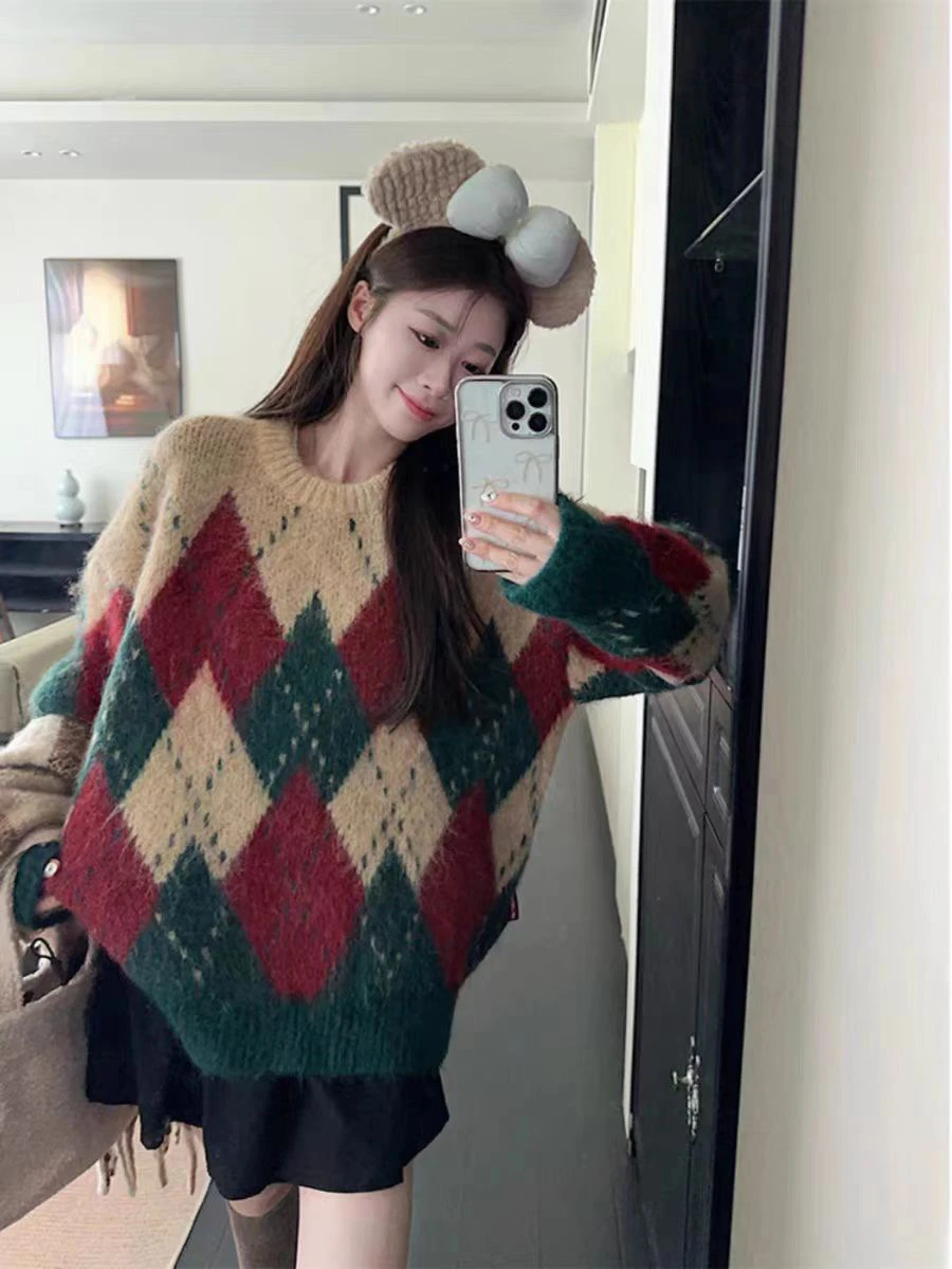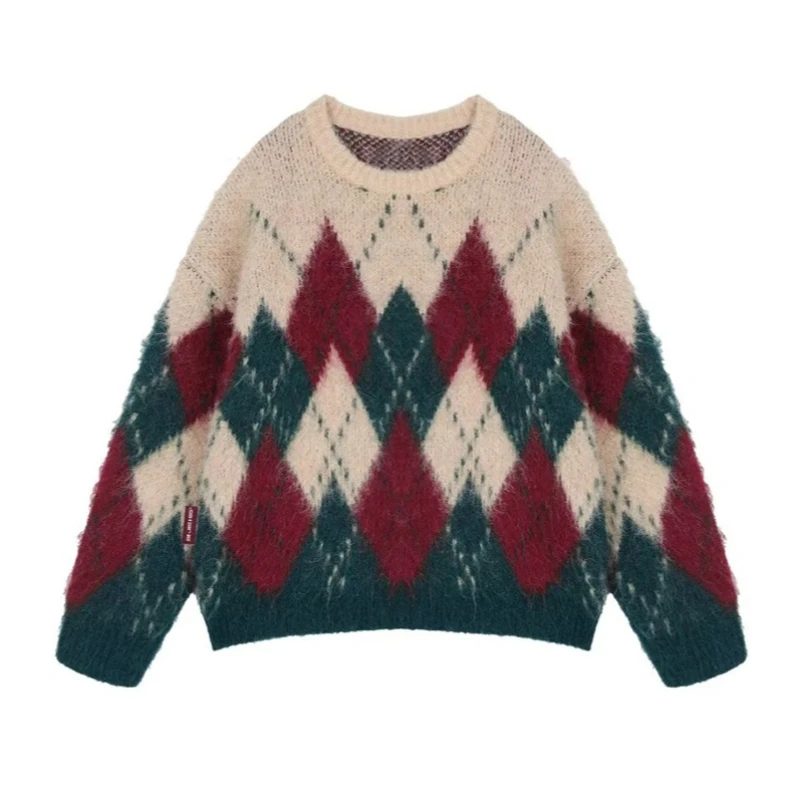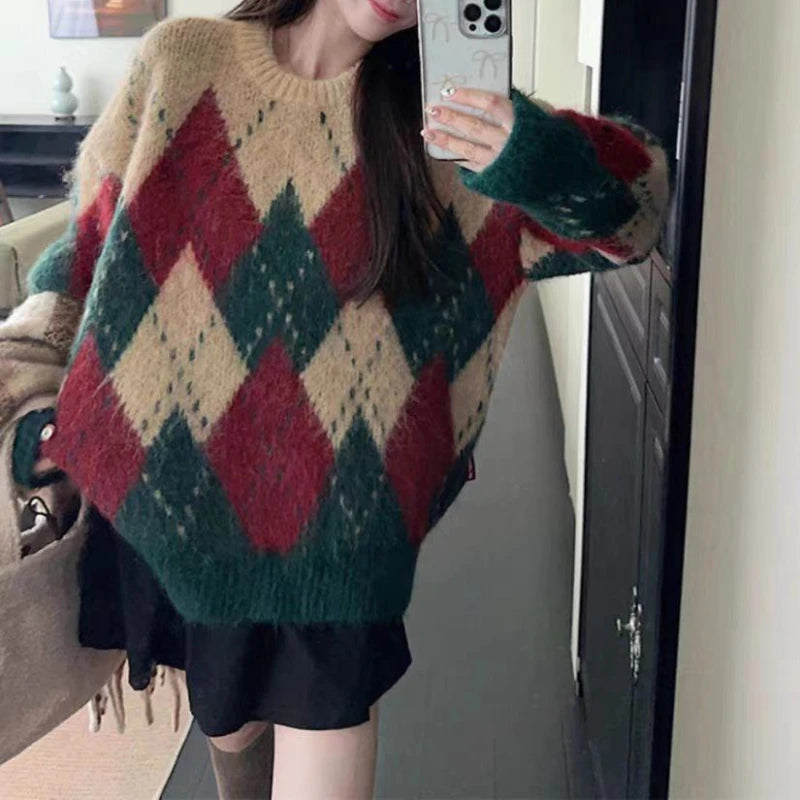 Purpdrank Red Green Argyle Sweater for Women Comfy Knitted Crew Neck Loose-fit Pullovers Female Christmas Sweater Autumn Winter Outfit