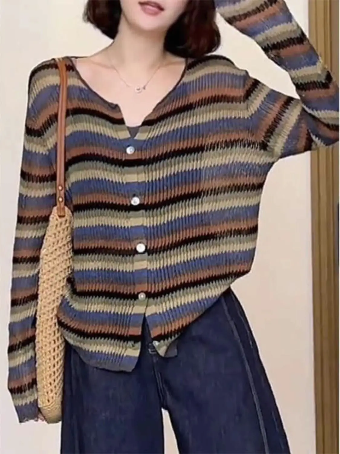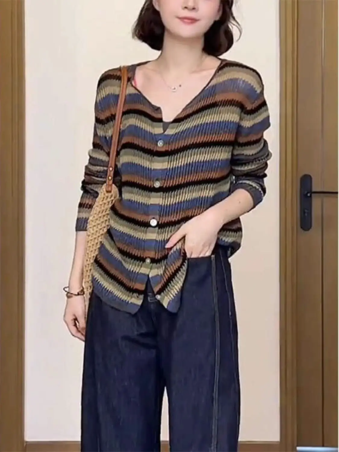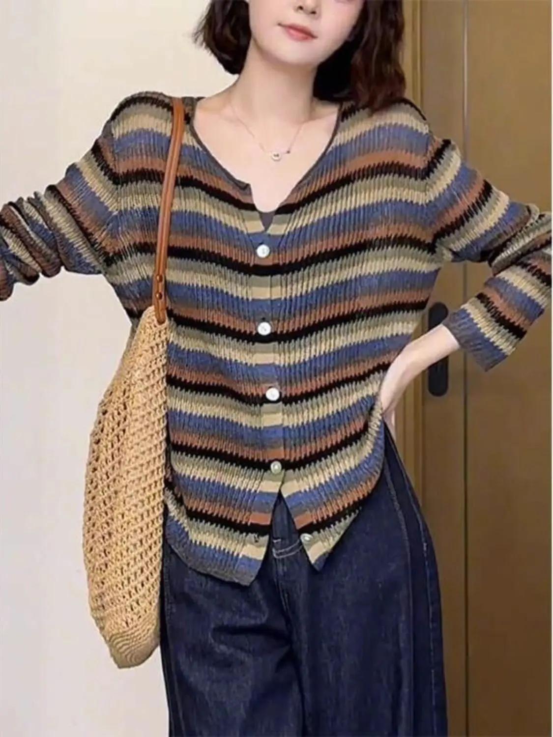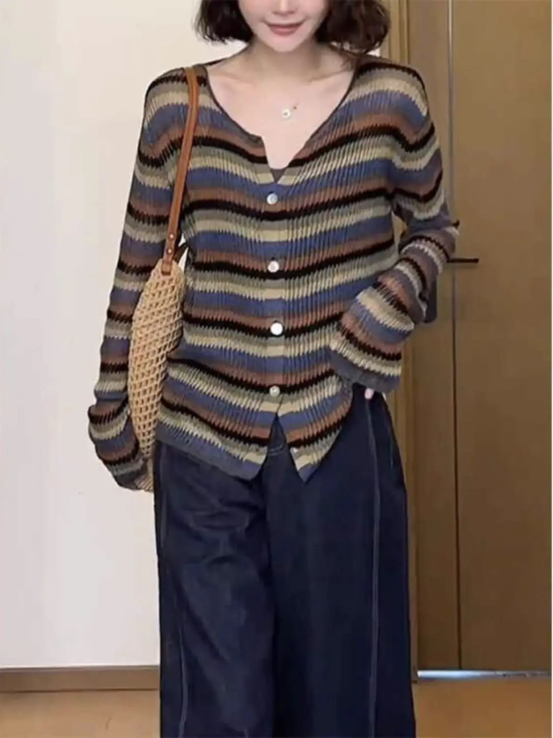 Purpdrank Retro Sweet and Chic Little Shirt New High-end Single Breasted Color Striped Knitted Long Sleeved Top