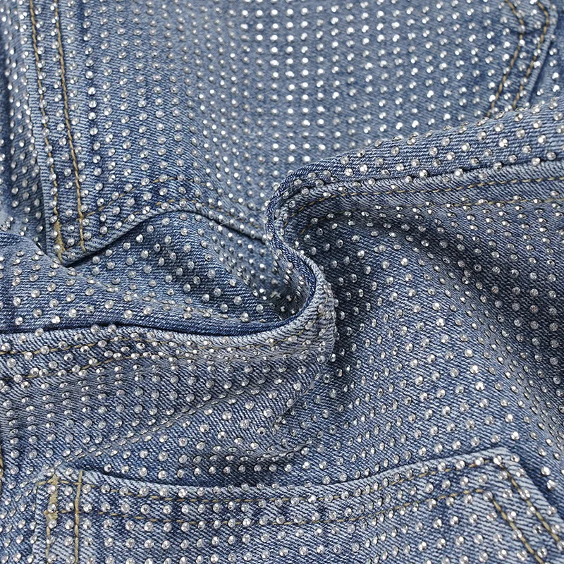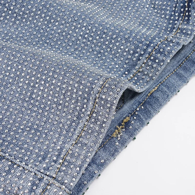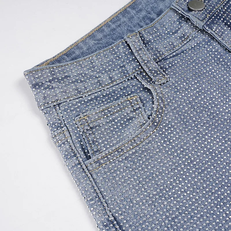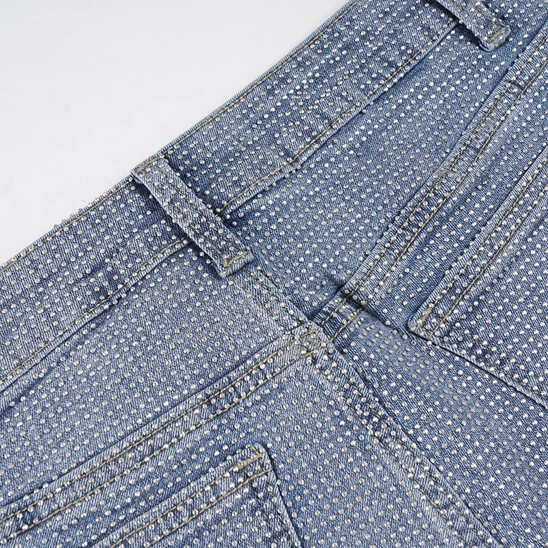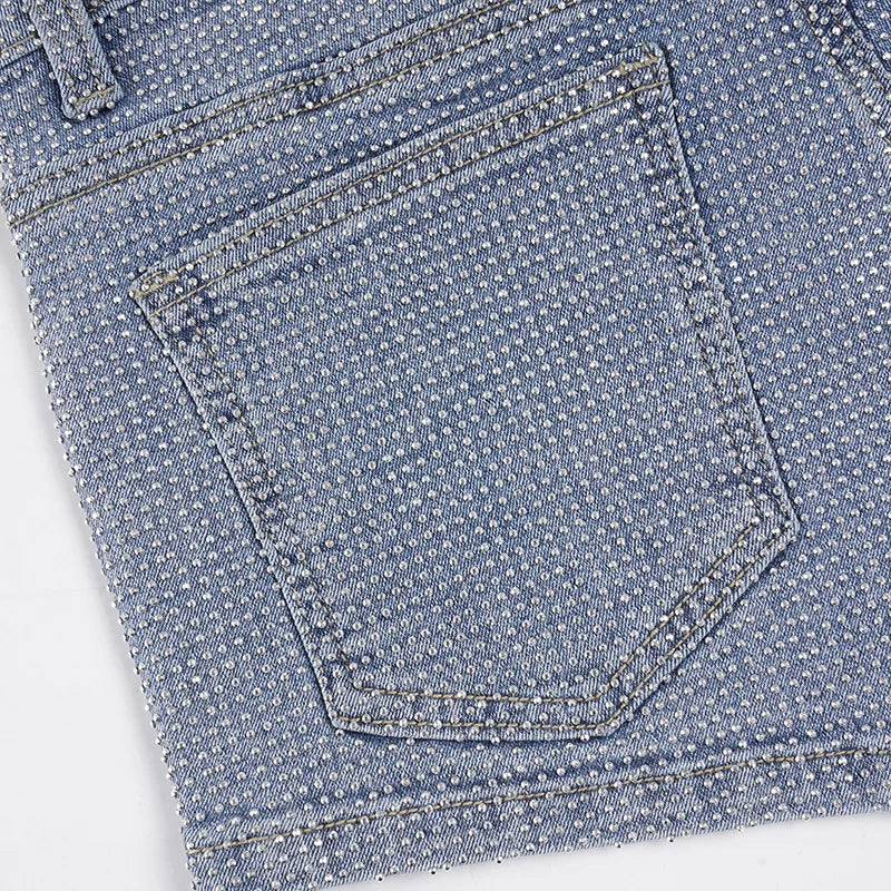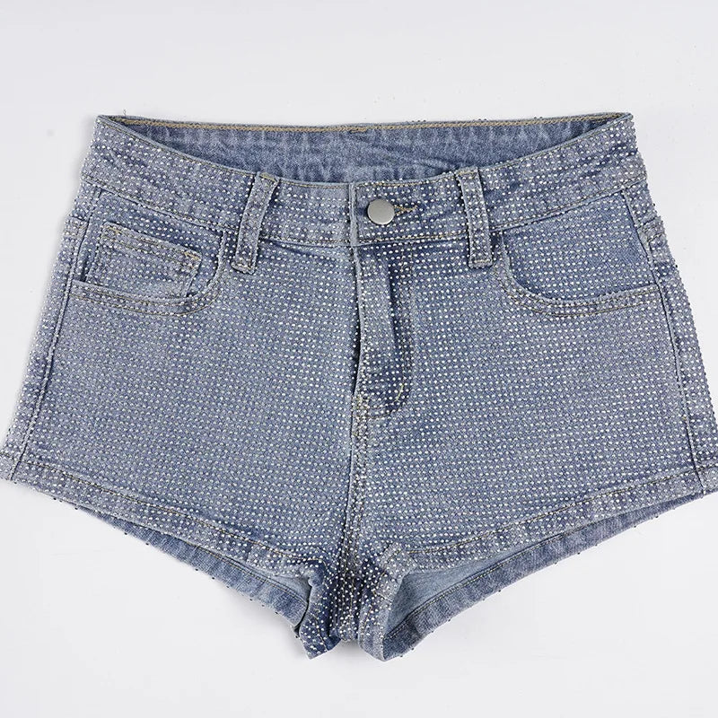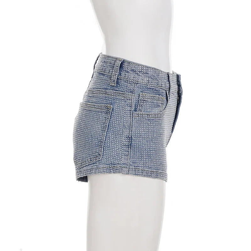 Purpdrank Rhinestone Embellished High-Waist Denim Shorts Vintage Light Blue Slim Stretchy Hot Pants for Women Y2K Street Clubwear