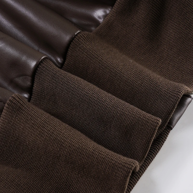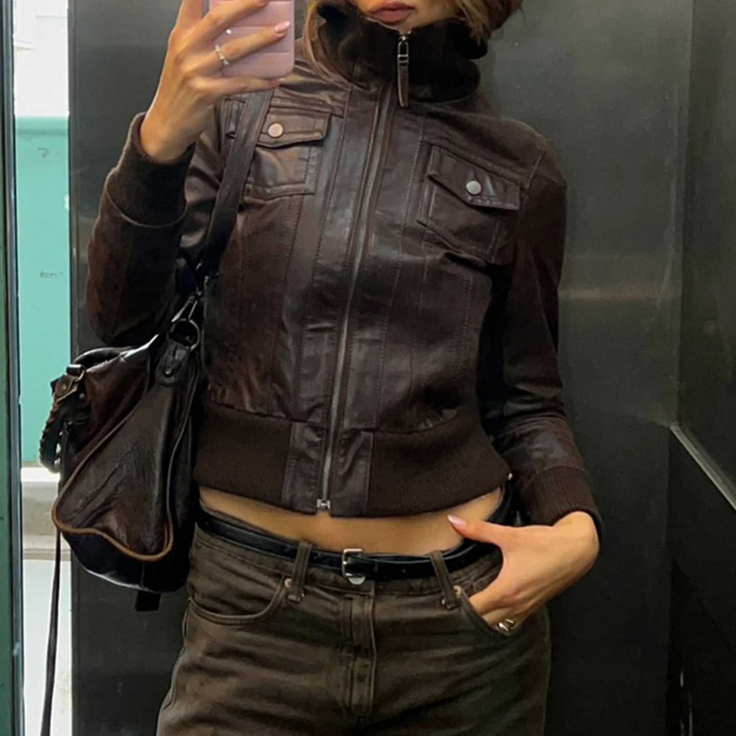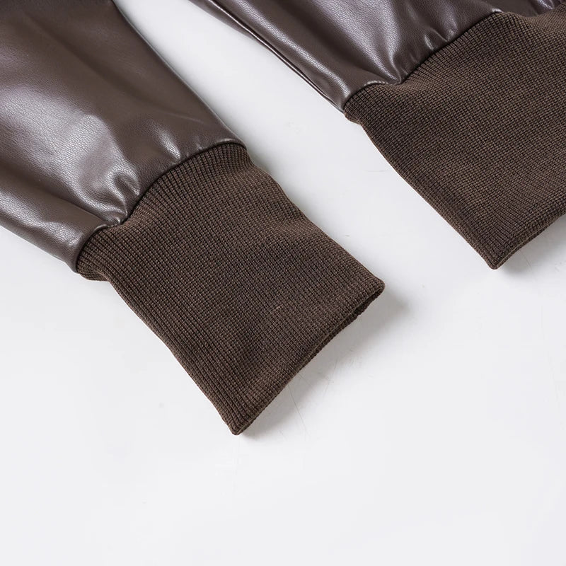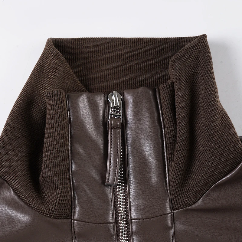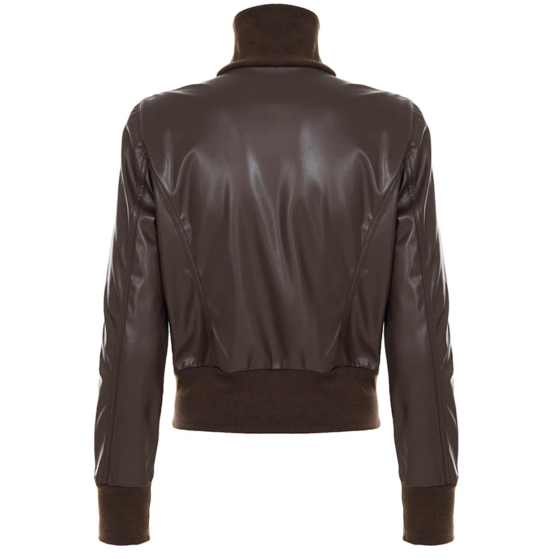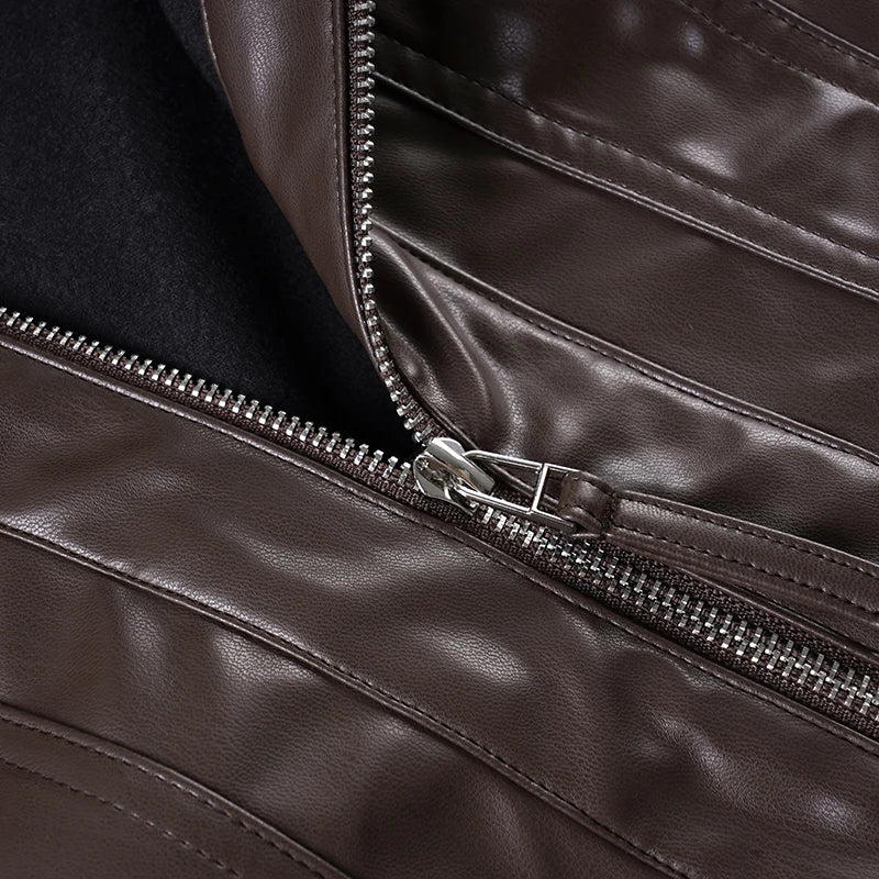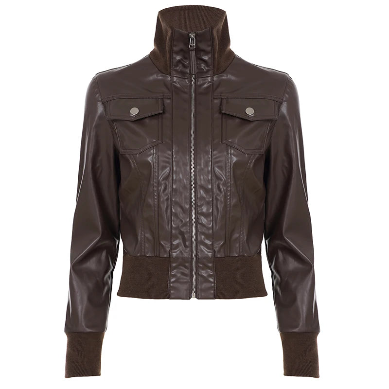 Purpdrank Safari Style Pu Leather Jacket Slim-Fitting Pockets Turtleneck Zip-Up Long Sleeve Coats Women Autumn Winter Y2K Streetwear