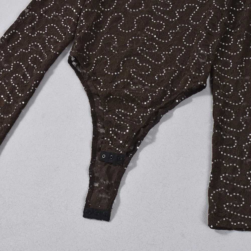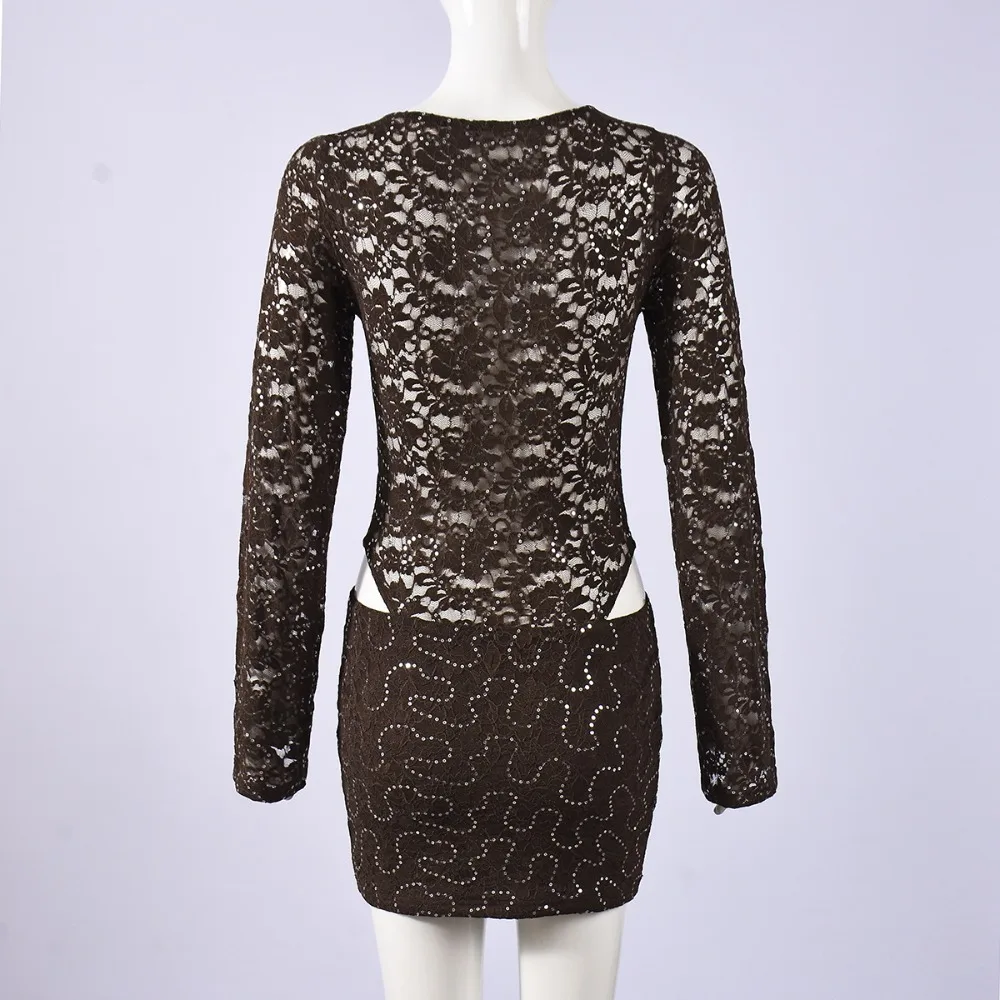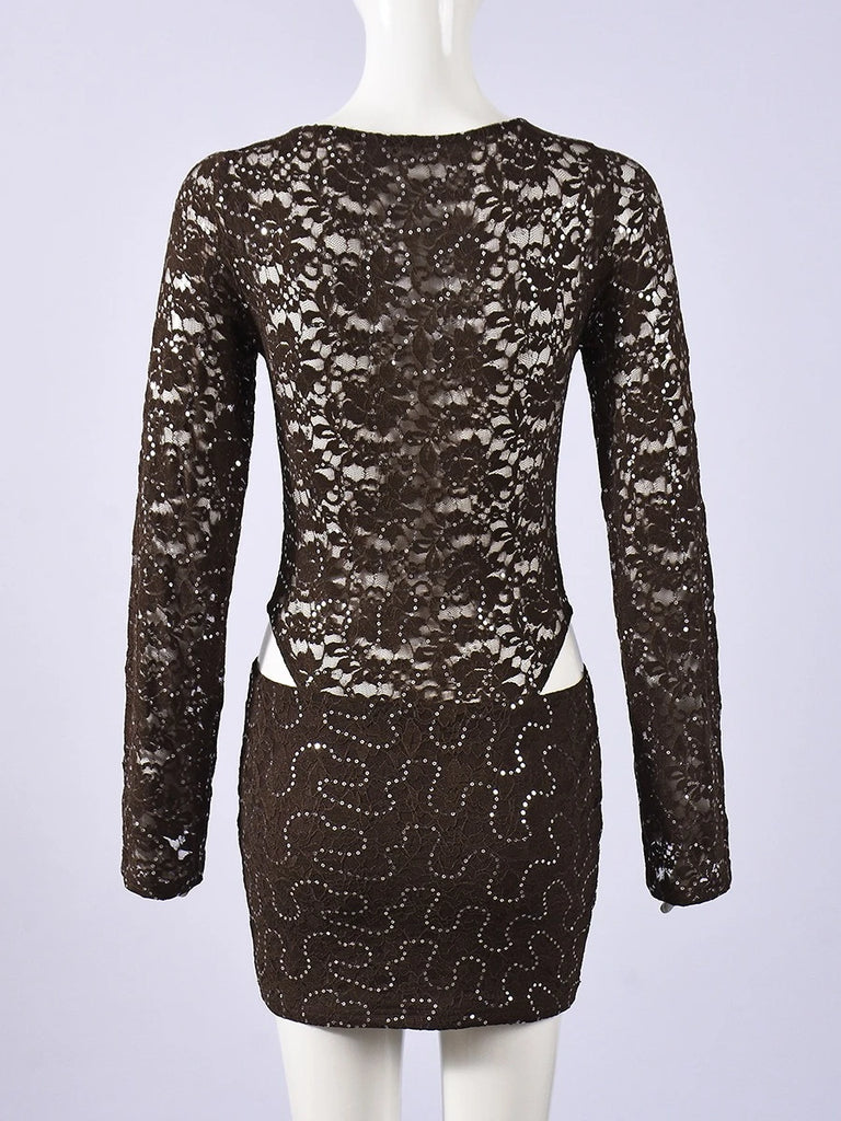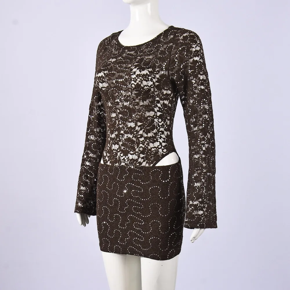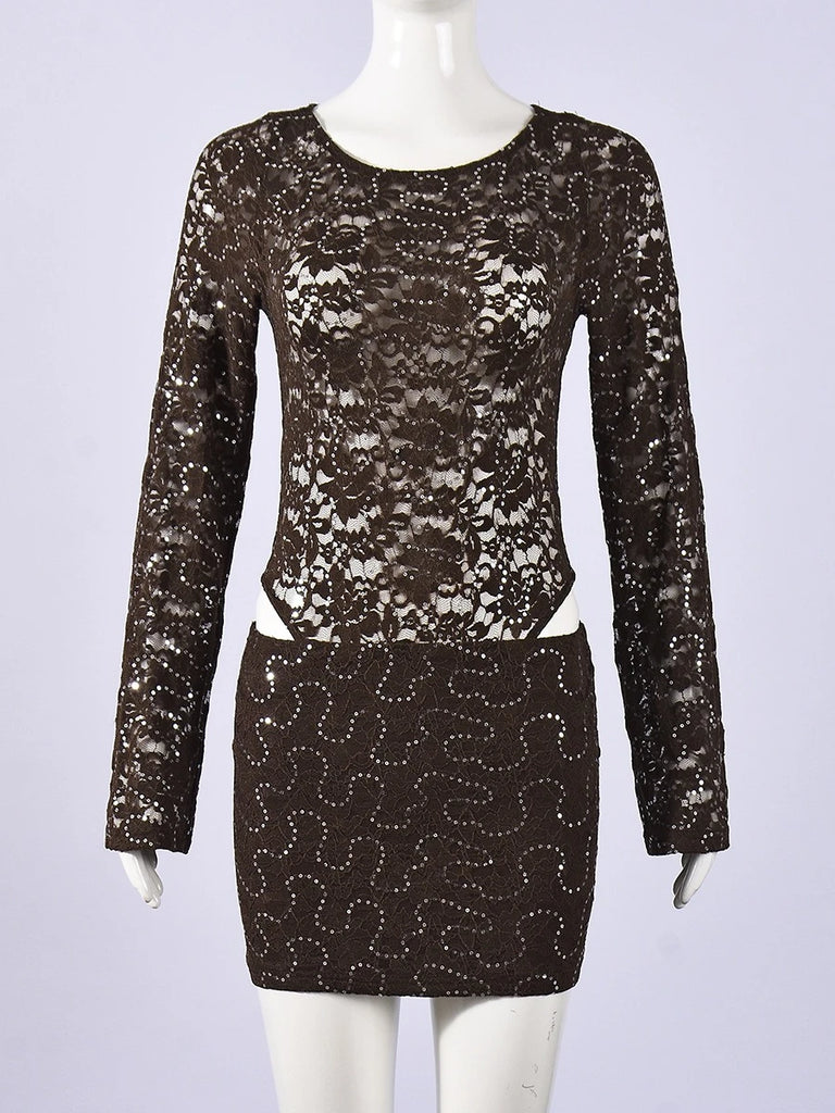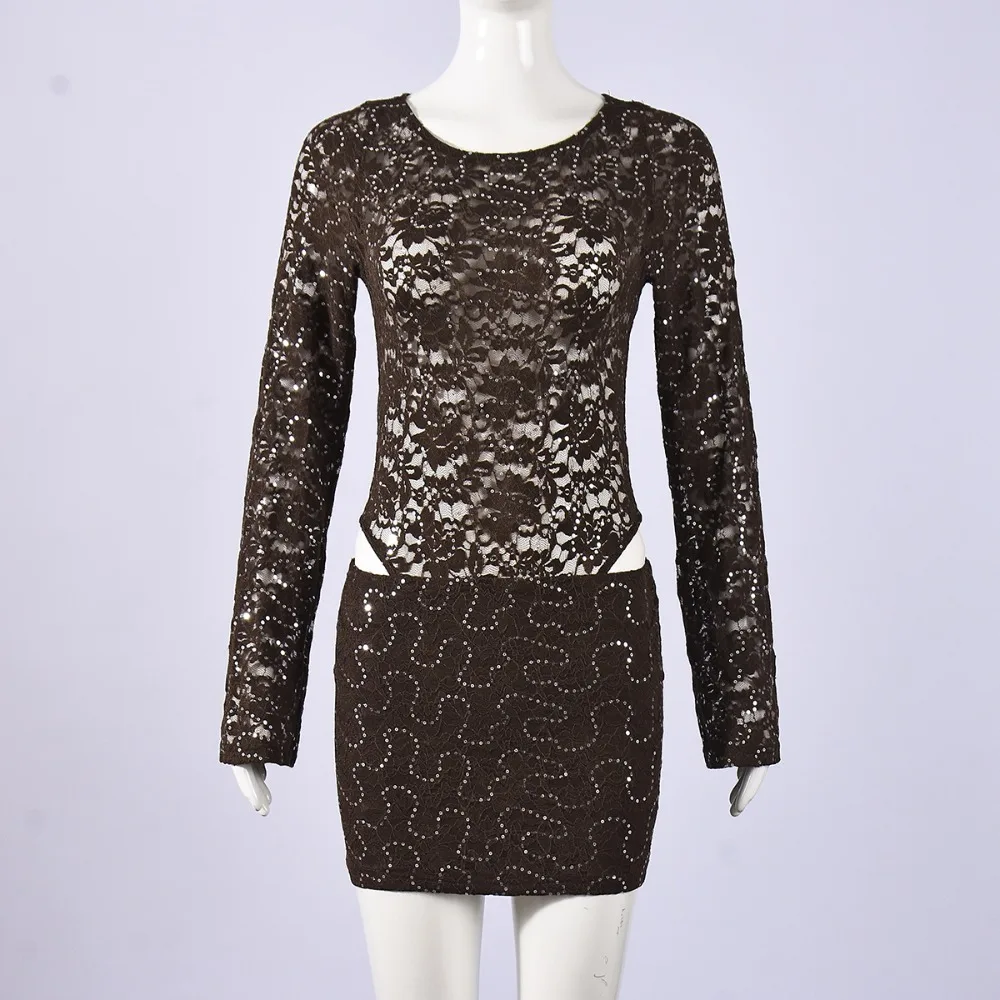Purpdrank  Sexy Bodycon Lace & Sequin 2 Piece Set for Women Fashion O Neck Long Sleeve Bodysuit and Mini Pencil Skirt Matching Outfit