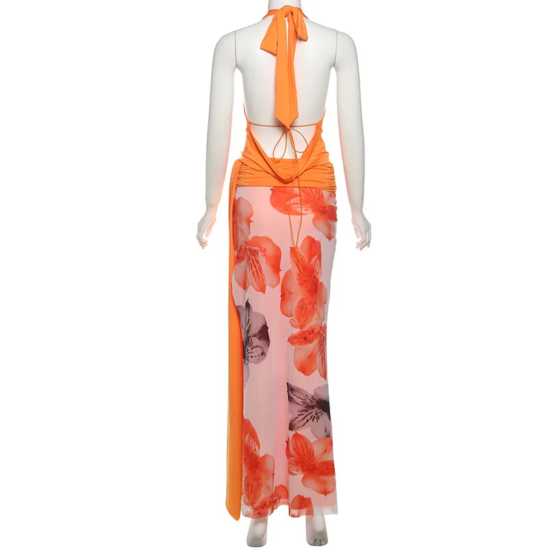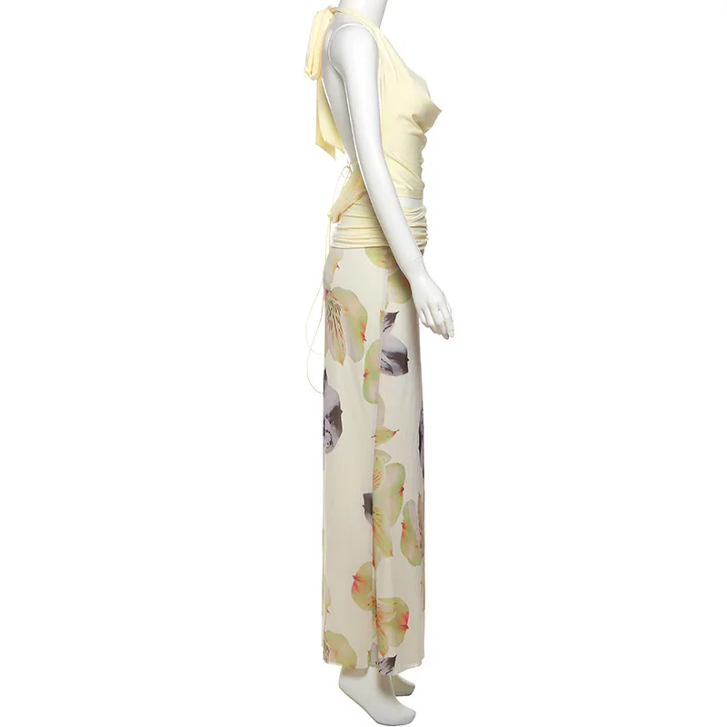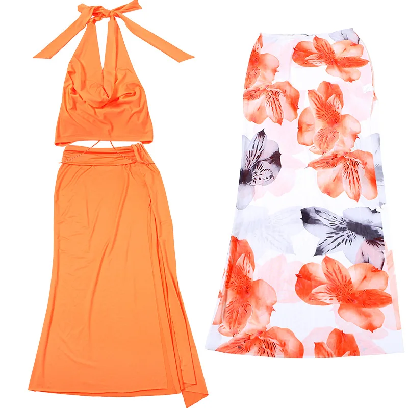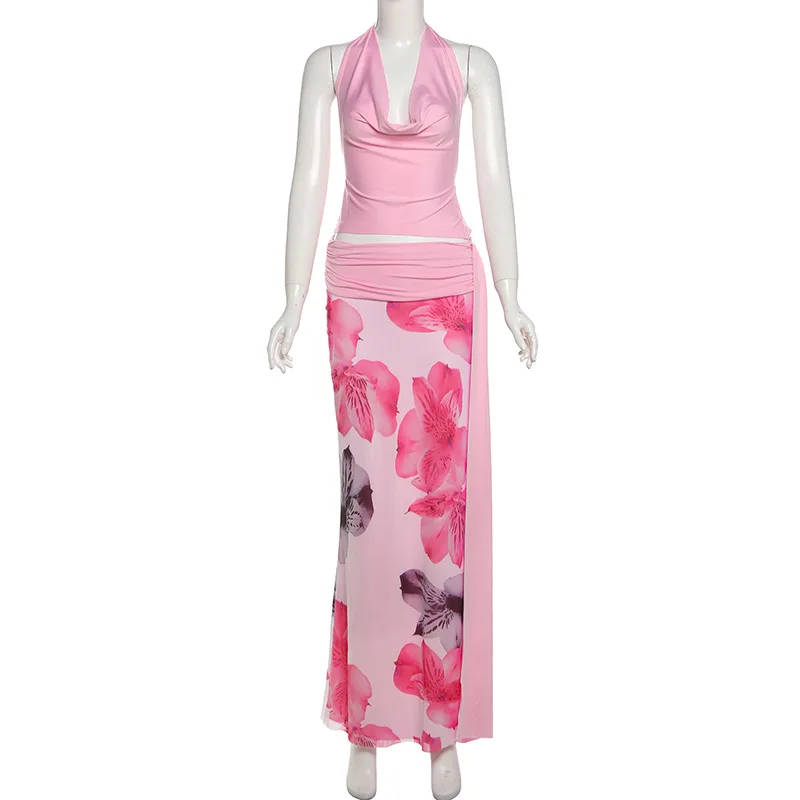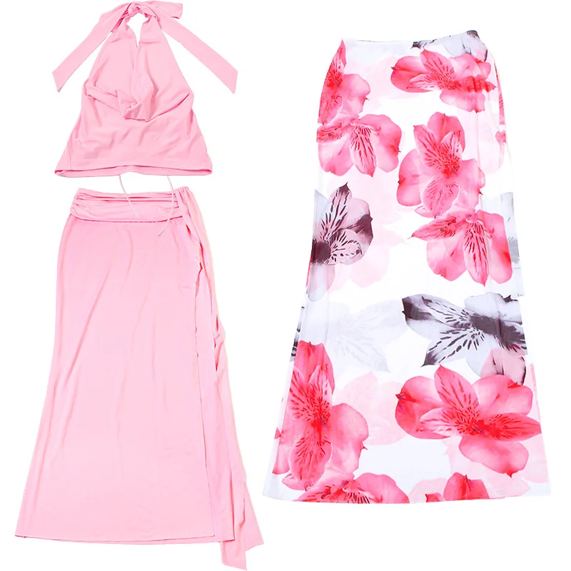 Purpdrank Sexy Halter Three Piece Women Summer Dress Sets 2025 Fashion Swinging Collar Backless Cropped Top and Print Floral Long Skirts