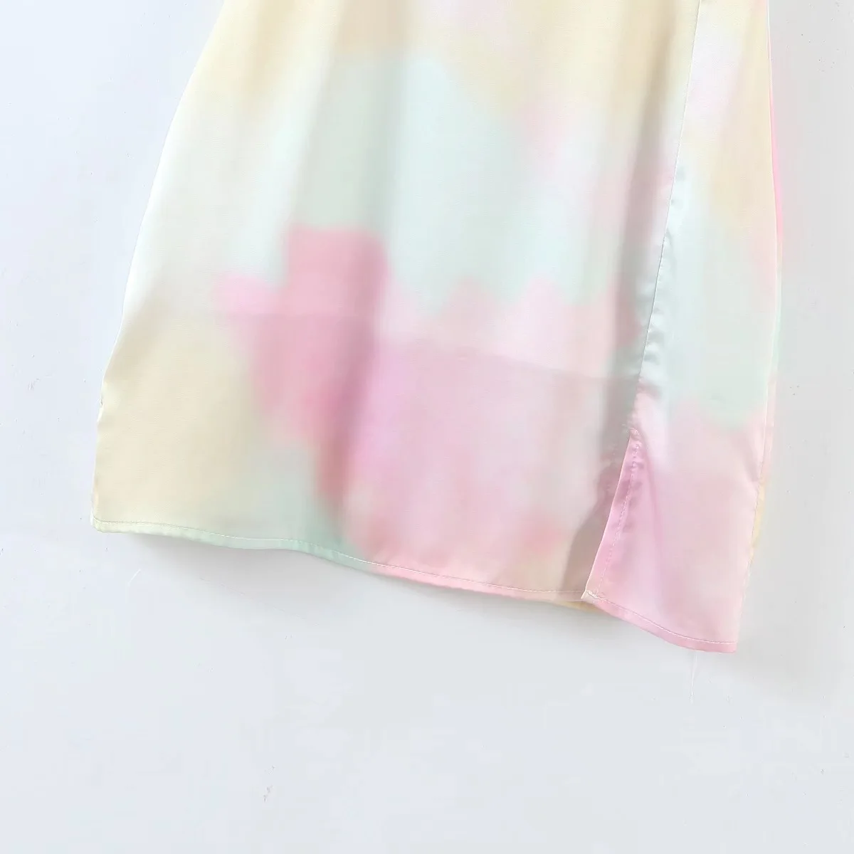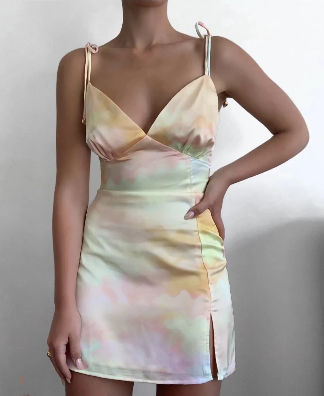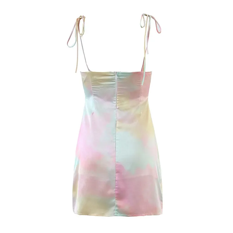 Purpdrank Sexy Tie Dye Print Satin Sling Dress Women Bandage Lacing up Strap Slit Short Mini Party Robe