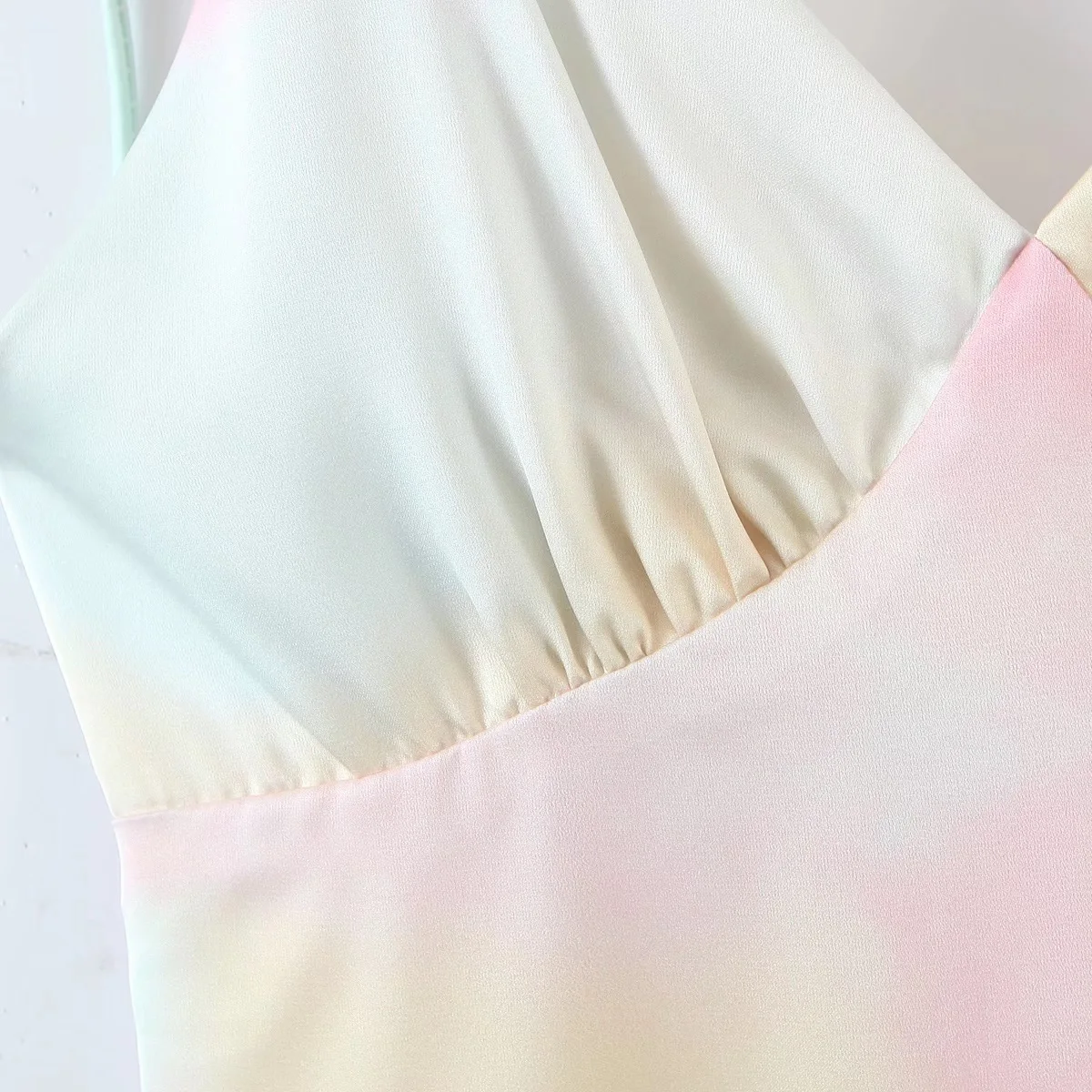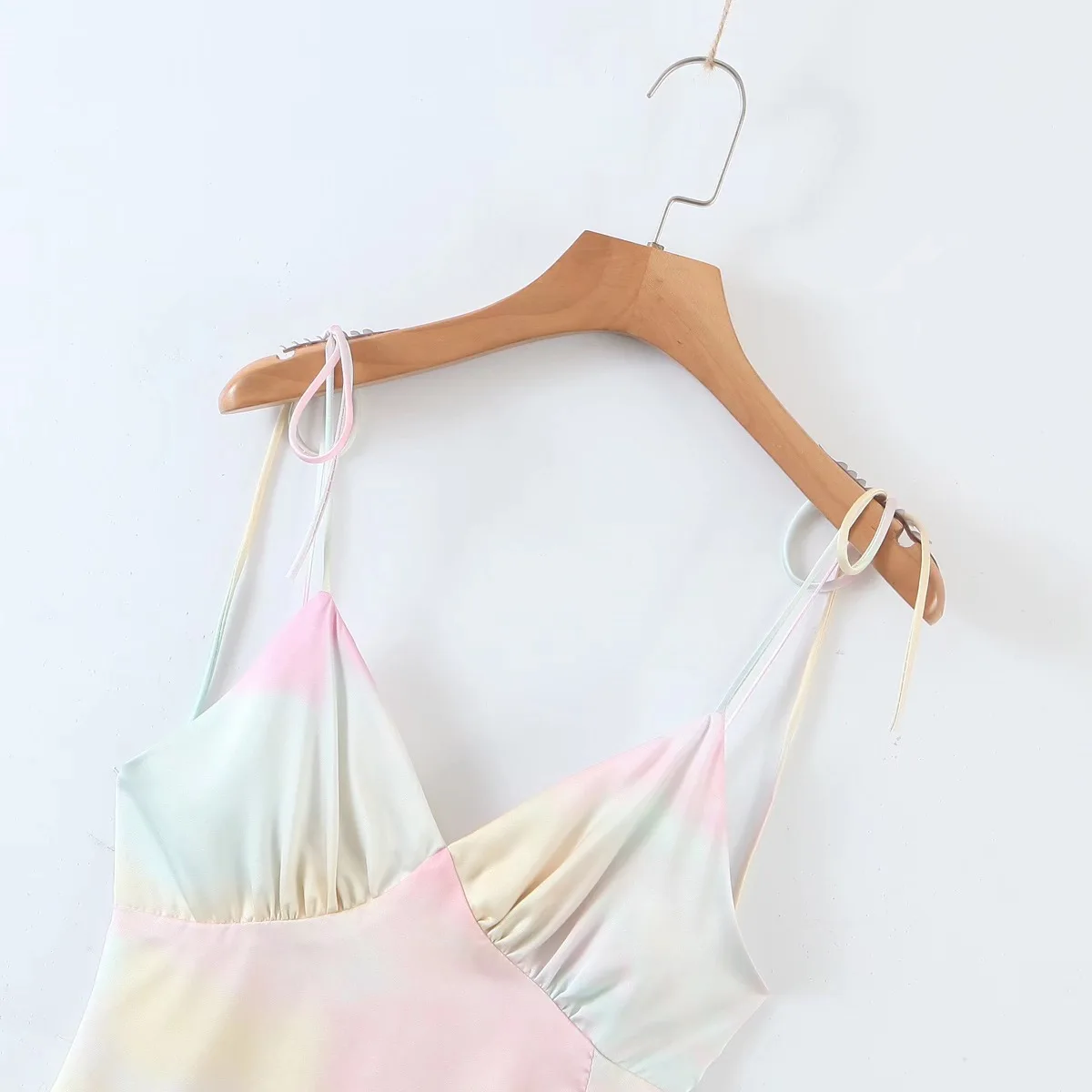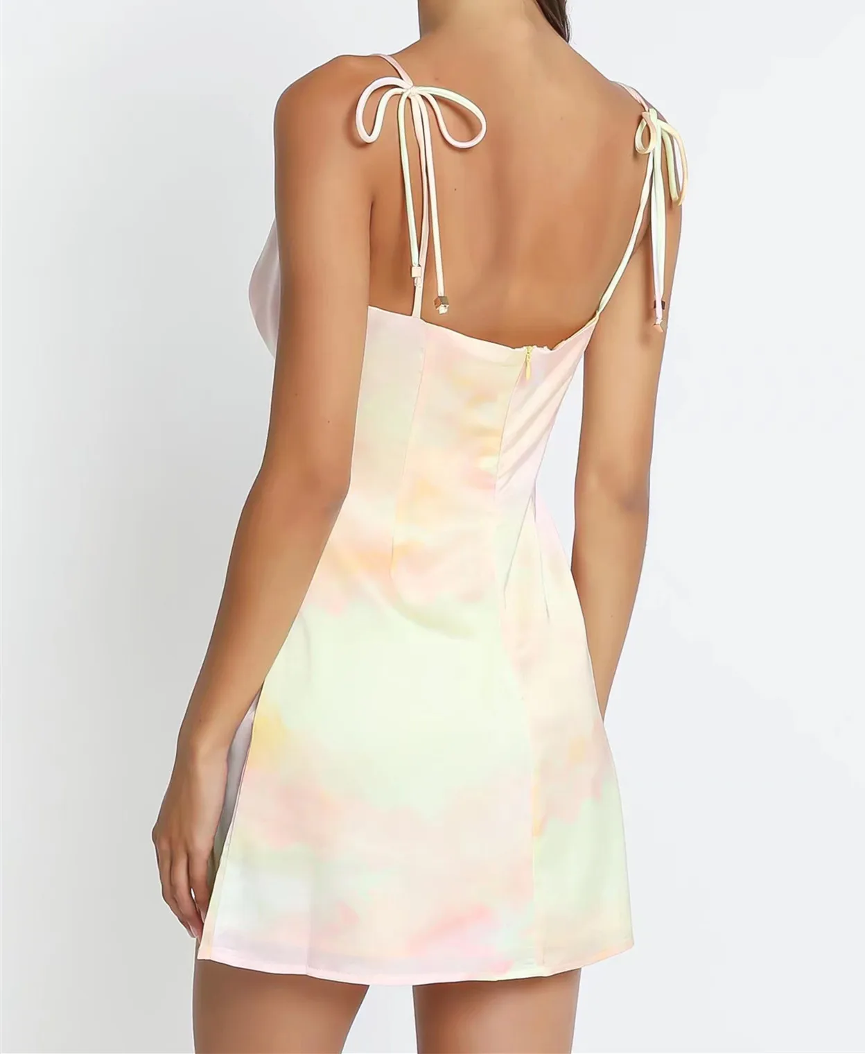 Purpdrank Sexy Tie Dye Print Satin Sling Dress Women Bandage Lacing up Strap Slit Short Mini Party Robe