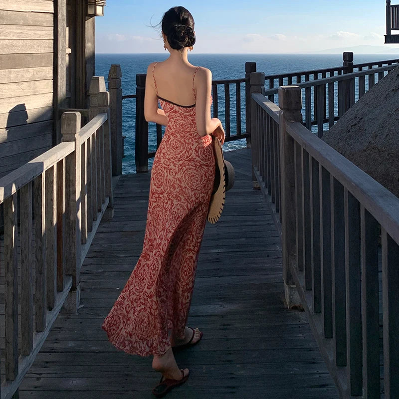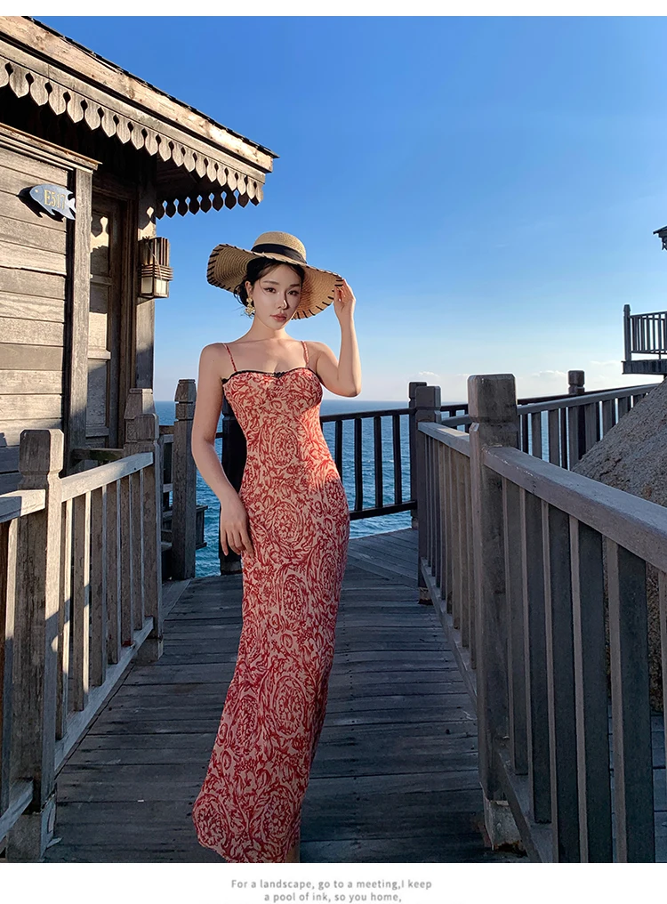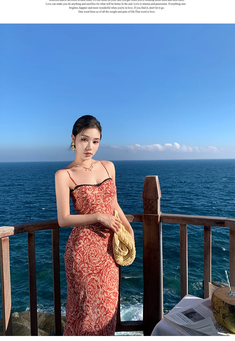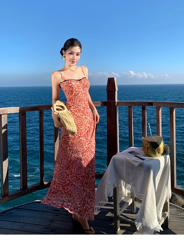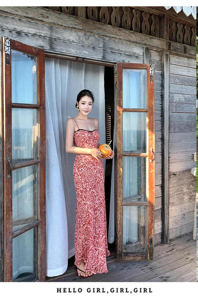 Purpdrank Slightly Tipsy Rum Lace Color-Block Floral Strap Long Dress for Women Summer Slim Fit