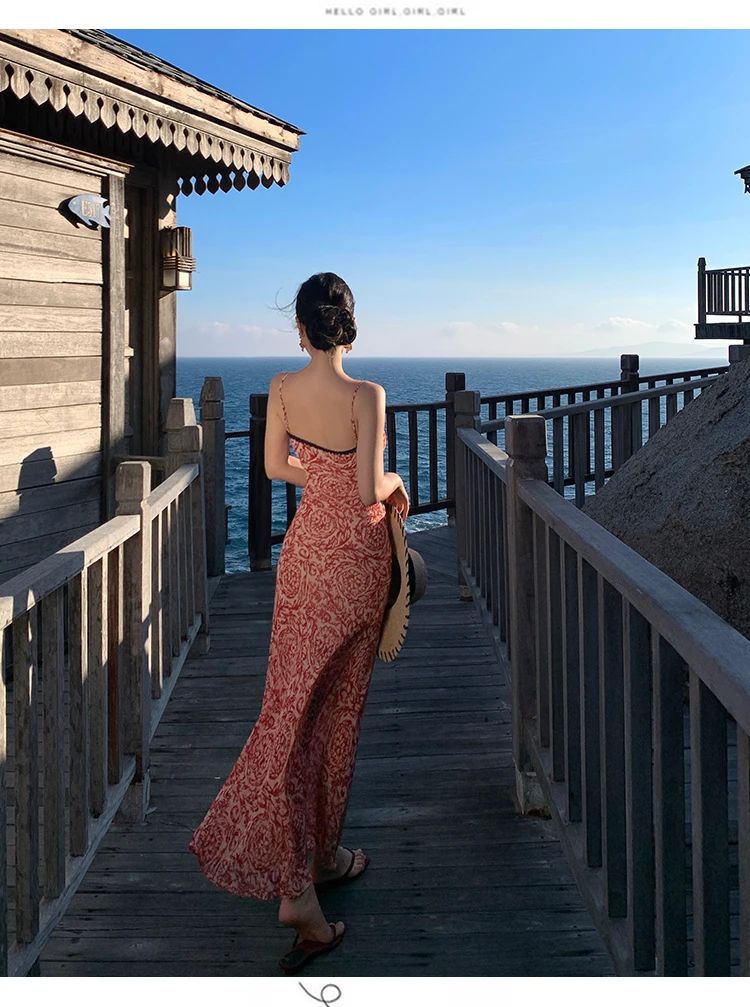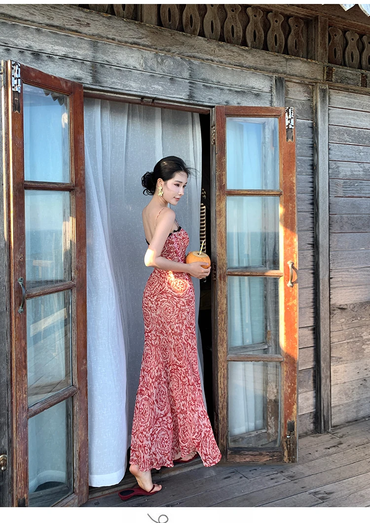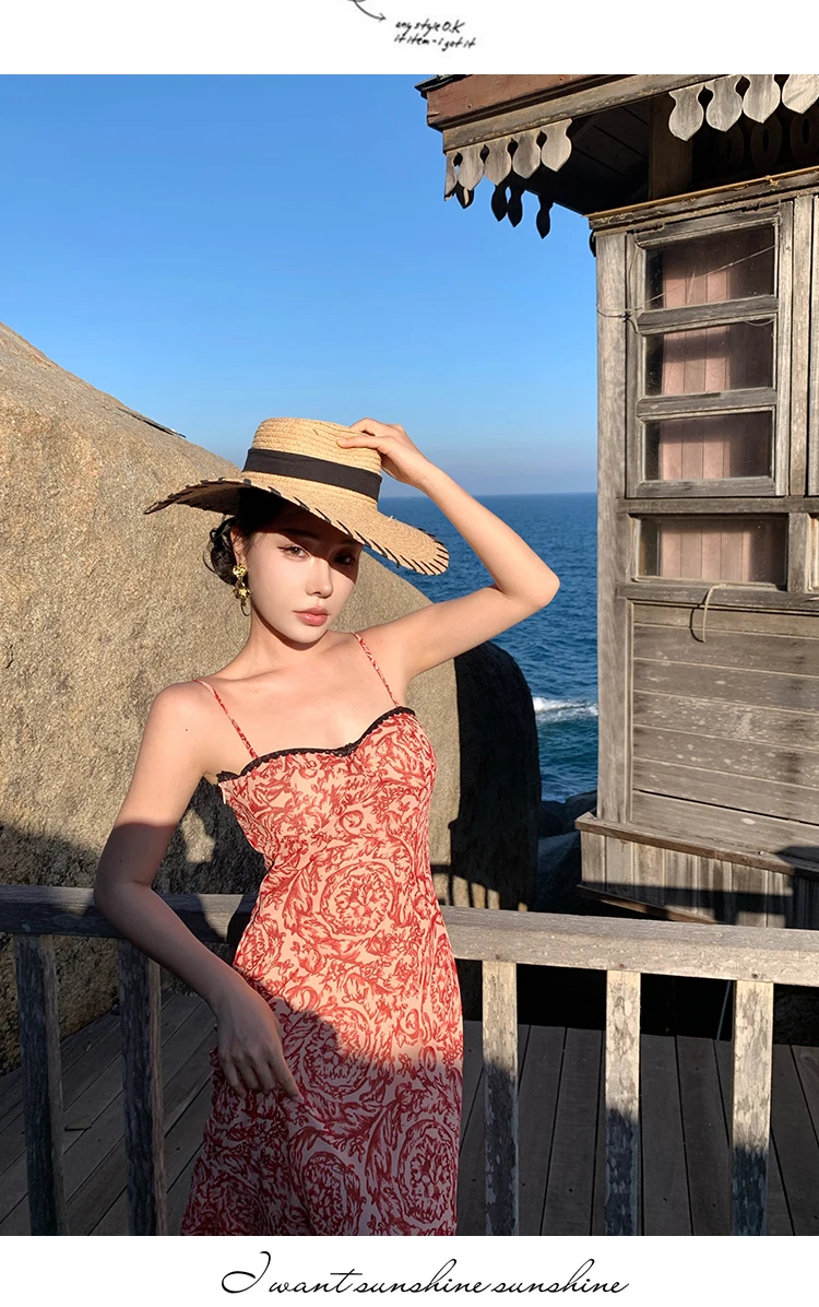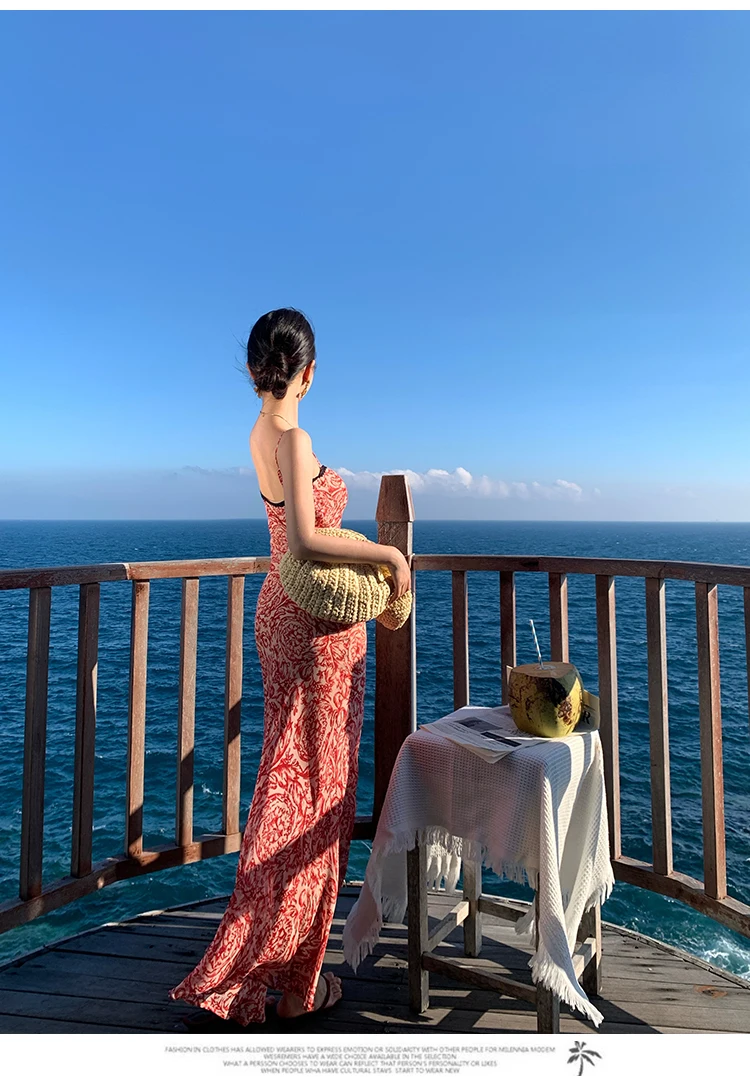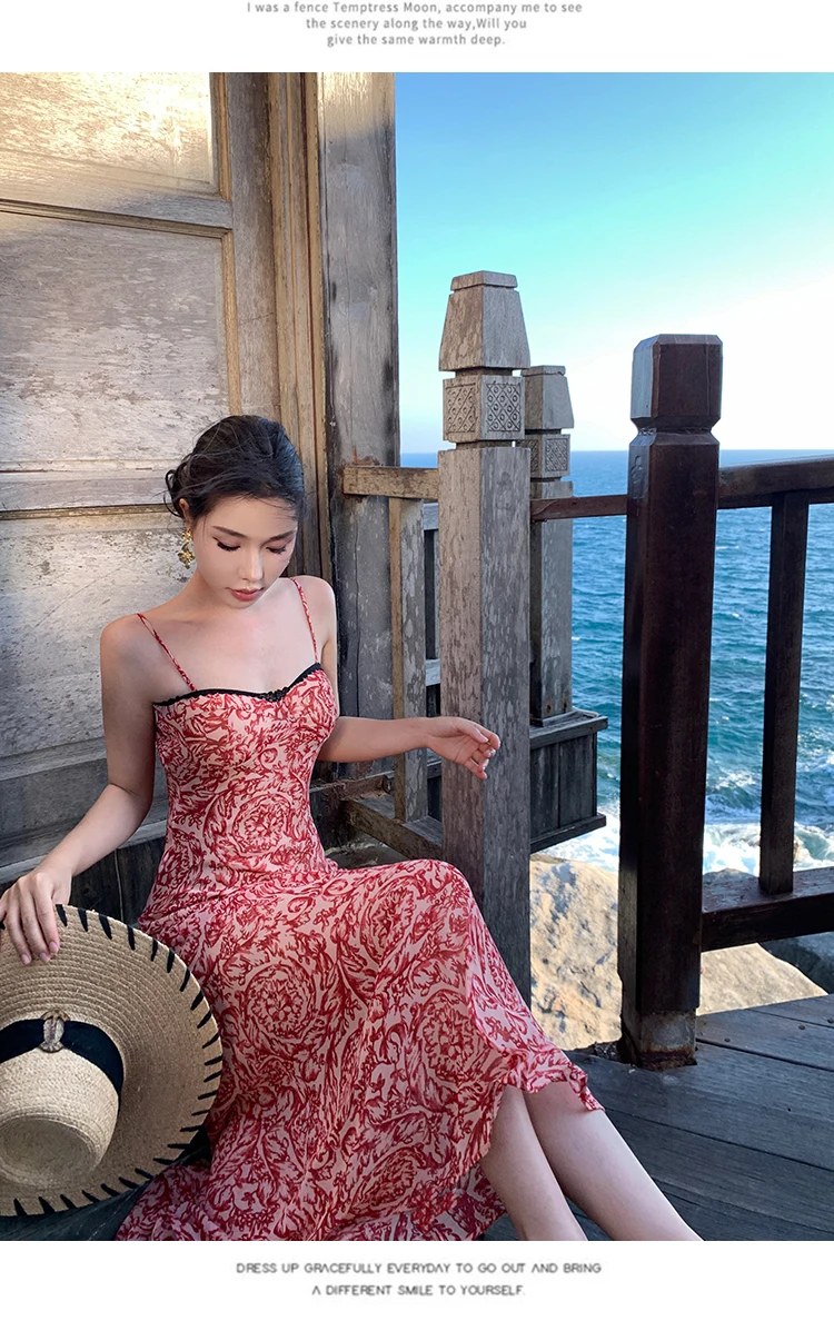 Purpdrank Slightly Tipsy Rum Lace Color-Block Floral Strap Long Dress for Women Summer Slim Fit