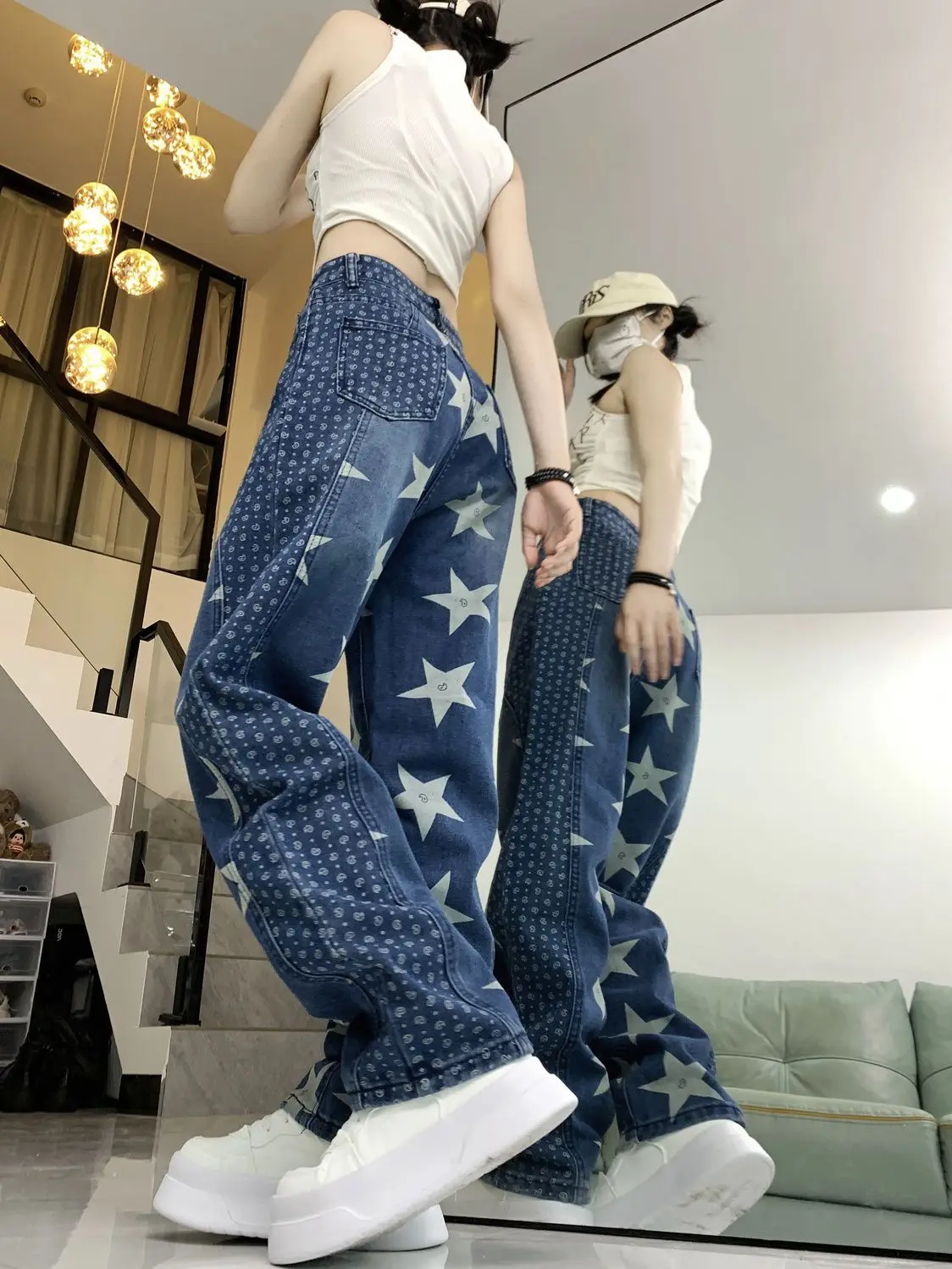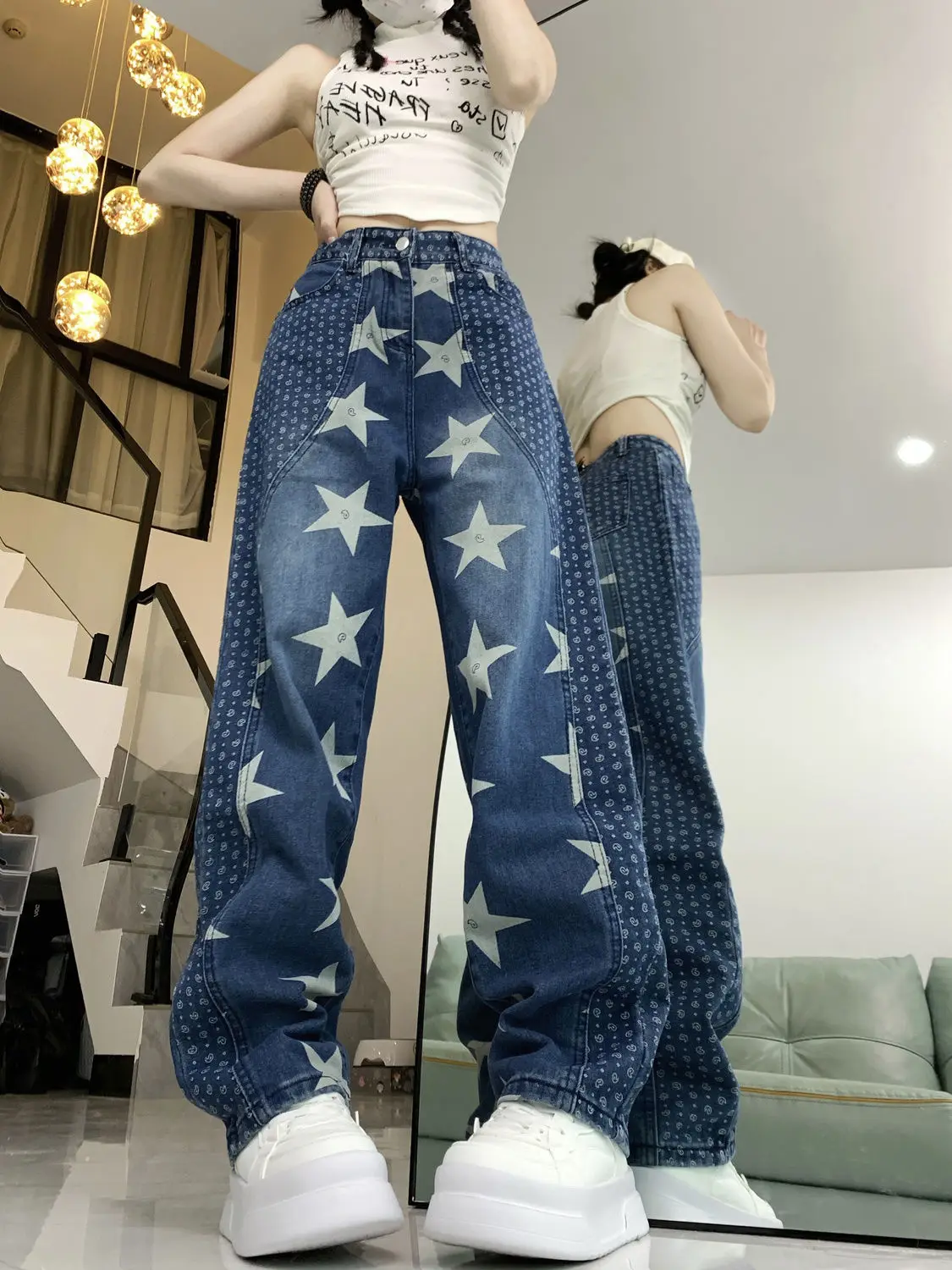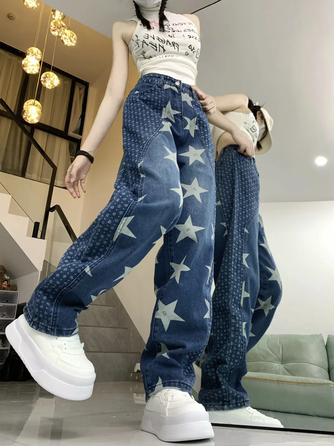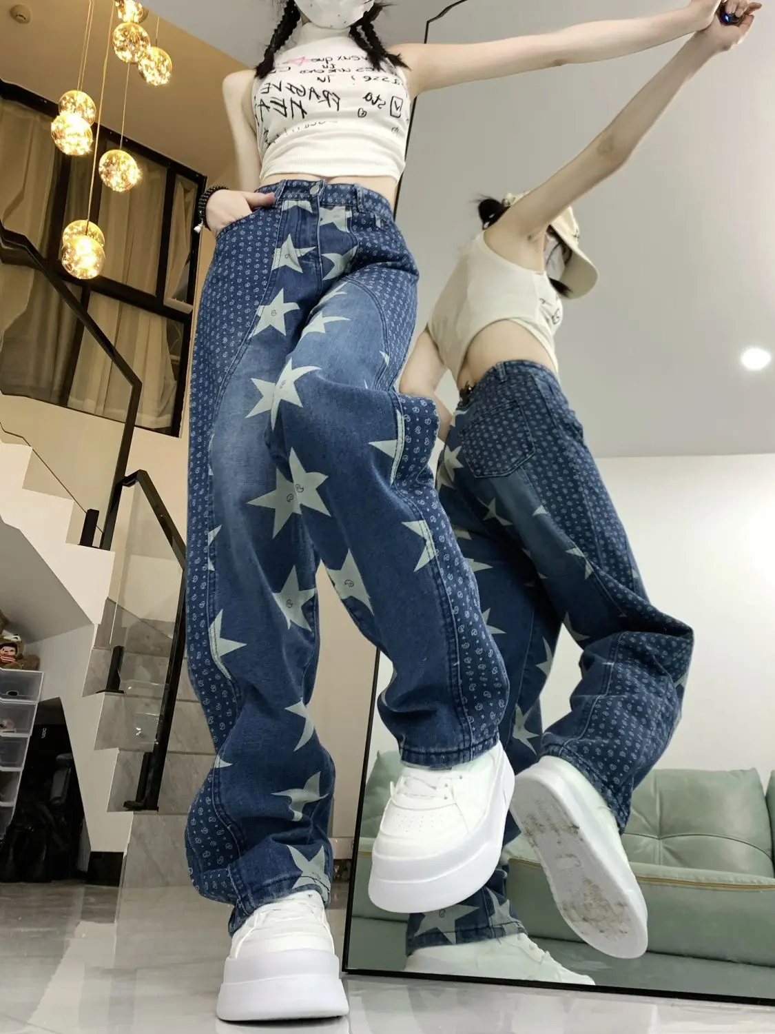 Purpdrank Splicing Star Print Design American High Street Jeans Women's Niche Loose Straight Leg Pants